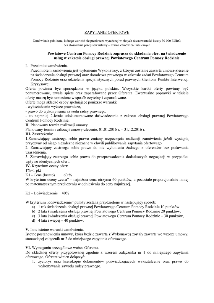 ZAPYTANIE OFERTOWE Zamówienie publiczne, którego wartość nie przekracza wyrażonej w złotych równowartości kwoty 30 000 EURO, bez stosowania przepisów ustawy – Prawo Zamówień Publicznych Powiatowe Centrum Pomocy Rodzinie zaprasza do składania ofert na świadczenie usług w zakresie obsługi prawnej Powiatowego Centrum Pomocy Rodzinie I. Przedmiot zamówienia. Przedmiotem zamówienia jest wyłonienie Wykonawcy, z którym zostanie zawarta umowa-zlecenie na świadczenie obsługi prawnej oraz doradztwa prawnego w zakresie zadań Powiatowego Centrum Pomocy Rodzinie oraz udzielenia specjalistycznych porad prawnych klientom Punktu Interwencji Kryzysowej. Oferta powinna być sporządzona w języku polskim. Wszystkie kartki oferty powinny być ponumerowane, trwale spięte oraz zaparafowane przez Oferenta. Ewentualne poprawki w tekście oferty muszą być naniesione w sposób czytelny i zaparafowane. Ofertę mogą składać osoby spełniające poniższe warunki: - wykształcenie wyższe prawnicze, - prawo do wykonywania zawodu radcy prawnego, - co najmniej 2-letnie udokumentowane doświadczenie z zakresu obsługi prawnej Powiatowego Centrum Pomocy Rodzinie, II. Planowany termin realizacji umowy Planowany termin realizacji umowy-zlecenie: 01.01.2016 r. – 31.12.2016 r. III. Zastrzeżenia: 1.Zamawiający zastrzega sobie prawo zmiany rozpoczęcia realizacji zamówienia jeżeli wystąpią przyczyny od niego niezależne nieznane w chwili publikowania zapytania ofertowego. 2. Zamawiający zastrzega sobie prawo do nie wyłonienia żadnego z oferentów bez podawania uzasadnienia. 3. Zamawiający zastrzega sobie prawo do przeprowadzenia dodatkowych negocjacji w przypadku wpływu identycznych ofert. IV. Kryterium oceny ofert: 1%=1 pkt K1 - Cena (brutto) 60 % W kryterium oceny „cena” – najniższa cena otrzyma 60 punktów, a pozostałe proporcjonalnie mniej po matematycznym przeliczeniu w odniesieniu do ceny najniższej. K2 - Doświadczenie 40% W kryterium „doświadczenie” punkty zostaną przydzielone w następujący sposób: a) 1 rok świadczenia obsługi prawnej Powiatowego Centrum Pomocy Rodzinie 10 punktów b) 2 lata świadczenia obsługi prawnej Powiatowego Centrum Pomocy Rodzinie 20 punktów, c) 3 lata świadczenia obsługi prawnej Powiatowego Centrum Pomocy Rodzinie – 30 punktów, d) 4 lata i więcej – 40 punktów. V. Inne istotne warunki zamówienia. Istotne postanowienia umowy, która będzie zawarta z Wykonawcą zostały zawarte we wzorze umowy, stanowiącej załącznik nr 2 do niniejszego zapytania ofertowego. VI. Wymagania szczegółowe wobec Oferenta. Do składanej oferty przygotowanej zgodnie z wzorem załącznika nr 1 do niniejszego zapytania ofertowego, Oferent winien dołączyć: 1. życiorys oraz kserokopie dokumentów poświadczających wykształcenie oraz prawo do wykonywania zawodu radcy prawnego. 2. Dokumenty potwierdzające doświadczenie z zakresu obsługi prawnej Powiatowego Centrum Pomocy Rodzinie. 3. Oświadczenie pisemne o pełnej zdolności do czynności prawnych oraz korzystania z pełni praw publicznych. 4. Wyrażenie zgody na przetwarzanie danych osobowych zawartych w ofercie dla potrzeb niezbędnych do realizacji procesu rekrutacji zgodnie z ustawą z dnia 29 sierpnia o ochronie danych osobowych (Dz. U. z 2014 r., poz. 1182 z późn. zm.). VII. Oferty z dopiskiem: „Oferta na obsługę prawną PCPR” należy składać do dnia 29 grudnia 2015 r. (data wpływu do PCPR w Lędzinach): 1. pocztą na adres: Powiatowe Centrum Pomocy Rodzinie, 43-140 Lędziny, ul. Lędzińska 24 lub 2. osobiście w pokoju nr 8 lub 3. pocztą elektroniczną na adres: [email protected] Dokumenty, które wpłyną po wyżej określonym terminie nie będą rozpatrywane. VIII. Załączniki: 1.wzór oferty, 2.wzór umowy. Inne informacje: 1.Oferenci zakwalifikowani (spełniający wymogi formalne) otrzymają informację dotycząca dalszej procedury rekrutacyjnej za pośrednictwem poczty elektronicznej lub telefonicznie. 2. Zamawiający zawrze umowę w sprawie zamówienia w terminie do 7 dni od dnia przekazania zawiadomienia o wyborze oferty. 3. Jeżeli Oferent, którego oferta została wybrana uchyli się od zawarcia umowy, Zamawiający wybierze najkorzystniejszą ofertę spośród pozostałych, bez obowiązku przeprowadzania ich ponownej oceny.
