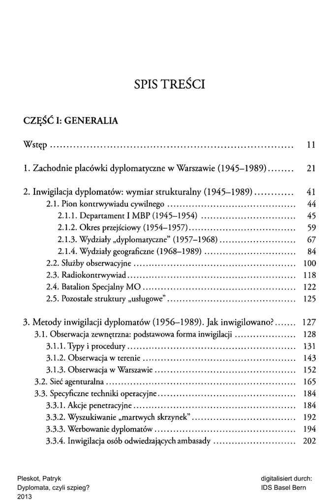 SPIS TREŚCI CZĘŚĆ I: GENERALIA Wstęp 11 1. Zachodnie placówki dyplomatyczne w Warszawie (1945-1989) 21 2. Inwigilacja dyplomatów: wymiar strukturalny (1945-1989) 41 2.1. Pion kontrwywiadu cywilnego 2.1.1. Departament 44 MBP (1945-1954) 45 Okres przejściowy (1954-1957) 59 2.1.3. Wydziały „dyplomatyczne" (1957-1968) 67 2.1.4. Wydziały geograficzne (1968-1989) 84 2.2. Służby obserwacyjne 2.3. Radiokontrwywiad 118 2.4. Batalion Specjalny 2.5. Pozostałe struktury „usługowe" 3. Metody inwigilacji dyplomatów 125 Jak inwigilowano? 3.1. Obserwacja zewnętrzna: podstawowa forma inwigilacji 3.1.1. i procedury 131 Obserwacja w terenie 143 3.1.3. Obserwacja w Warszawie 152 3.2. Sieć agenturalna 3.3. Specyficzne techniki operacyjne 184 3.3.1. Akcje penetracyjne 3.3.2. Wyszukiwanie „martwych skrzynek" 3.3.3. Werbowanie dyplomatów 3.3.4. Inwigilacja osób odwiedzających ambasady Pleskot, Patryk Dyplomata, czyli szpieg? 2013 202 digitalisiert durch: IDS Basel Bern 3.4. Typowe techniki operacyjne 210 Sprawy obiektowe 210 3.4.2. Sprawy personalne 218 3.4.3. Środki techniczne 239 3.4.4. Perlustracja korespondencji 259 3.5. Podstawowe cele operacyjne 262 3.5.1. Zbieranie materiałów kompromitujących 262 3.5.2. Prowokacje, kombinacje operacyjne 264 3.5.3. Analiza zgromadzonych danych 271 3.6. Współpraca kontrwywiadu z innymi pionami 4. Przedmiot inwigilacji odkrywano? Gromadzenie informacji: podstawowy cel dyplomatów 4.2. Rezydentury wywiadowcze w ambasadach 273 299 299 319 4.2.1. Płynne granice szpiegostwa 322 4.2.2. Stany Zjednoczone 332 4.2.3. Wielka Brytania 4.2.4. Francja 346 4.2.5. RFN 349 4.2.6. Liczba szpiegów 355 4.3. Przejawy szpiegowskiej działalności dyplomatów 368 4.3.1. Biały wywiad 369 4.3.2. Kontakty z Polakami 376 4.3.3. Wywiad wizualny 393 4.3.4. Wywiad gospodarczy 433 4.3.5. Wywiad biograficzny 435 4.3.6. Wywiad techniczny 440 4.4. Tajni współpracownicy dyplomatów Werbunek, współpraca - niejasne definicje 452 454 4.4.2. Łączność 462 4.4.3. Oferenci 480 4.4.4. Gry wywiadów? Historia Juana Millera 491 4.5. Działalność polityczno-propagandowa ambasad 507 5. Skutki inwigilacji (1956-1989). Kontrdziałania i ekspulsje 5.1. Kontrdziałania placówek i dyplomatów 5.1.1. Zabezpieczenia placówek Kontrinwigilacja 535 535 537 557 5.1.3. Konspirowanie działań w terenie 5.2. Incydenty dyplomatyczne: interwencje przy łamaniu prawa 565 579 5.3. Incydenty dyplomatyczne: ograniczenia i ekspulsje 593 5.4. Aresztowani polscy „szpiedzy" 612 Zakończenie 625 Wykaz tabel 631 Wykaz skrótów 633 Bibliografia 639 Indeks osób 647 C Z Ę S C II: EXEMPLA Od autora Wykaz dokumentów Dokumenty 23 Wykaz skrótów 647 Bibliografia 653 Indeks osób 661
