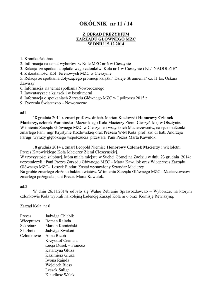 OKÓLNIK nr 11 / 14 Z OBRAD PREZYDIUM ZARZĄDU GŁÓWNEGO MZC W DNIU 15.12 2014 1. Kronika żałobna 2. Informacja na temat wyborów w Kole MZC nr 6 w Cieszynie 3. Relacja ze spotkania opłatkowego członków Kola nr 1 w Cieszynie i KL" NADOLZIE" 4. Z działalności Kół Terenowych MZC w Cieszynie 5. Relacja ze spotkania dotyczącego promocji książki" Dzieje Strumienia" cz. II ks. Oskara Zawiszy 6. Informacja na temat spotkania Noworocznego 7. Inwentaryzacja książek i w kostiumerni 8. Informacja o spotkaniach Zarządu Głównego MZC w I półroczu 2015 r 9. Życzenia Świąteczno – Noworoczne ad1. 18 grudnia 2014 r. zmarł prof. zw. dr hab. Marian Kozłowski Honorowy Członek Macierzy, członek Warmińsko- Mazurskiego Koła Macierzy Ziemi Cieszyńskiej w Olsztynie. W imieniu Zarządu Głównego MZC w Cieszynie i wszystkich Macierzowców, na ręce małżonki zmarłego Pani mgr Krystynie Kozłowskiej oraz Prezesa W-M Koła prof. zw. dr hab. Andrzeja Farugi wyrazy głębokiego współczucia przesłała Pani Prezes Marta Kawulok. 18 grudnia 2014 r. zmarł Leopold Niemiec Honorowy Członek Macierzy i wieloletni Prezes Katowickiego Koła Macierzy Ziemi Cieszyńskiej. W uroczystości żałobnej, która miała miejsce w Suchej Górnej na Zaolziu w dniu 23 grudnia 2014r uczestniczyli : Pani Prezes Zarządu Głównego MZC – Marta Kawulok oraz Wiceprezes Zarządu Głównego MZC- Leszek Pindur. Został wystawiony Sztandar Macierzy. Na grobie zmarłego złożono bukiet kwiatów. W imieniu Zarządu Głównego MZC i Macierzowców zmarłego pożegnała pani Prezes Marta Kawulok. ad.2 W dniu 26.11.2014r odbyło się Walne Zebranie Sprawozdawczo – Wyborcze, na którym członkowie Koła wybrali na kolejną kadencję Zarząd Koła nr 6 oraz Komisję Rewizyjną. Zarząd Koła nr 6 Prezes Wiceprezes Sekretarz Skarbnik Członkowie Jadwiga Chlebik Roman Rainda Marcin Kamieński Jadwiga Swakoń Anna Bizoń Krzysztof Ciemała Łucja Dusek – Francuz Katarzyna Gluza Kazimierz Gluza Iwona Rainda Wojciech Riess Leszek Suliga Klaudiusz Wałek Józef Wiercigroch Komisja Rewizyjna Alicja Wiercigroch Lucyna Bińczyk Łucja Kajstura – Wałek Gratulujemy nowo wybranym do Zarządu Koła i Komisji Rewizyjnej i życzymy owocnej pracy , a także sukcesów na niwie macierzowej oraz dobrej współpracy z Zarządem Głównym MZC i Kołami Terenowymi. Pani Prezes Zarządu Głównego MZC poinformowała obecnych członków Prezydium, że w związku ze zmianą na stanowisku Prezesa Koła nr 6 zostanie wystosowane podziękowanie od Zarządu Głównego MZC dla pana Józefa Swakonia – długoletniego Prezesa tego Koła. ad.3 Dnia 10.12.2014 r w sali konferencyjnej budynku Macierzy odbyło sie spotkanie opłatkowe zorganizowane przez Zarząd Koła nr 1 MZC w Cieszynie we współpracy z Klubem Literackim "Nadolzie" dla swoich członków oraz zaproszonych gości. Wśród obecnych gościła pani Prezes Zarządu Głównego – Marta Kawulok, pani Poseł na Sejm RP Aleksandra Trybuś-Cieślar, która jest członkiem Kola nr 1, pani prezes Koła w Zebrzydowicach-Helena Bartoszek i wiceprezes tego Koła pan Henryk Franek. Spotkanie prowadzili wspólnie Prezes Koła nr 1 -Bronisław Brudny oraz Prezes KL " Nadolzie" Jolanta Skóra. Uroczysta atmosfera spotkania podkreślona recytowanymi wierszami przygotowanymi na tę okazję przez członków KL "Nadolzie" oraz Koncert Zespołu „ ŚWIETLIKI" były dla wszystkich obecnych niezapomnianą ucztą duchową. ad.4 Z działalności Kół Terenowych Macierzy KOŁO NR 2 / Prezes Eugeniusz Raabe/ 11 września 2014 r. W gościnnym ogrodzie działkowym "Tulipan" , spotkaliśmy się na pikniku jesiennym. Impreza stała się okazją do przyjęcia w nasz poczet nowych członków, podsumowania całorocznej działalności, wymienienia najnowszych wiadomości macierzowych, a także spożycia smacznego poczęstunku i zabawy przy muzyce. W pikniku wzięło udział 80 osób. 11 listopada 2014 r. Kilkunastu członków naszego Koła z prezesem E. Raabe na czele uczestniczyło w uroczystej Sesji Rady Powiatu Cieszyńskiego, odbywającej się w Cieszyńskim Teatrze, w trakcie której wręczono Laury Ziemi Cieszyńskiej. 16 listopada 2014 r. Tego dnia odbyła się ostatnia w tym roku wycieczka. Tym razem naszym celem były Gliwice i jego secesyjne zabytki. Zwieńczeniem dnia było obejrzenie spektaklu " Dźwięki muzyki" w Gliwickim Teatrze Muzycznym.. Uczestniczyło 27 osób. 17 grudnia 2014 r. Spotkanie członków w Domu Konczakowskich. Prelegentki – pani Irena French i pani Irena Kwaśny przedstawiły historię i architekturę kamienicy Konczakowskich. ad.5 Informacja na temat promocji książki" Dzieje Strumienia" cz. II ks. Oskara Zawiszy. PROMOCJA MONOGRAFII STRUMIENIA Dnia 17 grudnia 2014 r. w Miejsko- Gminnym Ośrodku Kultury w Strumieniu odbyła się promocja książki ks. Oskara Zawiszy " Dzieje Strumienia" cz. II Całość prowadziła Pani Prezes Miejscowego Kola Macierzy Anastazja Żur. Członkowie Macierzy ze Strumienia przebrani w stroje odpowiednie do czasów tamtej epoki przy blasku świec czytali fragmenty "Dziejów Strumienia" W uroczystości uczestniczyli m. in.Pani Burmistrz Strumienia Anna Grygierek, Przewodniczący Rady Miasta Czesław Greń, a także pan Janusz Świeży, pan Marian Stefek, ks. prałat Oskar Kuśka, pan Wacław Gojniczek oraz pan Krzysztof Wójtowicz. Zarząd Główny MZC reprezentował wiceprezes Bronisław Brudny, który pogratulował wszystkim, dzięki którym publikacja ujrzała światło dzienne, a także złożył w imieniu Pani Prezes Zarządu Głównego MZC Marty Kawulok oraz Zarządu Głównego MZC wszystkim uczestnikom życzenia Świąteczno – Noworoczne. ad.6 Pani Prezes przypomniała obecnym na zebraniu członkom Zarządu Głównego o Spotkaniu Noworocznym, które odbędzie się w dniu 26 stycznia 2015 r. o godz. 17.00 w Zebrzydowicach. W spotkaniu uczestniczyć będą zaproszeni goście, Macierzowcy, przedstawiciele lokalnych władz samorządowych. 
