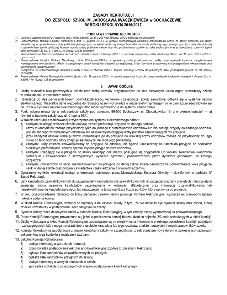 ZASADY REKRUTACJI DO ZESPOŁU SZKÓŁ IM. JAROSŁAWA IWASZKIEWICZA w SOCHACZEWIE W ROKU SZKOLNYM 2016/2017 PODSTAWY PRAWNE REKRUTACJI 1) Ustawa o systemie oświaty z 7 września 1991r (tekst jednolity Dz. U. z 2004r Nr 256 poz. 2572 z późniejszymi zmianami) 2) Rozporządzenie Ministra Edukacji Narodowej z dnia 13 sierpnia 2015 r. w sprawie szczegółowych warunków przechodzenia ucznia ze szkoły publicznej lub szkoły niepublicznej o uprawnieniach szkoły publicznej jednego typu do szkoły publicznej innego typu albo do szkoły publicznej tego samego typu lub szkoły niepublicznej o uprawnieniach szkoły publicznej jednego typu do szkoły publicznej innego typu albo przyjmowania uczniów do szkół publicznych oraz przechodzenia z jednych typów szkół do innych § 23 pkt. 2 i 3 (Dz. U. Nr 26 poz. 232 ze zmianami) 3) Rozporządzenia Ministra Edukacji Narodowej i Sportu z dnia 18 lutego 2002 r. w sprawie organizacji roku szkolnego (Dz.U. Nr 46, poz. 432 z 2002 r., z późn. zm.) 4) Rozporządzenie Ministra Edukacji Narodowej z dnia 22.listopada.2015 r. w sprawie sposobu przeliczania na punkty poszczególnych kryteriów uwzględnianych w postępowaniu rekrutacyjnym, składu i szczegółowych zadań komisji rekrutacyjnej, szczegółowego trybu i terminów przeprowadzania postępowania rekrutacyjnego oraz postępowania uzupełniającego. 5) Zarządzenie Nr 6 Mazowieckiego Kuratora Oświaty z dnia 27 stycznia 2016 r. sprawie rekrutacji uczniów do publicznych szkół ponadgimnazjalnych na rok szkolny 2016/2017. 6) Rozporządzenie Ministra Edukacji Narodowej i Sportu z dn. 29 stycznia 2002 r. w sprawie organizacji i sposobu przeprowadzania konkursów, turniejów i olimpiad (Dz. U. z 2002 r. Nr 13, poz. 125 ze zmianami) I. UWAGI OGÓLNE 1. Liczbę oddziałów klas pierwszych w szkole oraz liczbę uczniów przyjmowanych do klas pierwszych ustala organ prowadzący szkołę w porozumieniu z dyrektorem szkoły. 2. Rekrutacja do klas pierwszych liceum ogólnokształcącego, technikum i zasadniczej szkoły zawodowej odbywa się w systemie naboru elektronicznego. Wszystkie dane niezbędne do rekrutacji uczeń wprowadza w macierzystym gimnazjum /o ile gimnazjum zdecydowało się na udział w systemie naboru elektronicznego/ albo może wprowadzić je do systemu samodzielnie. 3. Punkt naboru mieści się w sekretariacie szkoły pod adresem: 96-500 Sochaczew, ul. Chodakowska 16, a w okresie kwiecień –maj również w budynku szkoły przy ul, Chopina 99A.. 4. W trakcie rekrutacji organizowanej z wykorzystaniem systemu elektronicznego naboru: 1) kandydat składając wniosek określa pozycję swoich preferencji przyjęcia do danego oddziału, 2) każdy z kandydatów zostaje przydzielony tylko do jednego z preferowanych oddziałów lub nie zostaje przyjęty do żadnego oddziału, jeśli do żadnego ze wskazanych oddziałów nie uzyskał wystarczającej liczby punktów zapewniających mu przyjęcie, 3) jeżeli kandydat uzyskał liczbę punktów uprawniającą go do przyjęcia do większej liczby oddziałów zostaje on przydzielony do tego i tylko do tego oddziału, który znajduje się najwyżej na liście jego preferencji, 4) kandydat, który zostanie zakwalifikowany do przyjęcia do oddziału, nie będzie umieszczony na listach do przyjęcia do oddziałów o niższych preferencjach, choćby spełniał kryteria przyjęć do tych oddziałów, 5) kandydat ubiegający się o przyjęcie do szkoły składając dokumenty, posługuje się oryginałami lub kopiami świadectwa ukończenia gimnazjum i zaświadczenia o szczegółowych wynikach egzaminu, poświadczonymi przez dyrektora gimnazjum, do którego uczęszczał. 6) kandydat umieszczony na liście zakwalifikowanych do przyjęcia do danej szkoły składa oświadczenie potwierdzające wolę przyjęcia nauki w danej szkole oraz oryginały świadectwa i zaświadczenia o wynikach egzaminu 5. Ogłoszenie wyników rekrutacji nastąpi w terminach ustalonych przez Mazowieckiego Kuratora Oświaty – określonych w rozdziale IV Zasad Rekrutacji. 6. Listy kandydatów zakwalifikowanych do przyjęcia, listy kandydatów nie zakwalifikowanych do przyjęcia oraz listy przyjętych i nieprzyjętych zawierają imiona nazwiska kandydatów uszeregowane w kolejności alfabetycznej oraz informacje o zakwalifikowaniu lub niezakwalifikowaniu kandydata/przyjęciu lub nieprzyjęciu , a także najniższą liczbę punktów, która uprawnia do przyjęcia. 7. W celu przeprowadzenia rekrutacji do klasy pierwszej dyrektor szkoły powołuje Komisję Rekrutacyjną, wyznacza jej przewodniczącego i określa zadania komisji. 8. W skład Komisji Rekrutacyjnej wchodzi co najmniej 3 nauczycieli szkoły, z tym , że nie może to być dyrektor szkoły oraz osoba, której dziecko uczestniczy w postępowaniu rekrutacyjnym do szkoły. 9. Dyrektor szkoły może dokonywać zmian w składzie Komisji Rekrutacyjnej, w tym zmiany osoby wyznaczonej na przewodniczącego. 10. Prace Komisji Rekrutacyjnej prowadzone są, jeżeli w posiedzeniu komisji bierze udział co najmniej 2/3 osób wchodzących w skład komisji. 11. Osoby wchodzące w skład Komisji Rekrutacyjnej zobowiązane są do nieujawniania informacji o przebiegu posiedzenia komisji i podjętych rozstrzygnięciach, które mogą naruszać dobra osobiste kandydata lub jego rodziców, a także nauczycieli i innych pracowników szkoły. 12. Komisja Rekrutacyjna współpracuje z innymi komórkami szkoły, w szczególności z sekretariatem i dyrektorem w zakresie gromadzonych dokumentów oraz kontaktu z rodzicami i uczniami. 13. Szkolna Komisja Rekrutacyjna: 1) podaje informację o warunkach rekrutacji; 2) przeprowadza postępowanie rekrutacyjno-kwalifikacyjne zgodnie z Zasadami Rekrutacji; 3) ogłasza listę kandydatów zakwalifikowanych do przyjęcia; 4) ogłasza listę kandydatów przyjętych do szkoły; 5) podaje informację o wolnych miejscach w szkole; 6) sporządza protokoły z poszczególnych etapów postępowania kwalifikacyjnego. II. DOKUMENTY WY