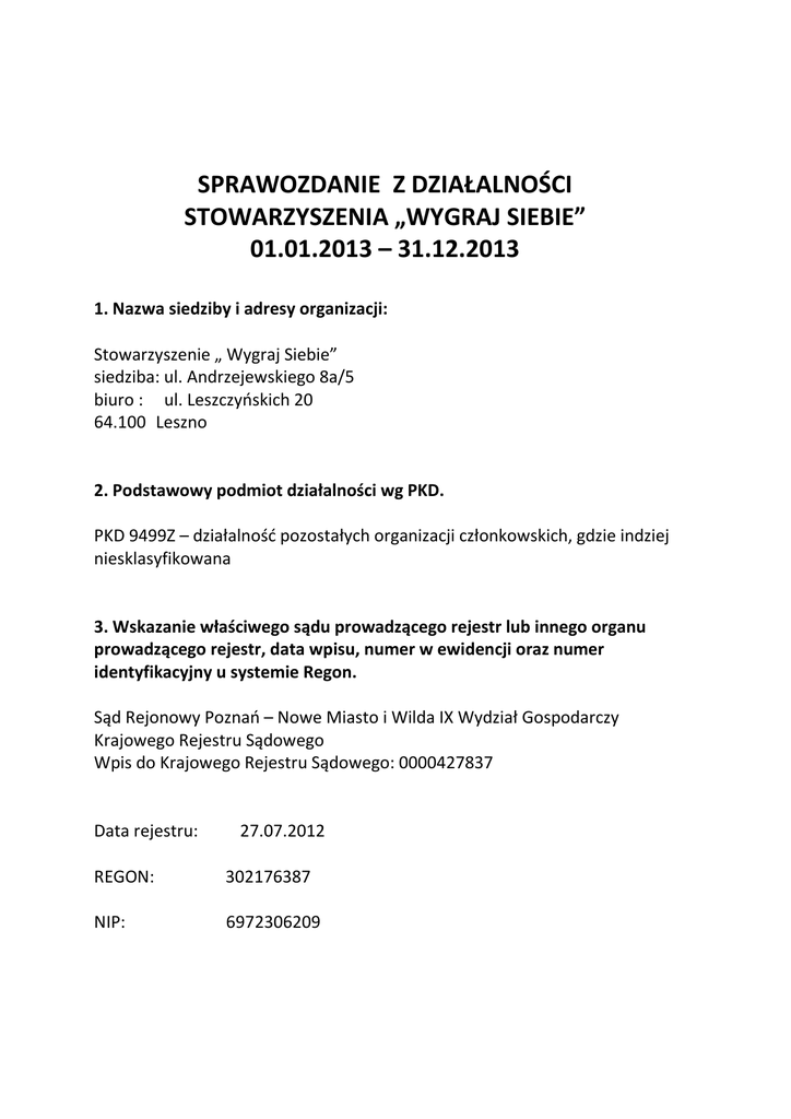 SPRAWOZDANIE Z DZIAŁALNOŚCI STOWARZYSZENIA „WYGRAJ SIEBIE” 01.01.2013 – 31.12.2013 1. Nazwa siedziby i adresy organizacji: Stowarzyszenie „ Wygraj Siebie” siedziba: ul. Andrzejewskiego 8a/5 biuro : ul. Leszczyńskich 20 64.100 Leszno 2. Podstawowy podmiot działalności wg PKD. PKD 9499Z – działalność pozostałych organizacji członkowskich, gdzie indziej niesklasyfikowana 3. Wskazanie właściwego sądu prowadzącego rejestr lub innego organu prowadzącego rejestr, data wpisu, numer w ewidencji oraz numer identyfikacyjny u systemie Regon. Sąd Rejonowy Poznań – Nowe Miasto i Wilda IX Wydział Gospodarczy Krajowego Rejestru Sądowego Wpis do Krajowego Rejestru Sądowego: 0000427837 Data rejestru: 27.07.2012 REGON: 302176387 NIP: 6972306209 4.Informacja o posiadanych kontach bankowych: PKO Bank Polski SA Rachunek bieżący nr 66 1020 3088 0000 8602 0076 0090 5. Dane członków Zarządu: Teresa Rękosiewicz Czesław Fabiański Robert Roszczak Prezes Wiceprezes Członek Leszno ul. Andrzejewskiego 8a/5 Święciechowa ul. Lipowa 21 Leszno ul. Klonowicza 17/1 6. Dane członków Komisji Rewizyjnej Czesław Kowalów Urszula Rynowiecka Krzysztof Kubiak Przewodniczacy Członek Członek 7. Określenie celów statutowych organizacji z podaniem realizacji celów statutowych. Działalność Stowarzyszenia „Wygraj Siebie” określona jest statutem z dnia 28.06.2012 r. ze zmianami z dnia 13.05.2013 r. Celem Stowarzyszenia jest podejmowanie, stosownie do potrzeb wielokierunkowych działań na rzecz profilaktyki i leczenia chorób onkologicznych , profilaktyki i ochrony zdrowia psychicznego niezależnie od wieku, profilaktyki gerontologicznej oraz upowszechnianie w społeczeństwie szeroko rozumianej pedagogiki społecznej Stowarzyszenie realizuje swoje cele przez: a) Promowanie zdrowego stylu życia. b) Upowszechnianie i edukacja w zakresie profilaktyki i zwalczania chorób nowotworowych, ochrony zdrowia psychicznego oraz profilaktyki gerontologicznej. c) Inicjowanie i prowadzenie różnorodnych form pomocy chorym, seniorom i ich rodzinom poprzez grupy samopomocowe i grupy wsparcia, usługi wspomagające rodzinę, jak informacja, doradztwo, poradnictwo. d) Organizowanie i współorganizowanie warsztatów psycho-onkologicznych, gerontologicznych. e) Działania edukacyjne i wydawnicze. f) Organizowanie seminariów, konferencji, kursów, szkoleń, debat, spotkań itp. g) Organizowanie akcji popularyzatorsko-informacyjnych poprzez działania kulturalne, rozrywkowe, sportowe. h) Pomoc w ubieganiu się o status osoby niepełnosprawnej. i) Działanie na rzecz aktywizacji i integracji społecznej osób chorych, niepełnosprawnych, seniorów. j) Niesienie wszechstronnej pomocy osobom chorym, niepełnosprawnym, seniorom w zakresie rekonwalescencji, rehabilitacji , opieki medycznej i prawnej w zakresie zdrowia. k) Rzecznictwo interesów grup społecznych w zakresie chorób onkologicznych , ochrony zdrowia psychicznego, profilaktyki gerontologicznej, niepełnosprawności. l) Wspomaganie rozwoju naukowego osób leczonych i wspierających chorych onkologicznie ,ochronie zdrowia psychicznego oraz osób leczonych i wspierających w chorobach wieku podeszłego. m) Wspieranie inicjatyw mających na celu podnoszenie wiedzy medycznej oraz sposobów zapobiegania chorobom onkologicznym, ochronie zdrowia psychicznego i chorobom wieku podeszłego n) Poszukiwanie i promowanie nowoczesnych form wielokierunkowej racjonalnej stymulacji chorych onkologicznie. o) Poszukiwanie i promowanie nowoczesnych form i wielokierunkowych działań w ochronie zdrowia psychicznego. p) Poszukiwanie i promowanie nowoczesnych form i wielokierunkowych działań w profilaktyce chorób wieku podeszłego q) Wskazywanie i zachęcanie do szukania własnych sposobów profilaktyki zdrowienia. r) Kształtowanie świadomości społecznej na temat chorób onkologicznych, ochrony zdrowia psychicznego oraz profilaktyki gerontologicznej. s) Działanie na rzecz wielopłaszczyznowej pomocy chorym dzieciom i osobom dorosłym, niepełnosprawnym, seniorom, uzależnionym , wykluczonym. t) Aktywizowanie społeczności do pomocy chorym dzieciom i osobom dorosłym, niepełnosprawnym, seniorom, uzależnionym, wykluczonym. u) Wspieranie pozytywnych postaw aktywności społecznej. v) Prowadzenie działalności wspomagającej rozwój wspólnot i społeczności lokalnej. w) Działanie na rzecz integracji europejskiej oraz rozwijanie kontaktów i współpracy miedzy społeczeństwami. x) Pozyskiwanie wolontariuszy. y) Organizowanie wolontariatu w zakresie szkolenia wolontariuszy i koordynowania ich pracy. z) Pozyskiwanie funduszy finansowych z funduszy lokalnych, krajowych i unijnych. aa)Pozyskiwanie środków finansowych od donatorów prywatnych oraz firm. . Organizowanie zbiórek pieniężnych i rzeczowych. bb) Prowadzenie badań i analiz oraz diagnozowanie środowiska w zakresie wiedzy i potrzeb wynikających z realizacji form działania. cc) Współpracę z organizacjami pozarządowymi z kraju i zagranicy zajmującymi się tematyką zbliżoną z działalnością i celami stowarzyszenia oraz organizowanie wspólnie z nimi działań upowszechniających zasady profilaktyki, higieny i zdrowego stylu życia. dd) Współpracę z placówkami ochrony zdrowia i opieki społecznej, z władzami samorządowymi i rządowymi w zakresie realizacji celów Stowarzyszenia. ee) Współpracę z środkami masowego przekazu. Sprawozdanie merytoryczne Stowarzyszenia „Wygraj Siebie” od 01.01.2013 do 31.12.2013 r. 1.Walne Zebranie Członków Stowarzyszenia 13.05.2013 r. Podjęto 9 uchwał: Uchwała nr 1/2013 Walne Zebranie Członków Stowarzyszenia „Wygraj Siebie” przyjęło jednogłośnie uchwałę o udzieleniu absolutorium Zarządowi za 2012 rok. Uchwała nr 2/2013 Walne Zebranie Członków Stowarzyszenia „Wygraj Siebie” przyjęło jednogłośnie uchwałę o zatwierdzeniu sprawozdania merytorycznego za 2012 rok. Uchwała nr 3/2013 Walne Zebranie Członków Stowar