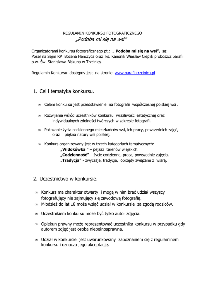 REGULAMIN KONKURSU FOTOGRAFICZNEGO „Podoba mi się na wsi” Organizatorami konkursu fotograficznego pt.: „ Podoba mi się na wsi”, są: Poseł na Sejm RP Bożena Henczyca oraz ks. Kanonik Wiesław Cieplik proboszcz parafii p.w. Św. Stanisława Biskupa w Trzcinicy. Regulamin Konkursu dostępny jest na stronie www.parafiatrzcinica.pl 1. Cel i tematyka konkursu. • Celem konkursu jest przedstawienie na fotografii współczesnej polskiej wsi . • Rozwijanie wśród uczestników konkursu wrażliwości estetycznej oraz indywidualnych zdolności twórczych w zakresie fotografii. • Pokazanie życia codziennego mieszkańców wsi, ich pracy, powszednich zajęć, oraz piękna natury wsi polskiej. • Konkurs organizowany jest w trzech kategoriach tematycznych: „Widokówka ” – pejzaż terenów wiejskich. „Codzienność” – życie codzienne, praca, powszednie zajęcia. „Tradycja” - zwyczaje, tradycje, obrzędy związane z wiarą. 2. Uczestnictwo w konkursie. • • Konkurs ma charakter otwarty i mogą w nim brać udział wszyscy fotografujący nie zajmujący się zawodową fotografią. Młodzież do lat 18 może wziąć udział w konkursie za zgodą rodziców. • Uczestnikiem konkursu może być tylko autor zdjęcia. • Opiekun prawny może reprezentować uczestnika konkursu w przypadku gdy autorem zdjęć jest osoba niepełnosprawna. • Udział w konkursie jest uwarunkowany zapoznaniem się z regulaminem konkursu i oznacza jego akceptację. 3. Prace konkursowe • Fotografie konkursowe wykonane w technice barwnej należy przesłać lub dostarczyć w kopercie z dopiskiem Konkurs Fotograficzny „ Podoba mi się na wsi” na dres: Biuro Poseł na Sejm RP Bożeny Henczycy Rynek ¾ , 63 – 600 Kępno. • Koperta musi zawierać: - zdjęcie każdej ze zgłoszonych prac w formacie A4 z opisem na odwrocie zawierającym imię i nazwisko autora, temat zdjęcia oraz kategorię do której zostało zrobione - wypełnioną Kartę Zgłoszeniową zawierającą podstawowe dane uczestnika. - płytę CD lub DVD z nagranymi pracami w formacie JPEG w minimalnej rozdzielczość 300 dpi. • Fotografie konkursowe można dodatkowo przesyłać drogą elektroniczną na adres e-mail: [email protected] z uwzględnieniem danych kontaktowych autora zdjęć, wpisując je w treść wiadomości. W tytule wiadomości należy wpisać: „Konkurs fotograficzny”- imię i nazwisko autora zdjęć. • Uczestnicy mogą nadsyłać maksymalnie po 3 zdjęcia do każdej z kategorii. • Każde zdjęcie może nosić swój tytuł nadany przez autora. • Obróbka cyfrowa zdjęć przesłanych na konkurs może polegać jedynie na minimalnym rozjaśnianiu, kontrastowaniu i redukcji koloru. Wszelkie inne zmiany prowadzące w efekcie do wynaturzenia prawdziwości i naturalności tego co przedstawia zdjęcie, stosowanie efektów cyfrowych czy fotomontaż jest niedopuszczalny. • Do konkursu nie należy nadsyłać zdjęć, które brały udział lub były nagradzane w innych konkursach fotograficznych. • Nadesłane zdjęcia oraz nośniki ,na których zostały zapisane po zakończeniu konkursu nie będą zwracane. • Prace można nadsyłać do 30 czerwca 2015. 4. Ocena prac i rozstrzygnięcie konkursu. • Wszystkie zdjęcia nadesłane do konkursu podlegają ocenie jury powołanego przez organizatora. • Jury dokonuje oceny po zakończeniu okresu trwania konkursu biorąc pod uwagę wartość artystyczną, jakość i oryginalność nadesłanych fotografii. • Spośród nadesłanych prac jury wybierze po trzy prace z każdej kategorii, które zajmą pierwsze, drugie i trzecie miejsce i zostaną zakwalifikowane do wystawy pokonkursowej. • Jury wybierze również prace wyróżnione – o ilości tych prac jury zadecyduje podczas obrad. • Decyzją jury nagrodzone i wyróżnione osoby zostaną powiadomione telefonicznie i drogą elektroniczną przed oficjalnym rozstrzygnięciem konkursu. • Decyzja werdyktowa jury jest nieodwołalna. • Oficjalne rozstrzygnięcie konkursu fotograficznego wraz z uroczystą prezentacją wyróżnionych prac oraz zwycięzców konkursu nastąpi podczas otwarcia wystawy pokonkursowej, która odbędzie się na Wodzicznej 11 lipca 2015r. na spotkaniu z Krzysztofem Zanussim. • Organizator zastrzega sobie możliwość odwołania konkursu w przypadku otrzymania niedostatecznej liczby fotografii. 5. Prawa autorskie i prawa pokrewne. • Zgłoszenie fotografii do konkursu jest równoznaczne z wyrażeniem zgody na zamieszczenie fotografii w galerii pokonkursowej i udzieleniem organizatorowi przez uczestnika konkursu nieodpłatnej i bezterminowej licencji na umieszczenie zdjęć wykonanych przez uczestnika konkursu na wszystkich polach eksploatacji. • Organizator zastrzega sobie prawo do bezpłatnej reprodukcji nagrodzonych i wyróżnionych prac, również podczas wystawy pokonkursowej oraz w innych publikacjach związanych z konkursem. Przekazanie konkursowych prac przez autora oznacza, że nie będą one naruszały majątkowych i osobistych praw autorskich osób trzecich umieszczonych na zdjęciach, oraz że osoba przekazująca prace konkursowe posiada zgodę osób widniejących na fotografii do wykorzystania ich wizerunku. Zgoda ta nie jest konieczna w wyjątkach dozwolonego • wykorzystania wizerunku przewidzianych w ustawie o prawie autorskim i prawach pokrewnych. • W przypadku wystąpienia przez osobę trzecią z roszczeniami wynikającymi z tytułu naruszenia praw określonych powyżej osoba przekazująca zrekompensuje organizatorowi, jako wyłącznie odpowiedzialna, koszty poniesione w związku ze skierowaniem przeciwko niemu roszczeń odszkodowawczych, zwalniając organizatora od wszelkich zobowiązań, jakie powstaną z tego tytułu.