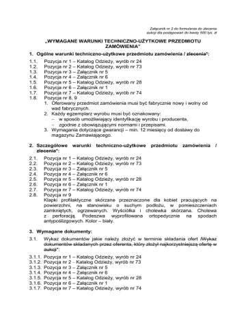 Załącznik nr 2 do formularza do zlecenia aukcji dla postępowań do kwoty 500 tys. zł „WYMAGANE WARUNKI TECHNICZNO-UŻYTKOWE PRZEDMIOTU ZAMÓWIENIA” 1. Ogólne warunki techniczno-użytkowe przedmiotu zamówienia / zlecenia*: 1.1. 1.2. 1.3. 1.4. 1.5. 1.6. 1.7. 1.8. Pozycja nr 1 – Katalog Odzieży, wyrób nr 24 Pozycja nr 2 – Katalog Odzieży, wyrób nr 73 Pozycja nr 3 – Załącznik nr 5 Pozycja nr 4 – Załącznik nr 6 Pozycja nr 5 – Katalog Odzieży, wyrób nr 28 Pozycja nr 6 – Załącznik nr 1 Pozycja nr 7 – Katalog Odzieży, wyrób nr 74 Pozycja nr 8, 9 1. Oferowany przedmiot zamówienia musi być fabrycznie nowy i wolny od wad fabrycznych. 2. Każdy egzemplarz wyrobu musi być oznakowany: − w sposób umożliwiający identyfikację wyrobu i producenta, − zgodnie z obowiązującymi normami i przepisami. 3. Wymagania dotyczące gwarancji – min. 12 miesięcy od dostawy do magazynu Zamawiającego. 2. Szczegółowe warunki zlecenia*: 2.1. 2.2. 2.3. 2.4. 2.5. 2.6. 2.7. 2.8. techniczno-użytkowe przedmiotu zamówienia / Pozycja nr 1 – Katalog Odzieży, wyrób nr 24 Pozycja nr 2 – Katalog Odzieży, wyrób nr 73 Pozycja nr 3 – Załącznik nr 5 Pozycja nr 4 – Załącznik nr 6 Pozycja nr 5 – Katalog Odzieży, wyrób nr 28 Pozycja nr 6 – Załącznik nr 1 Pozycja nr 7 – Katalog Odzieży, wyrób nr 74 Pozycja nr 9 Klapki profilaktyczne skórzane przeznaczone dla kobiet pracujących na powierzchni, na stanowisku o suchym podłożu, w pomieszczeniach zamkniętych, ogrzewanych. Wyściółka i cholewka skórzana. Cholewa z perforacją. Podeszwa wyprofilowana ortopedycznie na spodach antypoślizgowych. Kolor – biały. 3. Wymagane dokumenty: 3.1. Wykaz dokumentów jakie należy złożyć w terminie składania ofert /Wykaz dokumentów składanych przez oferenta, który złożył najkorzystniejszą ofertę w aukcji*: 3.1.1. 3.1.2. 3.1.3. 3.1.4. 3.1.5. 3.1.6. 3.1.7. Pozycja nr 1 – Katalog Odzieży, wyrób nr 24 Pozycja nr 2 – Katalog Odzieży, wyrób nr 73 Pozycja nr 3 – Załącznik nr 5 Pozycja nr 4 – Załącznik nr 6 Pozycja nr 5 – Katalog Odzieży, wyrób nr 28 Pozycja nr 6 – Załącznik nr 1 Pozycja nr 7 – Katalog Odzieży, wyrób nr 74 3.1.8. Pozycja nr 8,9 1. Deklaracja zgodności (załącznik nr 3). 2. Instrukcja użytkowania, która powinna zawierać: nazwę i adres producenta lub jego upoważnionego przedstawiciela oraz sposób przechowywania, użytkowania, czyszczenia, konserwacji. 3. Karta katalogowa oferowanego wyrobu zawierająca min. opis wyrobu oraz czytelne zdjęcie. 4. Wymagane dokumenty: 4.1. Wykaz dokumentów składanych wraz z pierwszą dostawą przedmiotu zamówienia: 4.1.1. 4.1.2. 4.1.3. 4.1.4. 4.1.5. 4.1.6. 4.1.7. 4.1.8. Pozycja nr 1 – Katalog Odzieży, wyrób nr 24 Pozycja nr 2 – Katalog Odzieży, wyrób nr 73 Pozycja nr 3 – Załącznik nr 5 Pozycja nr 4 – Załącznik nr 6 Pozycja nr 5 – Katalog Odzieży, wyrób nr 28 Pozycja nr 6 – Załącznik nr 1 Pozycja nr 7 – Katalog Odzieży, wyrób nr 74 Pozycja nr 8,9 Wraz z pierwszą dostawą wyrobu na kopalnie Dostawca winien dołączyć: instrukcję użytkowania, przechowywania i konserwacji, deklarację zgodności, świadectwo jakości, dokument zawierający warunki i okres gwarancji. 4.2. Wykaz dokumentów składanych wraz z każdą dostawą przedmiotu zamówienia: 4.2.1. 4.2.2. 4.2.3. 4.2.4. 4.2.5. 4.2.6. 4.2.7. 4.2.8. Pozycja nr 1 – Katalog Odzieży, wyrób nr 24 Pozycja nr 2 – Katalog Odzieży, wyrób nr 73 Pozycja nr 3 – Załącznik nr 5 Pozycja nr 4 – Załącznik nr 6 Pozycja nr 5 – Katalog Odzieży, wyrób nr 28 Pozycja nr 6 – Załącznik nr 1 Pozycja nr 7 – Katalog Odzieży, wyrób nr 74 Pozycja nr 8,9 Wraz z każdą dostawą wyrobu na kopalnie Dostawca winien dołączyć: deklarację zgodności i świadectwo jakości. * niepotrzebne skreślić