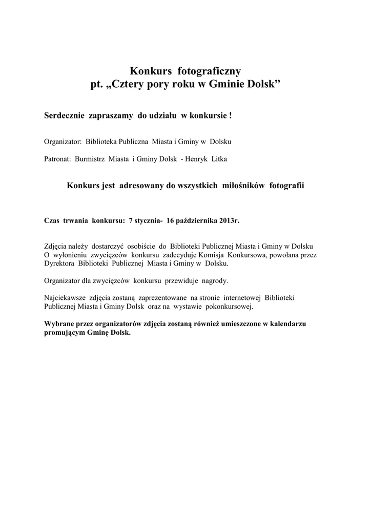 Konkurs fotograficzny pt. „Cztery pory roku w Gminie Dolsk” Serdecznie zapraszamy do udziału w konkursie ! Organizator: Biblioteka Publiczna Miasta i Gminy w Dolsku Patronat: Burmistrz Miasta i Gminy Dolsk - Henryk Litka Konkurs jest adresowany do wszystkich miłośników fotografii Czas trwania konkursu: 7 stycznia- 16 października 2013r. Zdjęcia naleŜy dostarczyć osobiście do Biblioteki Publicznej Miasta i Gminy w Dolsku O wyłonieniu zwycięzców konkursu zadecyduje Komisja Konkursowa, powołana przez Dyrektora Biblioteki Publicznej Miasta i Gminy w Dolsku. Organizator dla zwycięzców konkursu przewiduje nagrody. Najciekawsze zdjęcia zostaną zaprezentowane na stronie internetowej Biblioteki Publicznej Miasta i Gminy Dolsk oraz na wystawie pokonkursowej. Wybrane przez organizatorów zdjęcia zostaną równieŜ umieszczone w kalendarzu promującym Gminę Dolsk. Regulamin konkursu pt. „Cztery pory roku w Gminie Dolsk” § 1. 1. Niniejszy regulamin określa zasady, zakres i warunki uczestnictwa w konkursie fotograficznym pt. „Cztery pory roku w Gminie Dolsk”, zwanym dalej Konkursem. 2. Organizatorem Konkursu jest Biblioteka Publiczna Miasta i Gminy w Dolsku, zwana dalej Organizatorem. 3. Konkurs jest objęty Patronatem Burmistrza Miasta i Gminy Dolsk - Henryka Litka. § 2. 1. Celem konkursu jest wyłonienie i wytypowanie zdjęć ukazujących najciekawsze zakątki miasta i gminy Dolsk na przestrzeni czterech pór roku. § 3. Warunki uczestnictwa: 1. Konkurs adresowany jest do wszystkich miłośników fotografii 2. KaŜdy uczestnik musi wystawić do konkursu 4 zdjęcia (kaŜde z innej pory roku) przedstawiające najciekawsze zakątki miasta i gminy Dolsk . 3. Zdjęcia mogą zostać przygotowane z wykorzystaniem dowolnych graficznych programów komputerowych w formie pliku graficznego. 4. Zdjęcia powinny być zapisane na nośniku cyfrowym (np. płyta CD-R) oraz w postaci odbitki na papierze fotograficznym. Format zdjęcia A5. Zdjęcie i nośnik cyfrowy naleŜy na odwrocie podpisać imieniem i nazwiskiem autora zdjęcia i data wykonania i dostarczyć w podobnie opisanej kopercie. § 4. Termin i warunki dostarczeni zdjęć: 1. Zdjęcia do konkursu naleŜy dostarczyć osobiście do Biblioteki Publicznej Miasta i Gminy w Dolsku, Plac Wyzwolenia 4, w terminie do dnia 16 października 2013 r. do godziny 15.oo. 2. W momencie przekazywania zdjęć naleŜy dołączyć oświadczenie, którego wzór stanowi załącznik do Regulaminu. 3. Zdjęcia oddane po terminie nie będą uczestniczyły w konkursie. 4. Zasady przyznawania nagród: • O wyłonieniu zwycięzców konkursu zadecyduje powołana specjalnie w tym celu komisja konkursowa , zwana dalej Komisją. • Komisję powołuje Dyrektor Biblioteki Publicznej Miasta i Gminy w Dolsku. • Organizator dla zwycięzców konkursu przewiduje nagrody. • Decyzja Komisji jest ostateczna. 5. Najciekawsze zdjęcia zostaną zaprezentowane na stronie internetowej Biblioteki Publicznej Miasta i Gminy Dolsk oraz na wystawie pokonkursowej. Wybrane przez organizatorów zdjęcia zostaną równieŜ umieszczone w kalendarzu promującym Gminę Dolsk. 6. Nagrody zostaną wręczone w terminie ogłoszonym przez Komisję § 5. 1. Z dniem przystąpienia do Konkursu, uczestnicy zobowiązują się przenieść na Organizatora wszelkie autorskie prawa majątkowe do zdjęć konkursowych dostarczonych Organizatorowi oraz do nieograniczonego w czasie korzystania i rozpowszechniania w kraju i za granica, na polach eksploatacji określonych w art. 50 Ustawy z dnia 4 lutego 1994 r. o prawie autorskim i prawach pokrewnych (Dz.U. z 2000 r. Nr 80, poz. 904 ze zm.) w tym prawo do: a) wyłącznego uŜywania i wykorzystywania zdjęć, będących przedmiotem konkursu, we wszelkiej działalności promocyjnej, reklamowej, informacyjnej i usługowej. b) utrwalania i zwielokrotniania zdjęć wszelkimi technikami graficznymi, c) zwielokrotniania poprzez dokonywanie zapisu zdjęć na nośnikach elektronicznych, d) publicznego wystawiania i wyświetlania na wszelkich imprezach otwartych i zamkniętych, e) wprowadzania do obrotu, wydawania i rozpowszechniania materiałów promocyjnych i reklamowych, f) wprowadzania do pamięci komputera i umieszczania w sieci Internet, g) publicznego wystawiania , h) najmu, dzierŜawy i bezpłatnego uŜyczenia, 2. Zwycięzca Konkursu zobowiązuje się do nie zgłaszania roszczeń względem Organizatora Konkursu z tytułu wykorzystania przez niego zdjęć dostarczonych do konkursu. § 6. Organizator moŜe w kaŜdym czasie uniewaŜnić Konkurs bez podania przyczyn. Załącznik do Regulaminu ………………………………………………. (imię i nazwisko) ……………………………………………. ( adres ) …………………………………………… (adres zamieszkania) ………………………………………….. …………………………………………. (telefon) OŚWIADCZAM, Iś 1. Zapoznałem/am się z treścią Regulaminu konkursu fotograficznego pt. „Cztery pory roku w gminie Dolsk” organizowanego przez Bibliotekę Publiczną Miasta i Gminy w Dolsku, Plac Wyzwolenia 4. 2. Dostarczone zdjęcia są moim osobistym dziełem a prawa autorskie do zdjęć nie są niczym ograniczone i nie naruszają praw osób trzecich. 3. Niniejszym wyraŜam zgodę na przetwarzanie danych osobowych w zakresie niezbędnym do przeprowadzenia konkursu ( zgodnie z ustawą z dn. 29.08.1997 r. o Ochronie danych osobowych Dz. U. Nr 133 poz. 883.). ……………………………….. ( data) …………………………………… (czytelny podpis)