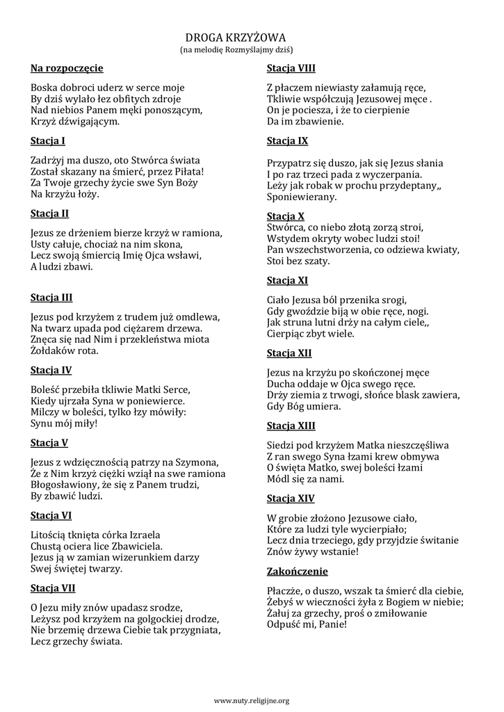 DROGA KRZYŻOWA (na melodię Rozmyślajmy dziś) Na rozpoczęcie Stacja VIII Boska dobroci uderz w serce moje By dziś wylało łez obfitych zdroje Nad niebios Panem męki ponoszącym, Krzyż dźwigającym. Z płaczem niewiasty załamują ręce, Tkliwie współczują Jezusowej męce . On je pociesza, i że to cierpienie Da im zbawienie. Stacja I Stacja IX Zadrżyj ma duszo, oto Stwórca świata Został skazany na śmierć, przez Piłata! Za Twoje grzechy życie swe Syn Boży Na krzyżu łoży. Przypatrz się duszo, jak się Jezus słania I po raz trzeci pada z wyczerpania. Leży jak robak w prochu przydeptany,, Sponiewierany. Stacja II Stacja X Stwórca, co niebo złotą zorzą stroi, Wstydem okryty wobec ludzi stoi! Pan wszechstworzenia, co odziewa kwiaty, Stoi bez szaty. Jezus ze drżeniem bierze krzyż w ramiona, Usty całuje, chociaż na nim skona, Lecz swoją śmiercią Imię Ojca wsławi, A ludzi zbawi. Stacja XI Stacja III Jezus pod krzyżem z trudem już omdlewa, Na twarz upada pod ciężarem drzewa. Znęca się nad Nim i przekleństwa miota Żołdaków rota. Stacja IV Ciało Jezusa ból przenika srogi, Gdy gwoździe biją w obie ręce, nogi. Jak struna lutni drży na całym ciele,, Cierpiąc zbyt wiele. Stacja XII Jezus na krzyżu po skończonej męce Ducha oddaje w Ojca swego ręce. Drży ziemia z trwogi, słońce blask zawiera, Gdy Bóg umiera. Boleść przebiła tkliwie Matki Serce, Kiedy ujrzała Syna w poniewierce. Milczy w boleści, tylko łzy mówiły: Synu mój miły! Stacja XIII Stacja V Jezus z wdzięcznością patrzy na Szymona, Że z Nim krzyż ciężki wziął na swe ramiona Błogosławiony, że się z Panem trudzi, By zbawić ludzi. Stacja VI Siedzi pod krzyżem Matka nieszczęśliwa Z ran swego Syna łzami krew obmywa O święta Matko, swej boleści łzami Módl się za nami. Stacja XIV W grobie złożono Jezusowe ciało, Które za ludzi tyle wycierpiało; Lecz dnia trzeciego, gdy przyjdzie świtanie Znów żywy wstanie! Litością tknięta córka Izraela Chustą ociera lice Zbawiciela. Jezus ją w zamian wizerunkiem darzy Swej świętej twarzy. Zakończenie Stacja VII O Jezu miły znów upadasz srodze, Leżysz pod krzyżem na golgockiej drodze, Nie brzemię drzewa Ciebie tak przygniata, Lecz grzechy świata. Płaczże, o duszo, wszak ta śmierć dla ciebie, Żebyś w wieczności żyła z Bogiem w niebie; Żałuj za grzechy, proś o zmiłowanie Odpuść mi, Panie! www.nuty.religijne.org
