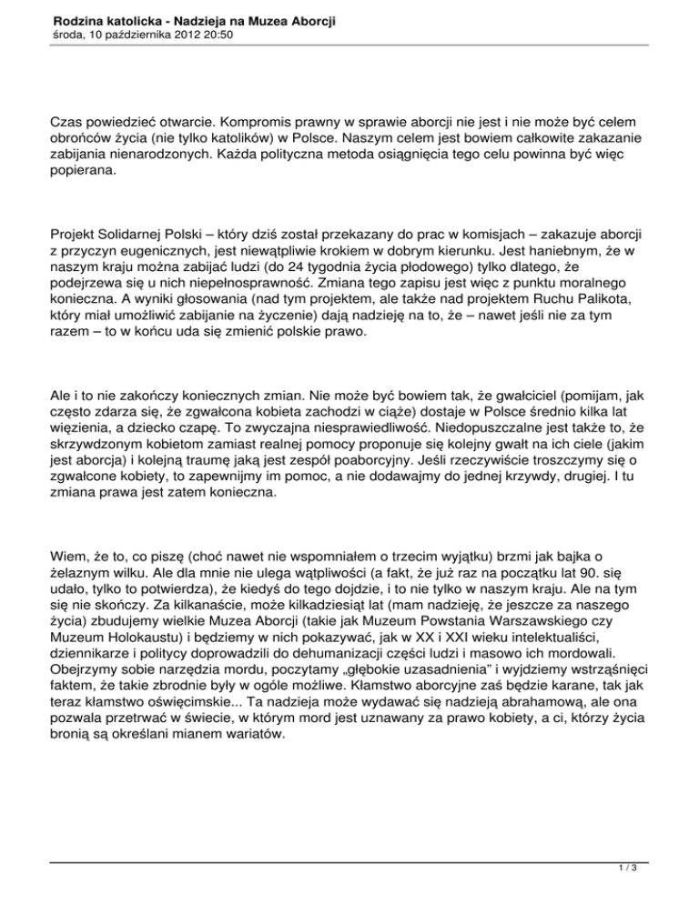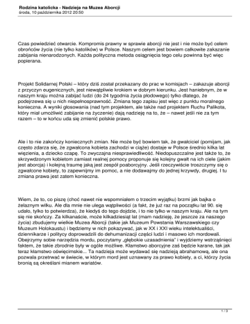 Rodzina katolicka - Nadzieja na Muzea Aborcji środa, 10 października 2012 20:50 Czas powiedzieć otwarcie. Kompromis prawny w sprawie aborcji nie jest i nie może być celem obrońców życia (nie tylko katolików) w Polsce. Naszym celem jest bowiem całkowite zakazanie zabijania nienarodzonych. Każda polityczna metoda osiągnięcia tego celu powinna być więc popierana. Projekt Solidarnej Polski – który dziś został przekazany do prac w komisjach – zakazuje aborcji z przyczyn eugenicznych, jest niewątpliwie krokiem w dobrym kierunku. Jest haniebnym, że w naszym kraju można zabijać ludzi (do 24 tygodnia życia płodowego) tylko dlatego, że podejrzewa się u nich niepełnosprawność. Zmiana tego zapisu jest więc z punktu moralnego konieczna. A wyniki głosowania (nad tym projektem, ale także nad projektem Ruchu Palikota, który miał umożliwić zabijanie na życzenie) dają nadzieję na to, że – nawet jeśli nie za tym razem – to w końcu uda się zmienić polskie prawo. Ale i to nie zakończy koniecznych zmian. Nie może być bowiem tak, że gwałciciel (pomijam, jak często zdarza się, że zgwałcona kobieta zachodzi w ciąże) dostaje w Polsce średnio kilka lat więzienia, a dziecko czapę. To zwyczajna niesprawiedliwość. Niedopuszczalne jest także to, że skrzywdzonym kobietom zamiast realnej pomocy proponuje się kolejny gwałt na ich ciele (jakim jest aborcja) i kolejną traumę jaką jest zespół poaborcyjny. Jeśli rzeczywiście troszczymy się o zgwałcone kobiety, to zapewnijmy im pomoc, a nie dodawajmy do jednej krzywdy, drugiej. I tu zmiana prawa jest zatem konieczna. Wiem, że to, co piszę (choć nawet nie wspomniałem o trzecim wyjątku) brzmi jak bajka o żelaznym wilku. Ale dla mnie nie ulega wątpliwości (a fakt, że już raz na początku lat 90. się udało, tylko to potwierdza), że kiedyś do tego dojdzie, i to nie tylko w naszym kraju. Ale na tym się nie skończy. Za kilkanaście, może kilkadziesiąt lat (mam nadzieję, że jeszcze za naszego życia) zbudujemy wielkie Muzea Aborcji (takie jak Muzeum Powstania Warszawskiego czy Muzeum Holokaustu) i będziemy w nich pokazywać, jak w XX i XXI wieku intelektualiści, dziennikarze i politycy doprowadzili do dehumanizacji części ludzi i masowo ich mordowali. Obejrzymy sobie narzędzia mordu, poczytamy „głębokie uzasadnienia” i wyjdziemy wstrząśnięci faktem, że takie zbrodnie były w ogóle możliwe. Kłamstwo aborcyjne zaś będzie karane, tak jak teraz kłamstwo oświęcimskie... Ta nadzieja może wydawać się nadzieją abrahamową, ale ona pozwala przetrwać w świecie, w którym mord jest uznawany za prawo kobiety, a ci, którzy życia bronią są określani mianem wariatów. 1/3 Rodzina katolicka - Nadzieja na Muzea Aborcji środa, 10 października 2012 20:50 Rozrywanie na strzępy niepełnosprawnych jest nieludzkie, a nie tylko niekatolickie Larum zagrano na lewicy. Po raz kolejny okazało się, że nadal są w Polsce politycy i ludzie, którzy sprzeciwiają się prawu pozwalającemu na zabijanie nienarodzonych. Do walki z nimi stanęła więc dzielnie Monika Olejnik, która przekonuje, że z faktu, iż 40 posłów PO było za zaostrzeniem ustawy aborcyjnej wynika, że w Polsce rządzi Kościół. - Kościół rządzi w Polsce. 40 posłów PO jest za zaostrzeniem ustawy antyaborcyjnej – napisała na swoim profilu Facebooku Monika Olejnik. I aż strach zapytać, jaki jest związek między owymi rządami, a uznaniem, że rozrywaniem na strzępy dzieci, tylko dlatego, że są chore jest złe? Ja, i jak sądzę zdecydowana większość prolajferów jesteśmy za życiem nie dlatego, że to jest po katolicku, tylko dlatego, że to jest po ludzku. Nie opowiadam się przeciw rozrywaniu ludzi na strzępy, dlatego, że jestem katolikiem, ale dlatego, że jestem człowiekiem. I gdyby nawet (wiem, że tak się nie stanie, ale załóżmy to na chwilę) Kościół w tej sprawie zaczął zmieniać poglądy, to dla mnie byłoby jasne, że muszę stać w miejscu, w którym jestem. Rozrywanie na strzępy niepełnosprawnych jest bowiem nie tyle niekatolickie, ile nieludzkie. Tomasz P. Terlikowski Czas obrońców życia Skierowanie przez Sejm do dalszych prac projektu zakazującego zabijania nienarodzonych, chorych dzieci to dopiero pierwszy krok. Data 10 października 2012 r. to ważny dzień dla obrony życia w Polsce. Sejm najpierw zdecydowaną większością głosów (365) odrzucił projekt Ruchu Palikota wprowadzający m.in. aborcję do 12 tygodnia życia dziecka bez żadnych ograniczeń, a potem skierował do dalszych prac projekt Solidarnej Polski wzmacniający ochronę życia w Polsce. Jego istota polega na 2/3 Rodzina katolicka - Nadzieja na Muzea Aborcji środa, 10 października 2012 20:50 wykreśleniu z obowiązującej ustawy przypadku, który zezwala na aborcję, gdy istnieje prawdopodobieństwo choroby nienarodzonego dziecka. Za tym, aby ten projekt został skierowany do dalszych prac w sejmowych komisjach głosowało 207 posłów, przy 189 przeciwko. To niewątpliwie sukces, ale jednocześnie początek legislacyjnej drogi. Warto przypomnieć, że w poprzedniej kadencji Sejmu posłowie także skierowali do sejmowych komisji projekt obywatelski całkowicie zakazujący aborcji, a potem został on odrzucony w drugim czytaniu. Dlatego teraz potrzebna jest wielka mobilizacja wokół propozycji Solidarnej Polski. Jej elementem może być kampania społeczna uświadamiająca, że np. ludzie z Zespołem Downa czy Turnera w świetle obowiązujących przepisów mogą być zabici przed urodzeniem. Warto też zorganizować sympozja na temat aborcji eugenicznej, do czego się sprowadza prawo zezwalające na zabijanie chorych dzieci przed urodzeniem. Jednak najważniejsze jest przekonywanie posłów, aby tę poprawkę poparli w toku dalszych prac. Z analizy głosowania w pierwszym czytaniu wynika, że w tej sprawie można liczyć na SP i PiS, oraz większą część PSL, a także 40 posłó