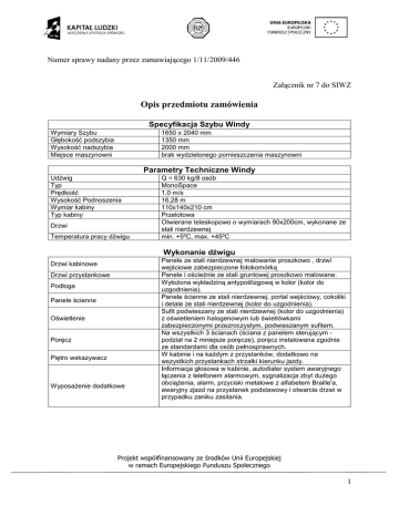 Numer sprawy nadany przez zamawiającego 1/11/2009/446 Załącznik nr 7 do SIWZ Opis przedmiotu zamówienia Specyfikacja Szybu Windy Wymiary Szybu Głębokość podszybia Wysokość nadszybia Miejsce maszynowni 1650 x 2040 mm 1350 mm 2000 mm brak wydzielonego pomieszczenia maszynowni Parametry Techniczne Windy Udźwig Typ Prędkość Wysokość Podnoszenia Wymiar kabiny Typ kabiny Drzwi Temperatura pracy dźwigu Q = 630 kg/8 osób MonoSpace 1,0 m/s 16,28 m 110x140x210 cm Przelotowa Otwierane teleskopowo o wymiarach 90x200cm, wykonane ze stali nierdzewnej min. +5ºC, max. +45ºC Wykonanie dźwigu Drzwi kabinowe Drzwi przystankowe Podłoga Panele ścienne Oświetlenie Poręcz Piętro wskazywacz Wyposażenie dodatkowe Panele ze stali nierdzewnej malowanie proszkowo , drzwi wejściowe zabezpieczone fotokomórką Panele i ościeżnie ze stali gruntowej proszkowo malowane. Wyłożona wykładziną antypoślizgową w kolor (kolor do uzgodnienia). Panele ścienne ze stali nierdzewnej, portal wejściowy, cokoliki i detale ze stali nierdzewnej (kolor do uzgodnienia). Sufit podwieszany ze stali nierdzewnej (kolor do uzgodnienia) z oświetleniem halogenowym lub świetlówkami zabezpieczonymi przezroczystym, podwieszanym sufitem. Na wszystkich 3 ścianach (ściana z panelem sterującym podział na 2 mniejsze poręcze), poręcz instalowana zgodnie ze standardami dla osób pełnosprawnych. W kabinie i na każdym z przystanków, dodatkowo na wszystkich przystankach strzałki kierunku jazdy. Informacja głosowa w kabinie, autodialer system awaryjnego łączenia z telefonem alarmowym, sygnalizacja zbyt dużego obciążenia, alarm, przyciski metalowe z alfabetem Braille'a, awaryjny zjazd na przystanek podstawowy i otwarcie drzwi w przypadku zaniku zasilania. Projekt współfinansowany ze środków Unii Europejskiej w ramach Europejskiego Funduszu Społecznego 1 Numer sprawy nadany przez zamawiającego 1/11/2009/446 WARUNKI GWARANCJI I KONSERWACJI 1. Gwarancja obowiązuje przez okres 24 miesięcy od momentu dopuszczenia windy do użytkowania przez stosowne urzędy. 2. Wykonawca gwarantuje serwis swoich urządzeń zarówno w okresie gwarancji jak i po gwarancji. 3. Wykonawca gwarantuje, że wszystkie jego materiały są materiałami najwyższej jakości i są zgodne z obowiązującymi normami jakościowymi. 4. Podejmuje się wymienić bezpłatnie uszkodzone części podczas okresu gwarancji. 5. Zamawiający niezwłocznie powiadomi Wykonawcę o wszelkich awariach w pracy dźwigu telefonicznie oraz potwierdzi ten fakt w formie pisemnej. 6. Od momentu zawiadomienia o awarii wykonawca musi podjąć działania likwidujące awarię w ciągu minimum jednej godziny gdy w windzie zostali uwięzieni ludzie a w ciągu dwóch godzin gdy w windzie nie ma nikogo. Niezależnie od dnia tygodnia. W przypadku gdy usunięcie defektu nie jest możliwe natychmiastowe, Wykonawca zobowiązany jest jak najszybciej określić pisemnie termin jego usunięcia. Usunięcie defektu stwierdza się protokolarnie. 7. Gwarancja nie obejmuje normalnego zużycia części i uszkodzeń spowodowanych siłą wyższą, niewłaściwym użytkowaniem, wpływem wilgoci w skutek zniszczenia brakiem wentylacji, przekroczeniem napięcia elektrycznego i wpływem pola elektromagnetycznego, osiadaniem budynku, wandalizmem oraz innymi zewnętrznymi czynnikami tego rodzaju. 8. Wykonawca nie będzie odpowiedzialny za uszkodzenia lub awarie spowodowane niewłaściwym użytkowaniem lub ewentualną naprawą przez osoby nieupoważnione. 9. Prawa przysługujące z tytułu gwarancji obowiązują pod warunkiem przekazania urządzeń dźwigowych do autoryzowanego serwisu producenta i po podpisaniu z nim stosownej umowy. 10. Gwarancja obejmuje zakres podstawowej konserwacji. 11. Opis zakresu konserwacji. Projekt współfinansowany ze środków Unii Europejskiej w ramach Europejskiego Funduszu Społecznego 2 Numer sprawy nadany przez zamawiającego 1/11/2009/446 Do zakresu konserwacji należy okresowa comiesięczna konserwacja modułowa oraz robocza kontrola wszystkich części urządzeń i ich wyposażenia technicznego zgodnie z instrukcją producenta. 11.1 Przegląd podstawowy będzie wykonywany podczas każdego przeglądu. Zapewnieniu bezawaryjnej pracy urządzenia. W zależności od typu urządzenia, częstotliwości użytkowania oraz potrzeb będzie wykonywany przegląd podstawowy, podzielony na następujące moduły: - Moduł – drzwi; - Moduł – elektryczny; - Moduł – szyb; - Moduł – napęd. 11.2 Pogotowie dźwigowe w zakresie uwalniania ludzi z kabiny dźwigu jest bezpłatne i będzie prowadzone przez Zleceniobiorcę/Wykonawcę w systemie całodobowym we wszystkie dni tygodnia, dokładne parametry są określone w punkcie 6. 13. Środki czyszczące i smarujące wchodzą w zakres usługi konserwacji. Do świadczeń Zleceniobiorcy/Wykonawcy należy również zapewnienie narzędzi oraz przyrządów pomiarowych potrzebnych do wykonania usługi i napraw. 14. Do wykonania wszelkich prac konserwacyjnych wynikających z umowy zatrudniani będą wyłącznie wykwalifikowani, uprawnieni i przeszkoleni specjaliści. 15. Informowanie Zleceniodawcy. Zleceniodawca będzie informowany o usterkach stwierdzonych przy okazji bieżących konserwacji. Zleceniobiorca będzie szczegółowo doradzał Zleceniodawcy o rodzaju i zakresie prac, które należy wykonać i proponował mu ekonomiczne rozwiązania. 16. Uiszczanie opłat za badania przeprowadzane przez właściwy Urząd Dozoru technicznego w zakresie kontroli głównych i okresowych pokrywa w Zleceniodawca. 17. Uzupełnianie oświetlenia w kabinie dźwigu w związku z naturalnym zużyciem elementów oświetleniowych (dotyczy tylko zakupu materiałów) lub ich dewastacją pokrywa Zleceniobiorca. Projekt współfinansowany ze środków Unii Europejskiej w ramach Europejskiego Funduszu Społecznego 3