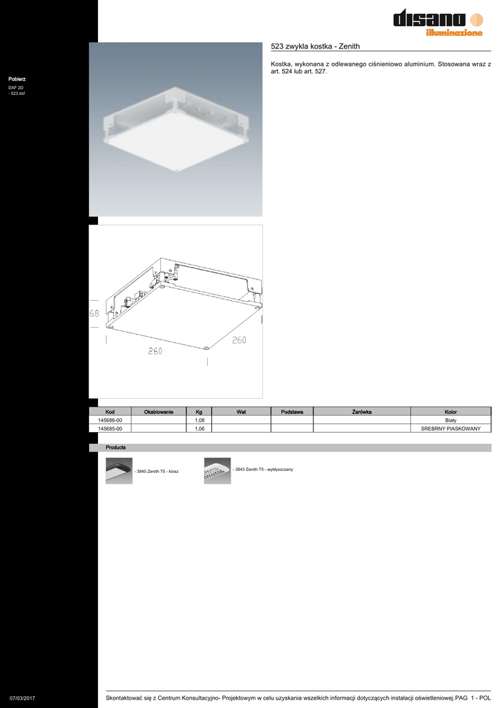523 zwykla kostka - Zenith Kostka, wykonana z odlewanego ciśnieniowo aluminium. Stosowana wraz z art. 524 lub art. 527. Pobierz DXF 2D - 523.dxf Kod Okablowanie Kg Wat Podstawa Źarówka Kolor 145686-00 1,08 Biały 145685-00 1,06 SREBRNY PIASKOWANY Products - 3845 Zenith T5 - klosz 07/03/2017 - 3843 Zenith T5 - wybłyszczany Skontaktować się z Centrum Konsultacyjno- Projektowym w celu uzyskania wszelkich informacji dotyczących instalacji oświetleniowej. PAG 1 - POL