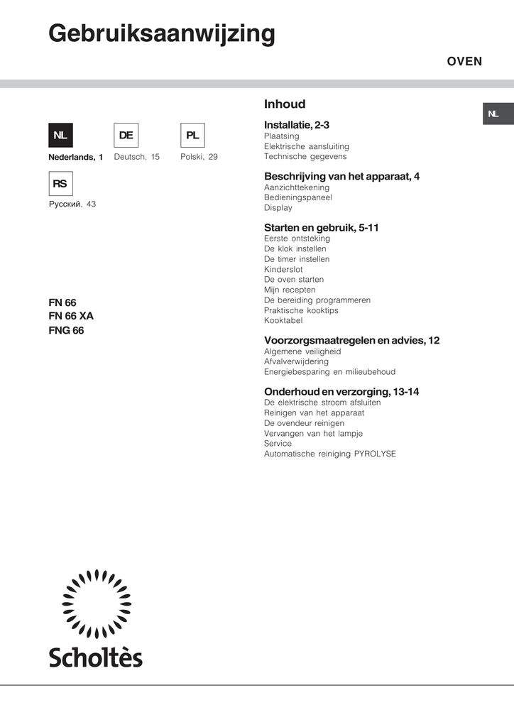 Gebruiksaanwijzing OVEN Inhoud NL Nederlands, 1 RS Ðóññêèé, 43 DE Deutsch, 15 PL Polski, 29 Installatie, 2-3 Plaatsing Elektrische aansluiting Technische gegevens Beschrijving van het apparaat, 4 Aanzichttekening Bedieningspaneel Display Starten en gebruik, 5-11 FN 66 FN 66 XA FNG 66 Eerste ontsteking De klok instellen De timer instellen Kinderslot De oven starten Mijn recepten De bereiding programmeren Praktische kooktips Kooktabel Voorzorgsmaatregelen en advies, 12 Algemene veiligheid Afvalverwijdering Energiebesparing en milieubehoud Onderhoud en verzorging, 13-14 De elektrische stroom afsluiten Reinigen van het apparaat De ovendeur reinigen Vervangen van het lampje Service Automatische reiniging PYROLYSE NL Installatie Bewaar dit instructieboekje zorgvuldig voor eventuele raadpleging in de toekomst. Wanneer u het product weggeeft, verkoopt, of wanneer u verhuist, dient u dit boekje bij het apparaat te bewaren zodat waarschuwingen en informatie betreffende werking voorhanden blijven. Lees de instructies aandachtig door: u vindt er belangrijke informatie betreffende installatie, gebruik en veiligheid. Ventilatie Om een goede ventilatie te kunnen garanderen is het noodzakelijk de achterkant van het meubel te verwijderen. Het dient de voorkeur de oven op twee houten balken te plaatsen of eventueel op een enkele plank die een opening heeft van tenminste 45 x 560 mm ( zie afbeeldingen). Plaatsing 560 mm . 45 m m. Het verpakkingsmateriaal is niet bestemd voor kinderen en dient daarom te worden verwijderd volgens de geldende normen voor gescheiden afvalverzameling (zie Voorzorgsmaatregelen en advies). De installatie moet worden uitgevoerd door een bevoegde installateur en volgens de instructies van de fabrikant. Een verkeerde installatie kan schade berokkenen aan personen, dieren of dingen. Inbouw Voor een goede werking van het apparaat moet het keukenmeubel de juiste kenmerken hebben: de zijkanten van de kastjes die aan de oven grenzen moeten hittebestendig zijn; in het bijzonder moet, in geval van meubels met fineer, de lijm bestand zijn tegen temperaturen van 100°C; voor het inbouwen van de oven, zowel onder het aanrecht (zie figuur) als in stapelbouw, dient het meubel de volgende afmetingen te hebben: 45 m m. Centreren en bevestigen Regel de 4 stelvoetjes aan de zijkant van de oven in overeenkomst met de 4 gaten in de lijst, afhankelijk van de dikte van de zijkant van het meubel: als de dikte 20 mm is: verwijder het regelbare gedeelte van het stelvoetje (zie afbeelding); als de dikte 18 mm is: gebruik de eerste gleuf zoals door de fabriek is voorzien (zie afbeelding); als de dikte 16 mm is: gebruik de tweede gleuf (zie afbeelding). 5 mm. 576 mm. 558 mm . 593 mm. 23 mm. . . min mm 547 595 mm. NL 595 mm 24 545 . mm . mm . Nadat het apparaat is ingebouwd mag er geen contact meer mogelijk zijn met de elektrische onderdelen. Het energieverbruik dat staat aangegeven op het typeplaatje is gebaseerd op dit soort installatie. 2 Om het apparaat aan het keukenkastje te bevestigen: open de ovendeur en schroef de 4 houtschroeven in de 4 gaten in de zijrand. Alle beschermende onderdelen moeten zodanig worden bevestigd dat ze niet kunnen worden verwijderd zonder het gebruik van gereedschap. Elektrische aansluiting De ovens met driepolige voedingskabel werken met de wisselstroom, spanning en frequentie die aangegeven staan op het typeplaatje op het apparaat (zie onder). Monteren voedingskabel 1. Licht de lipjes aan de zijkant van het deksel van de klemmenstrook op met een schroevendraaier: trek het deksel van de klemmenstrook open (zie afb.). N L 2. De voedingskabel in werking stellen: draai de schroef van de kabelklem en de drie schroeven van de contacten L-Nlos, en bevestig de draden onder de schroeven met inachtneming van de kleuren: Blauw (N) Bruin (L) Geel-Groen ( zie afbeelding). 3. Maak de kabel vast aan de daarvoor bestemde kabelklem. 4. Sluit het deksel van de klemmenstrook. Vóór het aansluiten moet u controleren dat: de contactdoos geaard is en voldoet aan de geldende normen; de contactdoos in staat is het maximale vermogen van het apparaat te verdragen, zoals aangegeven op het typeplaatje (zie onder); de spanning zich bevindt tussen de waarden die staan aangegeven op het typeplaatje (zie onder); de contactdoos en de stekker van het apparaat overeenkomen. Als dat niet zo is, dient u ofwel de stekker ofwel de contactdoos te vervangen; gebruik geen verlengsnoeren of dubbelstekkers. Wanneer het apparaat geïnstalleerd is, moeten de elektrische kabel en de contactdoos gemakkelijk te bereiken zijn. De kabel mag niet gebogen of samengedrukt worden. De kabel moet van tijd tot tijd worden gecontroleerd en mag alleen door erkende monteurs worden vervangen (zie Service). De fabrikant kan nergens aansprakelijk voor worden gesteld als deze normen niet worden nageleefd. TYPEPLAATJE Afmetingen breedte 43,5 cm hoogte 32 cm diepte 41,5 cm Inhoud liter 58 Elektrische aansluitingen spanning 220-240V ~ 50Hz maximum opgenomen vermogen 2800W Het aansluiten van de voedingskabel aan het elektrische net Gebruik voor de voedingskabel een stekker die genormaliseerd is voor de lading aangegeven op het typeplaatje( zie hiernaast). Wanneer het apparaat rechtstreeks op het elektriciteitsnet wordt aangesloten moet u tussen het apparaat en het net een meerpolige schakelaar aanbrengen met een afstand tussen de contacten van minstens 3 mm, aangepast aan het elektrische vermogen en voldoend aan de geldende normen (de aarding mag niet worden onderbroken door de schakelaar). De voedingskabel moet zodanig worden geplaatst dat hij nergens een temperatuur bereikt van 50°C hoger dan de kamertemperatuur. De installateur is verantwoordelijk voor een correcte elektrische aansluiting en de inachtneming van de veiligheidsnormen. Richtlijn 2002/40/EG op het etiket van elektrische ovens. Norm EN 50304 ENERGY LABEL Energieverbruik convectie Natuurlijk - verwarmingsfunctie: Traditioneel; Energieverbruikverklaring Klasse geforceerde