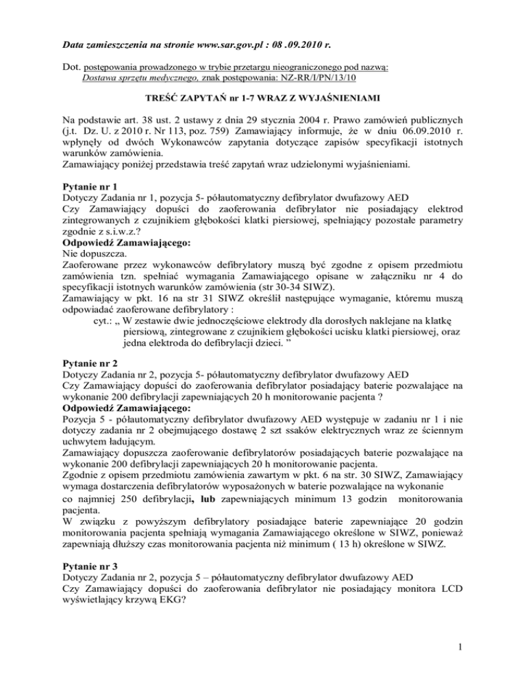 Data zamieszczenia na stronie www.sar.gov.pl : 08 .09.2010 r. Dot. postępowania prowadzonego w trybie przetargu nieograniczonego pod nazwą: Dostawa sprzętu medycznego, znak postępowania: NZ-RR/I/PN/13/10 TREŚĆ ZAPYTAŃ nr 1-7 WRAZ Z WYJAŚNIENIAMI Na podstawie art. 38 ust. 2 ustawy z dnia 29 stycznia 2004 r. Prawo zamówień publicznych (j.t. Dz. U. z 2010 r. Nr 113, poz. 759) Zamawiający informuje, że w dniu 06.09.2010 r. wpłynęły od dwóch Wykonawców zapytania dotyczące zapisów specyfikacji istotnych warunków zamówienia. Zamawiający poniżej przedstawia treść zapytań wraz udzielonymi wyjaśnieniami. Pytanie nr 1 Dotyczy Zadania nr 1, pozycja 5- półautomatyczny defibrylator dwufazowy AED Czy Zamawiający dopuści do zaoferowania defibrylator nie posiadający elektrod zintegrowanych z czujnikiem głębokości klatki piersiowej, spełniający pozostałe parametry zgodnie z s.i.w.z.? Odpowiedź Zamawiającego: Nie dopuszcza. Zaoferowane przez wykonawców defibrylatory muszą być zgodne z opisem przedmiotu zamówienia tzn. spełniać wymagania Zamawiającego opisane w załączniku nr 4 do specyfikacji istotnych warunków zamówienia (str 30-34 SIWZ). Zamawiający w pkt. 16 na str 31 SIWZ określił następujące wymaganie, któremu muszą odpowiadać zaoferowane defibrylatory : cyt.: „ W zestawie dwie jednoczęściowe elektrody dla dorosłych naklejane na klatkę piersiową, zintegrowane z czujnikiem głębokości ucisku klatki piersiowej, oraz jedna elektroda do defibrylacji dzieci. ” Pytanie nr 2 Dotyczy Zadania nr 2, pozycja 5- półautomatyczny defibrylator dwufazowy AED Czy Zamawiający dopuści do zaoferowania defibrylator posiadający baterie pozwalające na wykonanie 200 defibrylacji zapewniających 20 h monitorowanie pacjenta ? Odpowiedź Zamawiającego: Pozycja 5 - półautomatyczny defibrylator dwufazowy AED występuje w zadaniu nr 1 i nie dotyczy zadania nr 2 obejmującego dostawę 2 szt ssaków elektrycznych wraz ze ściennym uchwytem ładującym. Zamawiający dopuszcza zaoferowanie defibrylatorów posiadających baterie pozwalające na wykonanie 200 defibrylacji zapewniających 20 h monitorowanie pacjenta. Zgodnie z opisem przedmiotu zamówienia zawartym w pkt. 6 na str. 30 SIWZ, Zamawiający wymaga dostarczenia defibrylatorów wyposażonych w baterie pozwalające na wykonanie co najmniej 250 defibrylacji, lub zapewniających minimum 13 godzin monitorowania pacjenta. W związku z powyższym defibrylatory posiadające baterie zapewniające 20 godzin monitorowania pacjenta spełniają wymagania Zamawiającego określone w SIWZ, ponieważ zapewniają dłuższy czas monitorowania pacjenta niż minimum ( 13 h) określone w SIWZ. Pytanie nr 3 Dotyczy Zadania nr 2, pozycja 5 – półautomatyczny defibrylator dwufazowy AED Czy Zamawiający dopuści do zaoferowania defibrylator nie posiadający monitora LCD wyświetlający krzywą EKG? 1 Odpowiedź Zamawiającego: Pozycja 5 – półautomatyczny defibrylator dwufazowy AED występuje w zadaniu nr 1. Zamawiający nie dopuszcza zaoferowania defibrylatorów nie posiadających monitora LCD wyświetlającego krzywą EKG. Zgodnie z opisem przedmiotu zamówienia zawartym w pkt. 3 na str. 30 SIWZ, Zamawiający wymaga dostarczenia defibrylatorów wyposażonych w monitor LCD wyświetlający krzywą EKG, czas od włączenia defibrylatora, ilość wykonanych defibrylacji. Pytanie nr 4 Dotyczy Zadania nr 2, pozycja 5 – półautomatyczny defibrylator dwufazowy AED Czy Zamawiający dopuści do zaoferowania defibrylator posiadający odporność na działanie wody IP54 (kurz/woda) zgodnie z IEC 60529? Odpowiedź Zamawiającego: Pozycja 5 – półautomatyczny defibrylator dwufazowy AED stanowi element zadania nr 1. Zamawiający nie dopuszcza zaoferowania defibrylatorów posiadających odporność na działanie wody IP54 zgodnie z IEC 60529. Zgodnie z opisem przedmiotu zamówienia zawartym w pkt. 20 na str. 32 SIWZ, Zamawiający wymaga dostarczenia defibrylatorów odpornych na: - działanie wody (minimum IPX5 wg IEC 529), - temperaturę (praca w min. 0-50ºC), - uderzenia i wstrząsy. Pytanie nr 5 Czy Zamawiający dopuści do zaoferowania defibrylator posiadający baterie pozwalające na wykonanie 250 defibrylacji zapewniający 9 h monitorowanie pacjenta? Odpowiedź Zamawiającego: Zamawiający dopuszcza zaoferowanie defibrylatorów posiadających baterie pozwalające na wykonanie 250 defibrylacji zapewniających 9 h monitorowanie pacjenta. Zgodnie z opisem przedmiotu zamówienia zawartym w pkt. 6 na str. 30 SIWZ, Zamawiający wymaga dostarczenia defibrylatorów wyposażonych w baterie pozwalające na wykonanie co najmniej 250 defibrylacji, lub zapewniających minimum 13 godzin monitorowania pacjenta. W związku z powyższym defibrylatory posiadające baterie pozwalające na wykonanie 250 defibrylacji spełniają wymaganie Zamawiającego określone w SIWZ. Pytanie nr 6 Czy Zamawiający dopuści do zaoferowania na zasadzie równoważności respirator, który posiada regulację stężenia tlenu w zakresie 60 lub 65%? Parametr ten w respiratorach zasilanych pneumatycznie wykorzystujących tzw. zwężkę Venturiego jest zależny od aktualnie ustawionych parametrów oddechowych dla pacjentazakres ten może się wahać nawet do 85% tlenu i jest niezależny od żądania Użytkownika. Osoba obsługująca respirator nie ma wpływu na ustawioną wartość. Może tylko na podstawie tabelki dołączonej do instrukcji obsługi dowiedzieć się jakie uzyska stężenie tlenu w mieszaninie oddechowej dla ustawionych ilości oddechów oraz objętości pojedynczego oddechu. Odpowiedź Zamawiającego: Nie dopuszcza. Zaoferowane przez wykonawców respiratory muszą być zgodne z opisem przedmiotu zamówienia tzn. spełniać wymagania Zamawiającego opisane w załączniku nr 4 do specyfikacji istotnych warunków zamówienia (str 34-36 SIWZ). Zaoferowane przez wykonawców respiratory muszą spełniać wymaganie Zamawiającego określone w pkt. 10