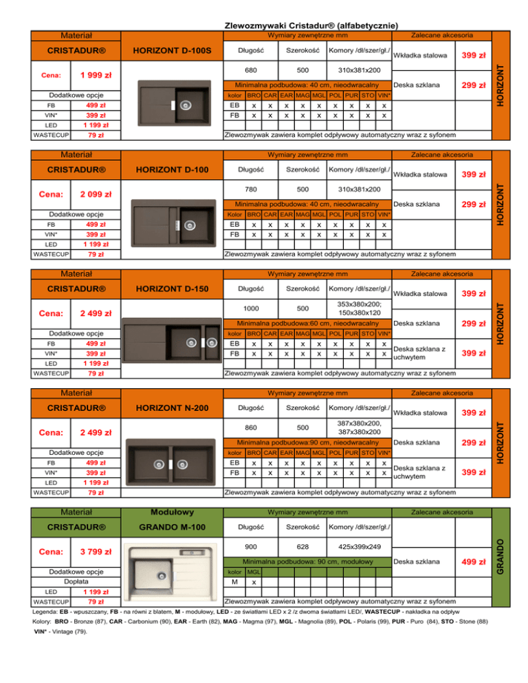 Zlewozmywaki Cristadur® (alfabetycznie) HORIZONT D-100S Długość Szerokość Komory /dł/szer/gł./ 680 500 310x381x200 1 999 zł Minimalna podbudowa: 40 cm, nieodwracalny Dodatkowe opcje FB 499 zł EB 399 zł FB LED 1 199 zł WASTECUP 79 zł x x x x x x x x x x x x x x x x Zalecane akcesoria Długość Szerokość Komory /dł/szer/gł./ 780 500 310x381x200 Minimalna podbudowa: 40 cm, nieodwracalny FB 499 zł EB 399 zł FB LED 1 199 zł WASTECUP 79 zł x x x x x x x x x x x x x x x x Zalecane akcesoria Szerokość Komory /dł/szer/gł./ 500 353x380x200; 150x380x120 1000 Minimalna podbudowa:60 cm, nieodwracalny FB 499 zł EB 399 zł FB LED 1 199 zł WASTECUP 79 zł x x x x x x x x x x x x x x x x Długość HORIZONT N-200 Komory /dł/szer/gł./ 500 387x380x200, 387x380x200 Minimalna podbudowa:90 cm, nieodwracalny Wkładka stalowa 399 zł Deska szklana 299 zł kolor BRO CAR EAR MAG MGL POL PUR STO VIN* FB 499 zł EB VIN* 399 zł FB LED 1 199 zł WASTECUP 79 zł x x x x x x x x x x x x x x x x x Deska szklana z x uchwytem 399 zł Zlewozmywak zawiera komplet odpływowy automatyczny wraz z syfonem Materiał Modułowy CRISTADUR® GRANDO M-100 Wymiary zewnętrzne mm 3 799 zł Długość Szerokość Komory /dł/szer/gł./ 900 628 425x399x249 Minimalna podbudowa: 90 cm, modułowy 79 zł 399 zł Zalecane akcesoria Szerokość 860 Dodatkowe opcje WASTECUP 299 zł x Deska szklana z x uchwytem Wymiary zewnętrzne mm 2 499 zł 1 199 zł Deska szklana Zlewozmywak zawiera komplet odpływowy automatyczny wraz z syfonem Materiał LED 399 zł kolor BRO CAR EAR MAG MGL POL PUR STO VIN* VIN* Dopłata Wkładka stalowa Zalecane akcesoria Deska szklana 499 zł kolor MGL M x Zlewozmywak zawiera komplet odpływowy automatyczny wraz z syfonem Legenda: EB - wpuszczany, FB - na równi z blatem, M - modułowy, LED - ze światłami LED x 2 /z dwoma światłami LED/, WASTECUP - nakładka na odpływ Kolory: BRO - Bronze (87), CAR - Carbonium (90), EAR - Earth (82), MAG - Magma (97), MGL - Magnolia (89), POL - Polaris (99), PUR - Puro (84), STO - Stone (88) VIN* - Vintage (79). HORIZONT Długość HORIZONT D-150 Dodatkowe opcje Dodatkowe opcje 299 zł x x Wymiary zewnętrzne mm 2 499 zł Cena: Deska szklana Zlewozmywak zawiera komplet odpływowy automatyczny wraz z syfonem Materiał Cena: 399 zł Kolor BRO CAR EAR MAG MGL POL PUR STO VIN* VIN* CRISTADUR® Wkładka stalowa HORIZONT HORIZONT D-100 Dodatkowe opcje Cena: 299 zł x x Wymiary zewnętrzne mm 2 099 zł CRISTADUR® Deska szklana Zlewozmywak zawiera komplet odpływowy automatyczny wraz z syfonem Materiał Cena: 399 zł kolor BRO CAR EAR MAG MGL POL PUR STO VIN* VIN* CRISTADUR® Wkładka stalowa HORIZONT Cena: Zalecane akcesoria GRANDO CRISTADUR® Wymiary zewnętrzne mm HORIZONT Materiał CRISTADUR® Cena: Wymiary zewnętrzne mm LOTUS D-100 Zalecane akcesoria Długość Szerokość Komory /dł/szer/gł./ 880 500 348x388x192 1 999 zł Minimalna podbudowa: 50 cm, odwracalny Dodatkowe opcje VIN* 399 zł LED 1 199 zł WASTECUP 79 zł Deska szklana 299 zł Koszyk chromowy 187 zł kolor BRO CAR EAR MAG MGL POL PUR STO VIN* EB x x x x x x x x LOTUS Materiał x Zlewozmywak zawiera komplet odpływowy automatyczny wraz z syfonem CRISTADUR® Cena: Wymiary zewnętrzne mm LOTUS D-150 Długość Szerokość Komory /dł/szer/gł./ 500 348x388x192; 149x284x120 1020 2 199 zł Zalecane akcesoria Minimalna podbudowa: 60 cm, odwracalny Dodatkowe opcje VIN* 399 zł LED 1 199 zł WASTECUP 79 zł Wkładka stalowa 399 zł Deska szklana 299 zł Koszyk chromowy 187 zł kolor BRO CAR EAR MAG MGL POL PUR STO VIN* EB x x x x x x x x LOTUS Materiał x Zlewozmywak zawiera komplet odpływowy automatyczny wraz z syfonem CRISTADUR® Cena: Wymiary zewnętrzne mm LOTUS C-150 Długość Szerokość Komory /dł/szer/gł./ 575 369x463x192; 233x307x110 1082 2 399 zł Zalecane akcesoria Minimalna podbudowa: 90 cm, nieodwracalny Dodatkowe opcje VIN* 399 zł LED 1 199 zł WASTECUP 79 zł Wkładka stalowa 399 zł Deska drewniana 299 zł Koszyk chromowy 187 zł kolor BRO CAR EAR MAG MGL POL PUR STO VIN* EB x x x x x x x x LOTUS Materiał x Zlewozmywak zawiera komplet odpływowy automatyczny wraz z syfonem CRISTADUR® Cena: Wymiary zewnętrzne mm MODENA D-100 Zalecane akcesoria Długość Szerokość Komory /dł/szer/gł./ 860 500 331x433x200 1 599 zł Minimalna podbudowa: 45 cm, odwracalny Dodatkowe opcje LED 1 199 zł WASTECUP 79 zł Deska szklana 299 zł kolor BRO CAR EAR MAG MGL POL PUR STO VIN EB x x x x x x x x - MODENA Materiał Zlewozmywak zawiera komplet odpływowy automatyczny wraz z syfonem CRISTADUR® Cena: Wymiary zewnętrzne mm MODENA D-150 Długość Szerokość 502 332x429x200/ 163x304x150 997 1 799 zł Zalecane akcesoria Komory /dł/szer/gł./mm Minimalna podbudowa:60 cm, odwracalny Dodatkowe opcje LED 1 199 zł WASTECUP 79 zł Wkładka akrylowa 199 zł Deska szklana 299 zł kolor BRO CAR EAR MAG MGL POL PUR STO VIN EB x x x x x x x x - Zlewozmywak zawiera komplet odpływowy automatyczny wraz z syfonem Legenda: EB - wpuszczany, FB - na równi z blatem, LED - ze światłami LED x 2 /z dwoma światłami LED/, WASTECUP - nakładka na odpływ Kolory: BRO - Bronze (87), CAR - Carbonium (90), EAR - Earth (82), MAG - Magma (97), MGL - Magnolia (89), POL - Polaris (99), PUR - Puro (84), STO - Stone (88) VIN* - Vintage (79). MODENA Materiał Długość Szerokość 740 510 340x440x200 1 699 zł Minimalna podbudowa: 45 cm, odwracalny Dodatkowe opcje 399 zł LED 1 199 zł WASTECUP 79 zł EB/FB x Cena: x x x x x x EB/FB x x Zlewozmywak zawiera komplet odpływowy automatyczny wraz z syfonem Materiał CRISTADUR® x kolor ROU* VIN* Wymiary zewnętrzne mm MONO D-100 Zalecane akcesoria Długość Szerokość Komory /dł/szer/gł./mm 765 510 385x440x200 1 799 zł Minimalna podbudowa: 50 cm, odwracalny Dodatkowe opcje FB 499 zł ROU*,VIN* 399 zł LED 1 199 zł WASTECUP 79 zł EB/FB x Cena: x x x x x x x EB/FB x x Zlewozmywak zawiera komplet odpływowy automatyczny wraz z syfonem Wymiary zewnętrzne mm MONO D-1