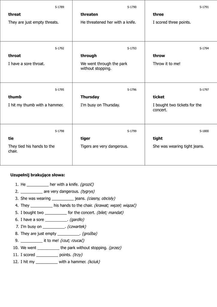 S-1789 S-1790 S-1791 threat threaten three They are just empty threats. He threatened her with a knife. I scored three points. S-1792 S-1793 S-1794 throat through throw I have a sore throat. We went through the park without stopping. Throw it to me! S-1795 S-1796 S-1797 thumb Thursday ticket I hit my thumb with a hammer. I’m busy on Thursday. I bought two tickets for the concert. S-1798 S-1799 S-1800 tie tiger tight They tied his hands to the chair. Tigers are very dangerous. She was wearing tight jeans. Uzupełnij brakujące słowa: 1. He __________ her with a knife. (grozić) 2. __________ are very dangerous. (tygrys) 3. She was wearing __________ jeans. (ciasny, obcisły) 4. They __________ his hands to the chair. (krawat; węzeł; wiązać) 5. I bought two __________ for the concert. (bilet; mandat) 6. I have a sore __________. (gardło) 7. I’m busy on __________. (czwartek) 8. They are just empty __________. (groźba) 9. __________ it to me! (rzut; rzucać) 10. We went __________ the park without stopping. (przez) 11. I scored __________ points. (trzy) 12. I hit my __________ with a hammer. (kciuk) S-1791 S-1790 S-1789 trzy grozić groźba Zdobyłem trzy punkty. Groził jej nożem. To są tylko puste groźby. www.isel.edu.pl www.isel.edu.pl www.isel.edu.pl S-1794 S-1793 S-1792 rzut; rzucać przez gardło Rzuć mi to! Przeszliśmy przez park nie zatrzymując się. Mam chore gardło. www.isel.edu.pl www.isel.edu.pl www.isel.edu.pl S-1797 S-1796 S-1795 bilet; mandat czwartek kciuk Kupiłem dwa bilety na koncert. W czwartek jestem zajęty. Uderzyłem się młotkiem w kciuk. www.isel.edu.pl www.isel.edu.pl www.isel.edu.pl S-1800 S-1799 S-1798 ciasny, obcisły tygrys krawat; węzeł; wiązać Miała na sobie obcisłe dżinsy. Tygrysy są bardzo niebezpieczne. Przywiązali mu ręce do krzesła. www.isel.edu.pl Odpowiedzi: 1. threatened 2. Tigers 3. tight 4. tied 5. tickets 6. throat 7. Thursday 8. threats 9. Throw 10. through 11. three 12. thumb www.isel.edu.pl www.isel.edu.pl