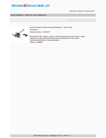 Utworzono: wtorek, 07 marzec 2017 Zamki meblowe > Zamki do szaf metalowych Zamek do szaf metalowych T-1801 chrom Nazwa produktu: Zamek do szaf metalowych T-1801 chrom Producent: Model produktu: 14.08.057-0 Zamek Siso 1801, korpus, uchwyt i cylinder wykonane ze znalu. Klucz i rygiel wykonane ze stali. 400 kombinacji klucza. Stosowany do szaf, szafek metalowychschowków, drzwi garażowych. Cena: 14.80zł http://sklepzokuciami.pl | [email protected] | | Strona 1/1