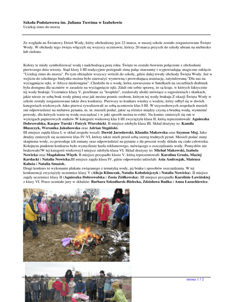 Szkoła Podstawowa im. Juliana Tuwima w Izabelowie Uciekaj zimo do morza Ze względu na Światowy Dzień Wody, który obchodzony jest 22 marca, w naszej szkole zostało zorganizowane Święto Wody. W obchody tego święta włączyli się wszyscy uczniowie, którzy 20 marca przyszli do szkoły ubrani na niebiesko lub zielono. Kolory te miały symbolizować wodę i nadchodzącą porę roku. Święto to zostało bowiem połączone z obchodami pierwszego dnia wiosny. Stąd klasy I-III tradycyjnie pożegnali zimę paląc marzanny i wypowiadając magiczne zaklęcie "Uciekaj zimo do morza". Po tym obrzędzie wszyscy wrócili do szkoły, gdzie dalej trwały obchody Święta Wody. Już w wejściu do szkolnego budynku można było zauważyć wymowną i prowokującą aranżację, zatytułowaną "Dla nas na wyciągnięcie ręki, w Afryce niedostępna". Chodziło tu o wodę, która zawieszona w butelkach na szczeblach drabinek była dostępna dla uczniów w zasadzie na wyciągnięcie ręki. Zdali oni sobie sprawę, że są kraje, w których faktycznie tej wody brakuje. Uczennice klasy V, przebrane za "kropleki", rozdawały ulotki mówiące o zagrożeniach i skutkach, jakie niesie ze sobą brak wody pitnej oraz jak można pomóc osobom, którym tej wody brakuje.Z okazji Święta Wody w szkole zostały zorganizowane także dwa konkursy. Pierwszy to konkurs wiedzy o wodzie, który odbył się w dwóch kategoriach wiekowych. Jako pierwsi rywalizowali ze sobą uczniowie klas I-III. W trzyosobowych zespołach musieli oni odpowiedzieć na niełatwe pytania, m. in. musieli podać, jakie są różnice między czystą a brudną wodą, wymienić powody, dla których warto tę wodę oszczędzać i w jaki sposób można to robić. Na koniec zmierzyli się oni w wyścigach papierowych statków.W kategorii wiekowej klas I-III zwyciężyła klasa II, którą reprezentowali: Agnieszka Dobrowolska, Kacper Turski i Patryk Wierzbicki. II miejsce zdobyła klasa III. Skład drużyny to: Kamila Błaszczyk, Weronika Jakubowska oraz Adrian Stępiński. III miejsce zajęła klasa I, w skład zespołu weszli: Dawid Jarosławski, Klaudia Makowska oraz Szymon Moj. Jako drudzy zmierzyli się uczniowie klas IV-VI, którzy także mieli przed sobą szereg trudnych pytań. Musieli podać stany skupienia wody, co powoduje ich zmiany oraz odpowiedzieć na pytanie z ilu procent wody składa się ciało człowieka. Kolejnym punktem konkursu było wymyślenie hasła reklamowego, mówiącego o oszczędzaniu wody. Pomysłów nie brakowało!W tej kategorii wiekowej I miejsce zdobyła klasa VI. Skład drużyny to: Michał Makowski, Izabela Nowicka oraz Magdalena Więch. II miejsce przypadło klasie V, którą reprezentowali: Karolina Gruda, Maciej Kardacki i Natalia Nowicka.III miejsce zajęła klasa IV, gdzie odpowiedzi udzielali: Asia Andrzejak, Mateusz Kałuża i Natalia Smażek. Drugi konkurs to wykonanie plakatu związanego z tematyką wody, jej braku i sposobów oszczędzania. W tej konkurencji zwyciężyły uczennice klasy V (Alicja Klimczak, Natalia Kołodziejczyk i Natalia Nowicka). II miejsce zajęły uczennice klasy II (Agnieszka Dobrowolska i Zosia Ziółkowska). III miejsce przypadło Karolinie Ławińskiej z klasy VI. Prace oceniało jury w składzie: Barbara Szkudlarek-Bielecka, Zdzisława Budka i Anna Łazuchiewicz. strona 1 / 2 Szkoła Podstawowa im. Juliana Tuwima w Izabelowie Uciekaj zimo do morza strona 2 / 2