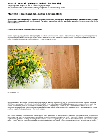 Dom.pl | Montaż i pielęgnacja deski barlineckiej Copyright DOM.pl Sp. z o.o. - [email protected] http://www.dom.pl/montaz-i-pielegnacja-deski-barlineckiej.html Montaż i pielęgnacja deski barlineckiej Dziś postaramy się przybliżyć kwestie dotyczące montażu, pielęgnacji, a także dobrania odpowiedniego gatunku drewna do poszczególnych pomieszczeń. Ponadto, wyjaśnimy różnicę pomiędzy panelami laminowanymi a deską trójwarstwową. Panele laminowane a deska trójwarstwowa Często pojawiają się pytania o różnicę między panelami laminowanymi a deską trójwarstwową. Najprościej mówiąc panele to wyrób sztuczny, składający się z przetworzonych wiórów i warstwy naprasowanego papieru, natomiast podłogi warstwowe – m.in. deska barlinecka to produkt wykonany z naturalnego drewna. fot. Barlinek SA Długo można by wymieniać zalety naturalnego drewna, dlatego warto skupić się na tych najważniejszych. Drewno oddycha, dzięki czemu reguluje mikroklimat domów i mieszkań, absorbuje wilgotność i oddaje ją z powrotem, gdy powietrze staje się suche. Dodatkowo, jonizuje powietrze, nie elektryzuje się i nie przyciąga kurzu, co jest szczególnie ważne dla osób ze skłonnościami do alergii. Ponadto, drewniane posadzki gwarantują izolację termiczną pomieszczenia - odczuwaną jako ciepła podłoga oraz izolację akustyczną – tłumienie hałasu. Jeśli chodzi o podłogi trójwarstwowe, to cechuje je duża odporność na odkształcenia. Specjalna konstrukcja deski barlineckiej i zastosowane w niej zatrzaskowe złącze umożliwia naturalną pracę drewna (pęcznienie i kurczenie). Dzięki tym właściwościom i optymalnej grubości, podłoga może być układana na ogrzewaniu podłogowym. Atutem deski barlineckiej jest również szybki, łatwy i czysty montaż. Układając podłogę samodzielnie można oszczędzić czas i pieniądze związane z wynajęciem fachowca. page 1 / 3 Dom.pl | Montaż i pielęgnacja deski barlineckiej Copyright DOM.pl Sp. z o.o. - [email protected] http://www.dom.pl/montaz-i-pielegnacja-deski-barlineckiej.html fot. Barlinek SA Gatunek drewna Przede wszystkim należy pamiętać, że do miejsc o większym natężeniu ruchu jak np. pokoje dzienne, najlepsze są podłogi wykonane z twardych gatunków, m.in.: buk, jesion czy grab lub deski egzotyczne. Tańsze drewno o niższych parametrach – klon, brzoza, olcha – dobrze sprawdza się w sypialniach. Do pomieszczeń i miejsc intensywnie używanych, takich jak przedpokoje, korytarze czy schody, warto zakupić najtwardsze drewno egzotyczne, np. merbau, iroko czy padouk. Kilka słów o montażu Po pierwsze, po przywiezieniu deski barlineckiej do domu, należy ją aklimatyzować przez min. 48 h. Montaż rozpoczynamy od rozłożenia podkładu, np. tektury falistej albo maty korkowej. Pierwszą deskę układamy piórem do ściany a potem poszczególne deski łączymy na krótszych krawędziach, czyli czołach. Ostatnią deskę przycinamy. Kolejny pas desek układamy zaczynając od tego przyciętego kawałka, pod warunkiem, że nie jest on krótszy niż 50 cm. Pamiętajmy, by łączenia na krótszych krawędziach desek były oddalone od siebie o min. 50 cm w sąsiadujących pasach podłogi. Układanie ostatniego pasa rozpoczynamy od zmierzenia przestrzeni między ścianą a ułożoną przez nas podłogą. Jeśli okaże się, że nie zmieści się cała szerokość deski, odcinamy odpowiedni fragment. Między ścianą a podłogą trzeba zostawić ok. 1-1,5 cm luzu. Po ułożeniu podłogi kładziemy listwy przyścienne. Dostępne są one w wielu wybarwieniach, kolorach i profilach. page 2 / 3 Dom.pl | Montaż i pielęgnacja deski barlineckiej Copyright DOM.pl Sp. z o.o. - [email protected] http://www.dom.pl/montaz-i-pielegnacja-deski-barlineckiej.html fot. Barlinek SA W przypadku ogrzewania podłogowego, zamiast montażu pływającego, zalecane jest przyklejanie deski do podłoża. Deska barlinecka ma odpowiednią grubość warstwy spodniej, więc nie stanowi to problemu. Na ogrzewaniu podłogowym zalecane jest stosowanie gatunków drewna o niskim współczynniku skurczu i rozkurczu, z długim czasem osiągania równowagi higroskopijnej. Takie właściwości posiadają gatunki egzotyczne: merbau, iroko, doussie, jatobe, a także rodzimy dąb i akacja. Przed samym montażem, nie należy zapomnieć o wygrzewaniu podłogi. W tym przypadku lepiej skorzystać z usług kompetentnych montażystów. Pielęgnacja Dla ochrony drewnianej podłogi przed działaniem piasku, wody i soli, warto ułożyć maty ochronne przed wejściem do domu. Środki do pielęgnacji należy dobrać w zależności od rodzaju powierzchni. page 3 / 3