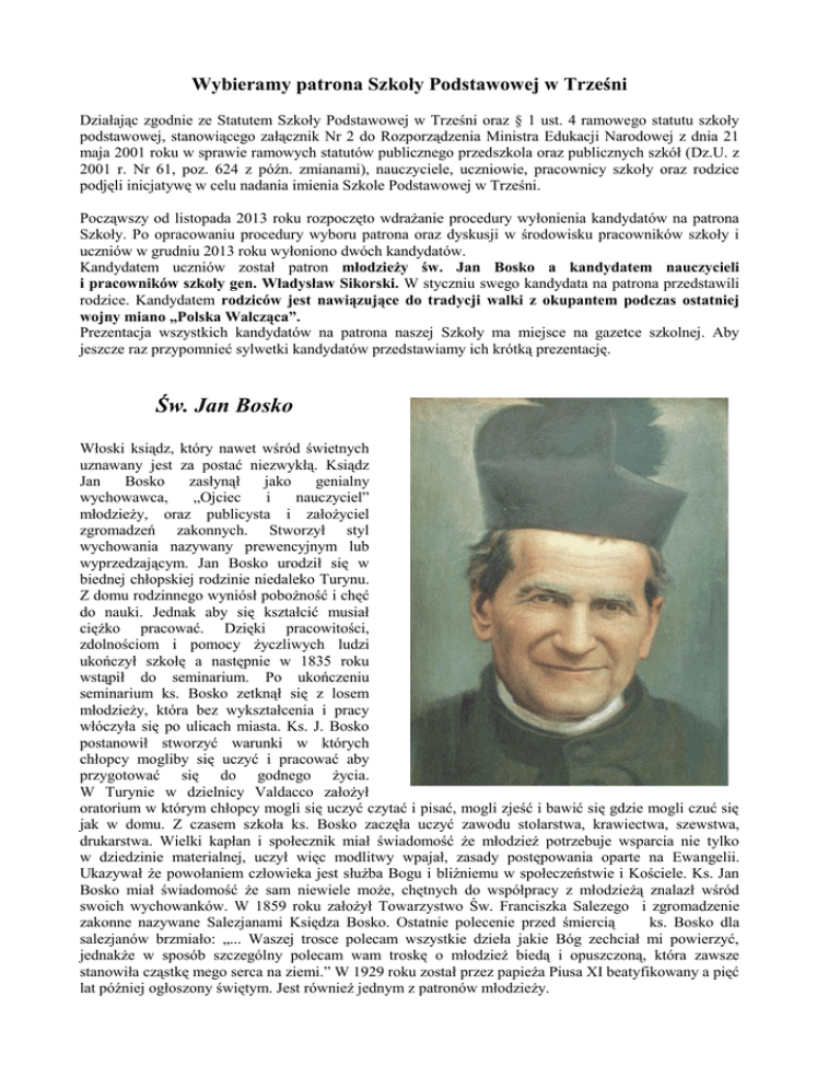 Wybieramy patrona Szkoły Podstawowej w Trześni Działając zgodnie ze Statutem Szkoły Podstawowej w Trześni oraz § 1 ust. 4 ramowego statutu szkoły podstawowej, stanowiącego załącznik Nr 2 do Rozporządzenia Ministra Edukacji Narodowej z dnia 21 maja 2001 roku w sprawie ramowych statutów publicznego przedszkola oraz publicznych szkół (Dz.U. z 2001 r. Nr 61, poz. 624 z późn. zmianami), nauczyciele, uczniowie, pracownicy szkoły oraz rodzice podjęli inicjatywę w celu nadania imienia Szkole Podstawowej w Trześni. Począwszy od listopada 2013 roku rozpoczęto wdrażanie procedury wyłonienia kandydatów na patrona Szkoły. Po opracowaniu procedury wyboru patrona oraz dyskusji w środowisku pracowników szkoły i uczniów w grudniu 2013 roku wyłoniono dwóch kandydatów. Kandydatem uczniów został patron młodzieży św. Jan Bosko a kandydatem nauczycieli i pracowników szkoły gen. Władysław Sikorski. W styczniu swego kandydata na patrona przedstawili rodzice. Kandydatem rodziców jest nawiązujące do tradycji walki z okupantem podczas ostatniej wojny miano „Polska Walcząca”. Prezentacja wszystkich kandydatów na patrona naszej Szkoły ma miejsce na gazetce szkolnej. Aby jeszcze raz przypomnieć sylwetki kandydatów przedstawiamy ich krótką prezentację. Św. Jan Bosko Włoski ksiądz, który nawet wśród świetnych uznawany jest za postać niezwykłą. Ksiądz Jan Bosko zasłynął jako genialny wychowawca, „Ojciec i nauczyciel” młodzieży, oraz publicysta i założyciel zgromadzeń zakonnych. Stworzył styl wychowania nazywany prewencyjnym lub wyprzedzającym. Jan Bosko urodził się w biednej chłopskiej rodzinie niedaleko Turynu. Z domu rodzinnego wyniósł pobożność i chęć do nauki. Jednak aby się kształcić musiał ciężko pracować. Dzięki pracowitości, zdolnościom i pomocy życzliwych ludzi ukończył szkołę a następnie w 1835 roku wstąpił do seminarium. Po ukończeniu seminarium ks. Bosko zetknął się z losem młodzieży, która bez wykształcenia i pracy włóczyła się po ulicach miasta. Ks. J. Bosko postanowił stworzyć warunki w których chłopcy mogliby się uczyć i pracować aby przygotować się do godnego życia. W Turynie w dzielnicy Valdacco założył oratorium w którym chłopcy mogli się uczyć czytać i pisać, mogli zjeść i bawić się gdzie mogli czuć się jak w domu. Z czasem szkoła ks. Bosko zaczęła uczyć zawodu stolarstwa, krawiectwa, szewstwa, drukarstwa. Wielki kapłan i społecznik miał świadomość że młodzież potrzebuje wsparcia nie tylko w dziedzinie materialnej, uczył więc modlitwy wpajał, zasady postępowania oparte na Ewangelii. Ukazywał że powołaniem człowieka jest służba Bogu i bliźniemu w społeczeństwie i Kościele. Ks. Jan Bosko miał świadomość że sam niewiele może, chętnych do współpracy z młodzieżą znalazł wśród swoich wychowanków. W 1859 roku założył Towarzystwo Św. Franciszka Salezego i zgromadzenie zakonne nazywane Salezjanami Księdza Bosko. Ostatnie polecenie przed śmiercią ks. Bosko dla salezjanów brzmiało: „... Waszej trosce polecam wszystkie dzieła jakie Bóg zechciał mi powierzyć, jednakże w sposób szczególny polecam wam troskę o młodzież biedą i opuszczoną, która zawsze stanowiła cząstkę mego serca na ziemi.” W 1929 roku został przez papieża Piusa XI beatyfikowany a pięć lat później ogłoszony świętym. Jest również jednym z patronów młodzieży. Generał Władysław Sikorski Urodzony 20 maja 1881 roku w Tuszowie Narodowym koło Mielca. W czasie pierwszej wojny światowej i służby w Legionach współpracownik Józefa Piłsudskiego, choć obaj bardzo się różnili. Po zakończeniu wojny był jednym z organizatorów obrony Lwowa przed Ukraińcami w 1918 roku. Mianowany w 1920 roku generałem był jednym z pierwszych generałów odrodzonej Rzeczpospolitej. Podczas wojny polsko-bolszewickiej dowodził 5 armią przyczyniając się w dużym stopniu do zwycięstwa w bitwie warszawskiej nad bolszewikami. Po zakończeniu wojny pełnił ważne stanowisko szefa Sztaby Generalnego Wojska Polskiego. Już wtedy dał się poznać jako przewidujący taktyk wojskowy, opracowując między innymi obszerne studium dotyczące roli lotnictwa w przyszłej wojnie. Po zamachu majowym Józefa Piłsudskiego odsunięty od ważnych stanowisk wojskowych i politycznych. W 1939 roku po upadku Polski przy poparciu Francji został premierem rządu, ministrem spraw wojskowych i wodzem naczelnym. Dzięki jego staraniom utworzono Armię Polską we Francji. Po ataku Niemiec na ZSRR w 1941 roku sprawą palącą stało się nawiązanie stosunków ze Związkiem Radzieckim, zerwanych po agresji ZSRR na Polskę w 1939 roku. Pomimo licznych głosów sprzeciwiających się takim rokowaniom, mając na względzie los prawie 1,5 mln Polaków zesłanych w głąb ZSRR, gen. Sikorski podjął rokowania które doprowadziły do podpisania układu Sikorski –Majski w 1941 roku. Na mocy postanowień tego układu z łagrów zaczęto zwalniać Polaków oraz rozpoczęto tworzenie Armii Polskiej. W 1943 roku polskim środowiskiem emigracyjnym wstrząsnęła wiadomość o odkryciu masowych grobów polskich oficerów w Katyniu. Niestety w miesiąc później generał Władysław Sikorski zginął tragicznie w katastrofie lotniczej w Gibraltarze w niewyjaśnionych do dziś okolicznościach. Po odzyskaniu pełniej niepodległości po 1989 roku jego ciało zostało sprowadzone z Anglii i spoczywa na Wawelu. „Polska Walcząca” Określenie „Polska Walcząca” symbolizuje walkę Polaków z okupantem niemieckim i radzieckim w okresie drugiej wojny światowej. Symbolem tej walki była malowana na murach polskich miast kotwica, której człon w kształcie litery P symbolizuje Polskę, a ramiona literę W – walkę. Kotwica przypominała Polakom ze Polska walczy i była symbolem niepodległości. Twórcami przedstawień znaku „kotwicy walczącej” byli harcerze z 