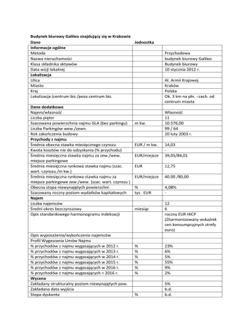 Budynek biurowy Galileo znajdujący się w Krakowie Dane Jednostka Informacje ogólne Metoda Nazwa nieruchomości Klasa składnika aktywów Data wizji lokalnej Lokalizacja Ulica Miasto Kraj Lokalizacja (centrum biz./poza centrum biz. Dane dodatkowe Najem/własność Liczba pięter Szacowana powierzchnia najmu GLA (bez parkingu) Liczba Parkingów wew./zewn. Rok zakończenia budowy Przychody z najmu Średnia obecna stawka miesięcznego czynszu Kwota kosztów nie do odzyskania (% przychodu) Średnia miesięczna stawka najmu za zew./wew. miejsce parkingowe Średnia miesięczna rynkowa stawka najmu (szac. wart. czynszu /m kw.) Średnia miesięczna rynkowa stawka najmu za miejsce parkingowe zew./wew. (szac. wart. czynszu ) Obecna stopa niewynajętych powierzchni Szacowany roczny poziom wydatków kapitałowych Najem Liczba najemców Średni okres bezczynszowy Opis standardowego harmonogramu indeksacji Opis wyposażenia/wykończenia najemców Profil Wygaszania Umów Najmu % przychodów z najmu wygasających w 2012 r. % przychodów z najmu wygasających w 2013 r. % przychodów z najmu wygasających w 2014 r. % przychodów z najmu wygasających w 2015 r. % przychodów z najmu wygasających w 2016 r. % przychodów z najmu wygasających > 2016 r. Wycena Zakładany strukturalny poziom niewynajętych pow. Zakładana data wyjścia Stopa dyskonta m kw. EUR / m kw. Przychodowa budynek biurowy Galileo Budynek biurowy 10 stycznia 2012 r. Al. Armii Krajowej Kraków Polska Ok. 3 km na płn. –zach. od centrum miasta Własność 11 10.576,00 99 / 64 20 luty 2003 r. EUR/miejsce 14,03 39,05/84,01 EUR 12,75 EUR/miejsce 40.00 /80,00 % tys. EUR 4,08% - miesiąc 12 6 roczny EUR HICP (Zharmonizowany wskaźnik cen konsumpcyjnych strefy euro) % % % % % % 23% 6% 5% 55% 9% 2% % 5% b.d. b.d. Prognozowana stopa kapitalizacji wyjścia i/lub ekwiwalent stopy kapitalizacji Wartość rynkowa (przy podstawie 100%) na dzień 31.12.2011 r. Komentarze % % tys. EUR b.d. 7,50% 21 650