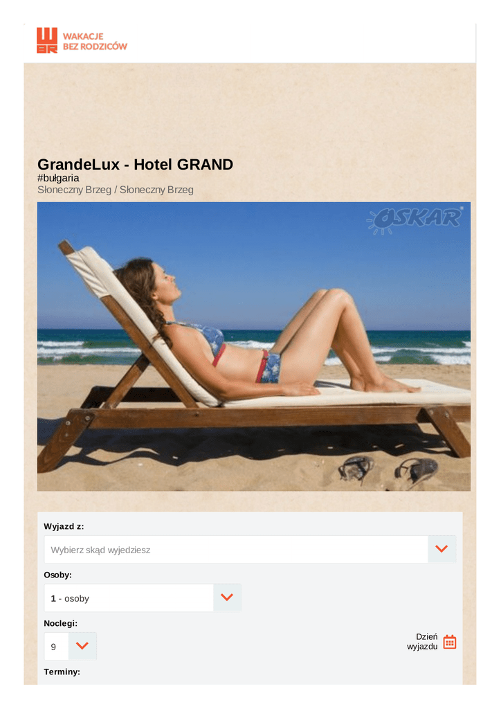 GrandeLux - Hotel GRAND #bułgaria Słoneczny Brzeg / Słoneczny Brzeg Wyjazd z: Wybierz skąd wyjedziesz Osoby: 1 - osoby Noclegi: 9 Terminy: Dzień wyjazdu 13 dni 27.06.2017 - 10.07.2017 Pokój: pokoj wieloosobowy Wyżywienie: Wszystko w cenie Warunki płatności: Cena za 1 osobę: Razem: cena katalogowa 1897 zł 3794 zł Opis oferty Miejscowość Wiek 12Wycieczki - 16 lat fakultatywne Słoneczny Brzeg Opinie Nie przez przypadek nazywane Las Vegas Wschodniej Europy. W samym mieście znajduje się ok 130 tawern i barów. Słoneczny Brzeg to miasto dla ludzi młodych, spragnionych dobrej zabawy. 6Rozkład jazdy kilometrowa plaża zachęca do wypoczynku w ciągu dnia, a liczne dyskoteki zachęcają do zabawy wieczorami, aż do białego rana. Rozrywki takie jak banan, windsurfing, jeep safari to zdecydowany atut tego miejsca! #oskarobozy Oskar gwarantuje dla każdego uczestnika obozu w Bułgarii MEGA ATRAKCJĘ - tętniące adrenaliną Jeep Safari! Jeep Safari to solidna dawka wrażeń połączona z możliwością podziwiania najpiękniejszych nadmorskich krajobrazów. Emocje poczujesz już na starcie, kiedy ruszymy z okolic miasta Mładeżka super jeep'ami 4x4!!! Zgrana ekipa to podstawa dobrej zabawy! Poznaj swoją obozową ekipę jeszcze przed wyjazdem, dzięki specjalnie dla Was utworzonej grupie na FB! https - //www.facebook.com/groups/155798031596619/ Położenie Witaj w Hotelu GRAND! Widzisz piaszczystą plażę z okna swojego pokoju? To nie złudzenie! Hotel położony jest przy tętniącym życiem głównym deptaku o długości aż 5 km. Obiekt jest ultra luksusowy, tysiąc lajków dla tego, kto zbudował to cudo. Hotel GRAND posiada basen wraz z tarasem słonecznym. Jaki jest plan? #melo #yolo #oskarobozy! Najlepsze wakacje w ALL IN! Zakwaterowanie Pokoje 5 i 6 osobowe z klimatyzacją. Każdy pokój ma balkon, lodówkę a także własną łazienkę z prysznicem i suszarką. Hotel zapewnia salę na animacje i warsztaty. Wyżywienie Wyżywienie All Inclusive - 5 posiłków dziennie, wszystkie w formie bufetu, czyli 9 śniadań, 10 lunchy i 9 obiadokolacji oraz 2 razy dziennie (drugie sniadanie i podwieczorek) przekąski takie jak słodycze czy lody. Napoje serwowane w barze przy basenie w godz. 10.00-23.00 (coca cola, fanta, sprite, tonic oraz woda mineralna) Co za ile, czyli hajs musi się zgadzać - ) Sugerowane kieszonkowe - zabierz ze sobą ok. 80 € na drobne wydatki! pizza 2 leva / porcja Coca-cola 1,6 leva / 0,33 l pocztówka ze znaczkiem 1,5 leva Info dodatkowe Legitymacja nie wystarczy- obowiązkowo musisz zabrać ze sobą ważny dowód osobisty lub paszport, a jeśli chcesz jechać do Stambułu to no way bez paszportu. Pamiętaj, żeby zabrać Kartę Uczestnika Obozu, podpisany Regulamin oraz kartę EKUZ (www.ekuz.nfz.gov.pl) Banana Boat Ride - dla amatorów wodnego szaleństwa i kolekcjonorów mocnych wrażeń! Kiedy motorówka kręci szalone koła, utrzymanie się na dmuchanym bananie jest nie lada wyzwaniem - P Sprawdź jak długo wytrzymasz! - ) Dokumenty do pobrania Karta kwalifikacyjna www.oskar.com.pl/zalaczniki/karta_kwalifikacyjna Regulamin obozu www.oskar.com.pl/zalaczniki/regulamin_obozu Karta Dużej Rodziny www.oskar.com.pl/zalaczniki/karta_duzej_rodziny Turystyczny Fundusz Gwarancyjny W związku z powołaniem do życia w dniu 26.11.2016 Turystycznego Funduszu Gwarancyjnego każdy klient Biura Podróży Oskar zobowiązany jest do zapłaty kwoty w wysokości 10zł/os. przy każdorazowej rezerwacji imprezy turystycznej (obowiązuje od dnia 26.11.2016). Kwota przeznaczona na Turystyczny Fundusz Gwarancyjny zostanie automatycznie doliczona do wartości rezerwacji (w momencie jej dokonania). Wyjątkiem są imprezy turystyczne odbywające się w krajach posiadających granicę z Rzeczpospolitą Polską. Składka nie jest przychodem biura. Ubezpieczenie Warunki ubezpieczenia Bezpieczne Podróże Signal Iduna dokument do pobrania www.oskar.com.pl/zalaczniki/owu Warunki ubezpieczenia Kosztów Imprezy Turystycznej Signal Iduna dokument do pobrania www.oskar.com.pl/zalaczniki/owurg Warunki promocji FIRST MINUTE www.oskar.com.pl/dokumenty/warunki_promocji_oboz Udogodnienia Żegluga Ułatwienia dla niepełnosprawnych Windsurfing Nordic walking Jazda konna Program ramowy Dzień 1 Wyjazd z Polski zgodnie z rozkładem jazdy autokarów. Przejazd przez Czechy, Słowację, Węgry, Rumunię / Serbię. Dzień 2 Przyjazd do Słonecznego Brzegu w godzinach przedpołudniowych. Zakwaterowanie w godzinach od 12-14. Lunch / obiad. Dzień 3 - 10 Leżing, plażing, smażing... i PARTY! Dzień 11 Wykwaterowanie w godzinach porannych. Czas na złapanie ostatnich wspomnień i pożegnanie z bułgarskimi plażami. Wyjazd do Polski w godzinach popołudniowych. Dzień 12 Podróż powrotna. Przejazd przez Rumunię/Serbię ,Węgry, Słowację. Przyjazd do Polski w godzinach nocnych/porannych dnia następnego. Cena zawiera ATRAKCJĘ! - JEEP SAFARI transport nowoczesnym i komfortowym autokarem klasy LUX (klimatyzacja, WC, DVD, minibar) zakwaterowanie - 9 noclegów w pokojach wieloosobowych wyżywienie All Inclusive light - 9 śniadań, 10 lunchy, 9 obiadokolacji w formie bufetu oraz drugie śniadanie i podwieczorek opiekę pilota i wychowawców na trasie przejazdu opiekę kadry i rezydenta na miejscu ubezpieczenie [KL 10000 euro, NNW 10000 zł, BP 500 zł (utrata)] bogaty program rekreacyjno - rozrywkowy suchy prowiant na drogę powrotną Dopłaty wymagane na miejscu atrakcje programowe i opłata klimatyczna - 30 €/os - płatne u pilota w autokarze kaucja zwrotna - 10 €/os - płatne u kierownika obozu, zwracane po wykwaterowaniu pod warunkiem braku szkód Dopłaty opcjonalne wycieczki fakultatywne i bilety wstępu do zwiedzanych obiektów Banana Ride - ok. 10 €/os - przejażdżka + wpadka do wody GRATIS - ) obiad na trasie przejazdu (ok. 5 €/posiłek) podczas dłuższego postoju do i w drodze powrotnej ubezpieczenie od chorób przewlekłych i nowotworowych KL 20000 euro, NNW 10000 zł, baga