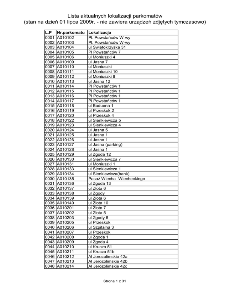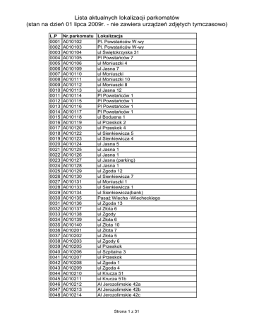 Lista aktualnych lokalizacji parkomatów (stan na dzień 01 lipca 2009r. - nie zawiera urządzeń zdjętych tymczasowo) L.P 0001 0002 0003 0004 0005 0006 0007 0008 0009 0010 0011 0012 0013 0014 0015 0016 0017 0018 0019 0020 0021 0022 0023 0024 0025 0026 0027 0028 0029 0030 0031 0032 0033 0034 0035 0036 0037 0038 0039 0040 0041 0042 0043 0044 0045 0046 0047 0048 Nr.parkomatu A010102 A010103 A010104 A010105 A010106 A010109 A010110 A010111 A010112 A010113 A010114 A010115 A010116 A010117 A010118 A010119 A010120 A010122 A010123 A010124 A010125 A010126 A010127 A010128 A010129 A010130 A010131 A010133 A010134 A010135 A010136 A010137 A010138 A010139 A010140 A010201 A010202 A010203 A010205 A010206 A010207 A010208 A010209 A010210 A010211 A010212 A010213 A010214 Lokalizacja Pl. Powstańców W-wy Pl. Powstańców W-wy ul Świętokrzyska 31 Pl Powstańców 7 ul Moniuszki 4 ul Jasna 7 ul Moniuszki ul Moniuszki 10 ul Moniuszki 8 ul Jasna 12 Pl Powstańców 1 Pl Powstańców 1 Pl Powstańców 1 Pl Powstańców 1 ul Boduena 1 ul Przeskok 2 ul Przeskok 4 ul Sienkiewicza 5 ul Sienkiewicza 4 ul Jasna 5 ul Jasna 1 ul Jasna 1 ul Jasna (parking) ul Jasna 1 ul Zgoda 12 ul Sienkiewicza 7 ul Moniuszki 1 ul Sienkiewicza 1 ul Sienkiewicza(bank) PasaŜ Wiecha -Wiecheckiego ul Zgoda 13 ul Złota 6 ul Zgody ul Złota 6 ul Złota 10 ul Złota 7 ul Złota 5 ul Zgody 6 ul Przeskok ul Szpitalna 3 ul Przeskok ul Zgoda 1 ul Zgoda 4 ul Krucza 51 ul Krucza 51b Al Jerozolimskie 42a Al Jerozolimskie 42b Al Jerozolimskie 42c Strona 1 z 31 Lista aktualnych lokalizacji parkomatów (stan na dzień 01 lipca 2009r. - nie zawiera urządzeń zdjętych tymczasowo) 0049 0050 0051 0052 0053 0054 0055 0056 0057 0058 0059 0060 0061 0062 0063 0064 0065 0066 0067 0068 0069 0070 0071 0072 0073 0074 0075 0076 0077 0078 0079 0080 0081 0082 0083 0084 0085 0086 0087 0088 0089 0090 0091 0092 0093 0094 0095 0096 0097 0098 A010215 A010216 A010217 A010218 A010219 A010301 A010302 A010303 A010304 A010305 A010306 A010307 A010308 A010309 A010310 A010311 A010312 A010313 A010314 A010315 A010316 A010317 A010318 A010319 A010320 A010321 A010322 A010323 A010324 A010325 A010326 A010327 A010328 A010329 A010330 A020101 A020102 A020103 A020104 A020105 A020106 A020107 A020108 A020109 A020110 A020111 A020112 A020113 A020114 A020115 ul Widok 21 ul Widok 20 ul Widok 16 ul Widok 11 ul Widok 8 Świętokrzyska/Pl Powstańców Świętokrzyska 11-21 Świętokrzyska 11-21 ul Świętokrzyska 5-7 ul Kubusia Puchatka ul Kubusia Puchatka ul Kubusia Puchatka ul Kubusia Puchatka ul Warecka 8 ul Warecka 10 Pl Powstańców 4 Pl Powstańców 4 ul Warecka/Pl Powstańców ul Warecka 10 ul Tuwima 5 ul Tuwima 3 ul Tuwima 2 ul Baczyńskiego 4 ul Baczyńskiego 2 ul Górskiego 1 ul Górskiego 7 ul Górskiego ul Górskiego 8 Pl Powstańców 2-4 Pl Powstańców 2-4 Al Jerozolimskie 28 Al Jerozolimskie 30 ul Bracka 16b ul Bracka 16a ul Bracka 20 Al Jerozolimskie Al Jerozolimskie 25 ul Krucza 47 ul Nowogrodzka 12 ul Nowogrodzka 18 ul Nowogrodzka 31 ul Nowogrodzka 25 ul Nowogrodzka 21 ul Krucza ul śurawia 16 ul śurawia 24 ul śurawia 36 ul Marszałkowska 84 ul Parkingowa 27 ul Nowogrodzka 15 Strona 2 z 31 Lista aktualnych lokalizacji parkomatów (stan na dzień 01 lipca 2009r. - nie zawiera urządzeń zdjętych tymczasowo) 0099 0100 0101 0102 0103 0104 0105 0106 0107 0108 0109 0110 0111 0112 0113 0114 0115 0116 0117 0118 0119 0120 0121 0122 0123 0124 0125 0126 0127 0128 0129 0130 0131 0132 0133 0134 0135 0136 0137 0138 0139 0140 0141 0142 0143 0144 0145 0146 0147 0148 A020201 A020203 A020204 A020205 A020206 A020207 A020208 A020209 A020210 A020211 A020214 A020215 A020216 A020217 A020218 A020219 A020220 A020221 A020222 A020301 A020302 A020303 A020304 A020305 A020306 A020307 A020308 A020309 A020310 A020311 A020312 A020313 A020314 A020316 A020318 A020319 A020320 A020321 A020322 A020323 A020324 A020325 A020326 A020327 A020328 A020329 A020330 A020401 A020402 A020403 Al Jerozolimskie 17 Al Jerozolimskie 7 ul Nowy Świat 3 Pl Trzech KrzyŜy 16 ul Bracka 4 ul Mysia 5 ul Mysia 3 ul Mysia 2 ul Mysia 2 ul Bracka 11 ul Nowogrodzka 6 ul Krucza 46 ul Nowogrodzka 11 ul Nowogrodzka 5 ul Bracka 3 ul śurawia 4 ul śurawia 6 ul śurawia 8 ul Krucza 38 ul śurawia 31 ul śurawia 21 ul Krucza ul Wspólna 30 ul Parkingowa 1 ul Wspólna ul Marszałkowska 82 ul Wspólna 41 ul Wspólna 33 ul Wspólna 25 ul Krucza 23 ul HoŜa 36 ul HoŜa 38 ul HoŜa 40 ul HoŜa 42 ul HoŜa 31 ul HoŜa 21 ul Krucza 21 ul Krucza 17 ul Wilcza 22 ul Wilcza 26 ul Wilcza 32 ul Marszałkowska 68 ul Skorupki 2 ul. Skorupki 5 ul Marszałkowska 72 ul Skorupki 3 ul Skorupki 8 ul Krucza 36 ul śurawia 7 ul śurawia 5 Strona 3 z 31 Lista aktualnych lokalizacji parkomatów (stan na dzień 01 lipca 2009r. - nie zawiera urządzeń zdjętych tymczasowo) 0149 0150 0151 0152 0153 0154 0155 0156 0157 0158 0159 0160 0161 0162 0163 0164 0165 0166 0167 0168 0169 0170 0171 0172 0173 0174 0175 0176 0177 0178 0179 0180 0181 0182 0183 0184 0185 0186 0187 0188 0189 0190 0191 0192 0193 0194 0195 0196 0197 0198 A020404 A020405 A020406 A020407 A020408 A020409 A020410 A020411 A020412 A020413 A020414 A020415 A020416 A020417 A020418 A020419 A020420 A020501 A020502 A020503 A020504 A020505 A020506 A020507 A020509 A020510 A020601 A020602 A020604 A020606 A020608 A020609 A020610 A020611 A020612 A020613 A020617 A020618 A020619 A030101 A030102 A030103 A030104 A030105 A030107 A030108 A030109 A030110 A030111 A030112 ul śurawia 3 ul HoŜa 18 ul HoŜa 20 ul HoŜa 15 ul HoŜa 11 ul HoŜa 3 ul Mokotowska 66 Al Ujazdowskie 51 ul Wilcza 2 ul Wilcza 2 ul Mokotowska 71 ul Mokotowska 65 ul Wilcza 12 ul Wilcza 20 ul Krucza 16 ul Krucza 24 Pl. Trzech KrzyŜy ul Wilcza 2 ul Wilcza 23 ul Wilcza 17 ul Krucza 13 ul Krucza 5/11 ul Krucza 5 ul Piękna 28a ul Marszałkowska 60 ul Marszałkowska 62 ul Wilcza 11 ul Wilcza 5 Al Ujazdowskie 39 ul Mokotowska 54 ul Mokotowska 50 ul Mokotowska 51 ul Mokotowska 44 ul Mokotowska 49 ul Piękna 16 ul Mokotowska/Piękna 16b ul Krucza 6/14 ul Krucza 6/14 ul 