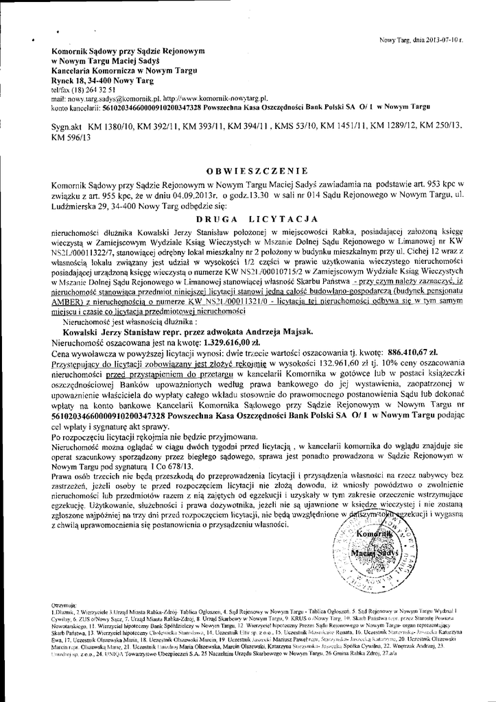Nowy Targ. dnia 2013-07-10 r Komornik Sedowy przy S4dzie Rejonowym w Nowym Targu Msciej Sadys Kancelaria Komornicza w Nowym Targu Rynek 18,34-400 Nowy Targ tel/fax (18) 264 32 5l mail : [email protected], http r//www.komomik-now)1arg. pl. konto kancclarii: 56102034660000910200347328 Powszechna Kasa Oszczfdnosci Bank Polski SA O/ I Sygn.akt KM 1380/10, KM 392111, KM393l1l, KM 394111 , KMS 53/10, KM 1451/l KM 596i ll KM 1289/12, KM 250/13. 1, w Nowym Targu OBWIESZCZDNIE Komornik Sqdowy przy Sqdzie Rejonowym w Nowym Targu Maciej SadyS zawiadamia na podstawie art. 953 kpc w zwiqzku z afi. 955 kpc, 2e w dniu 04.09.2013r. o godz.l3.30 w sali nr 014 SEdu Rejonowego w Nowym Targu, ul. LudZmierska 29, 34-400 Nowy Targ odbgdzie si9: DRUGA LICYTACJA nieruchomoSci dluznika Kowalski lerzy Stanislaw polozonej w miejscowoSci Rabka, posiadaj4cej zalozon4 ksiggQ wieczystE w Zamiejscowym Wydziale KsiEg Wieczystych w Mszanie Dolnej S4du Rejonowego w Limanowej nr KW NSll./0001 132217, stanowi4cej odrEbny lokal mieszkalny nr 2 poloZony w budy:ku mieszkalnyn przy ul. Ctchej 12 wraz z wlasno6ciq lokalu zlvi4zany jest udzial w wysokosci ll2 czgscr w pnvie uZ)'tkowania wieczystego nieruchomo3ci posiadaj4c€j urzEdzon4 ksiggg wieczystE o numeze KW NSll./00010715/2 w Zamiejscowym Wydziale Ksiag Wieczystych w \lszonie Dolnej S4du Rejonowego w Limanowej stanowi4cej wlasnosi Skarbu Paistwa - przv czym nalezv zaznaczyc. tz nieruchomoSi stanowiaca orzedmiot niniejsze.i licltacji stanowijedna caloSd budowlano-eospQdaM4-l:b!!!l4gk!9!qloiA!u AMBER) z nieruchomoscia o numerze KW N Sll-10001 1 32110 - lic),tacja tej nieruchomoSci odb).wa sie w tym samym miejscu i czasie co liq4acja pEcdpiolqlqldclusha!0qiqi NieruchomoSi jest wlasnosci4 dluznika : Kowalski Jerzy Stanislaw repr. przez adwokata Andrzeja Majsak Nieruchomodi oszacowana jest na kwotg: 1.329.616'00 ,rl. Cena wywolawcza w po$yzszej licytacji wynosi: dwie trzecie warto5ci oszacowania tj. kwote: 886.410'67 zl. Przystepujacv do licytacji zobowiazany jest zlozyC rek9j4i9 w wysoko6ci 132.961,60 zl tj. l0o/o cen) oszacouania nieruchomoSci przed przystapieniem do przetargu w kancelarii Komornika w got6wce lub w postaci ksi4zeczki oszczEdno$ciowej Bank6w upowaZnionych wedlug prawa bankowego do jej wystawienia, zaopatrzonej w upowaznienie wlaSciciela do wyplaty calego wkladu stosDwnie do prawomocnego postanowienia SEdu lub dokonai wplaty na konto bankowe Kancelarii Komornika Sqctowego przy Sqdzie Rejonowym w Nowym Targu nr 561020346600009102003,17328 Powszechna Kasa OszczgdnoSci Bank Polski SA O/ I w Nowym Targu podai4c cel wplary i sygnatur€ akt sprawy. Po rozpoczEciu licytacji rgkojmia nie bgdzie przyjmowana. NieruchomoSi mozna ogl4dai w ci4gu dw6ch tygodni przed lic),tacjq, w kancelarii komomika do wgl4du znajduje sie operat szacunkowy sporz4dzony przez bieglego sqdowego, sprawa jest ponadto prowadzona w S4dzie Rejonowym w Nowl,rn Targu pod sygnatur4 I Co 678/13. Prawa os6b trzecich nie bEdq przeszkod4 do przeprowadzenia licyacji i przys4dzenia wlasno(ci na rzecz nabywcy bez zastrzezeh, jezeli osoby te przed rozpoczeciem licltacji nie zlo24 dowodu, iz wniosly pow6dawo o zwolnienic nieruchomo5ci lub przedmiot6w razem z niq zajgtych od egzekucji i uzyskaly w tym zakresie orzeczenie wstrzymuiace wieczystej i nie zostanE egzekucjg. U2ykowanie, sluzebno3ci i prawa dozywotnika, jezeli nie sE ujawnione w ksi zgloszone najp62niej na trzy dni przed rozpoczgciem lic)tacji, nie bQd4 uwzglgdnione w .ll l wygasn4 i) z chwil4 uprawomocnienia sig postanowienia o przysqdzeniu wlasnoSci. ,',\ \^'\ lDlxfik'2wicr4cie|e3tJrz4dMinstaRabka-ZdroJTablicaogloszcn.4'sadRejonowywNowym,largU..Iablicaogloszei'5 cywi|ny'6ZUSo/Nowys4cz'7'U.2qdMiastaRabka-Zd'oJ'8Ul7adSkarbou-wNonl'raigU,9 Nowotankiego'llwierzycielhipoiecnyaankSp6tdzielczy*No9am'I.argu.12wer4cielh'potecz I r,/dor :r). z o.o ,24. I :.llQ^ Towaizystwo Ubezpieczen S A. 25 NaczelniD Urzedu SkdboweSo w Nowym Targx.26 Cmina Rabka Zdroj, 2?.ta