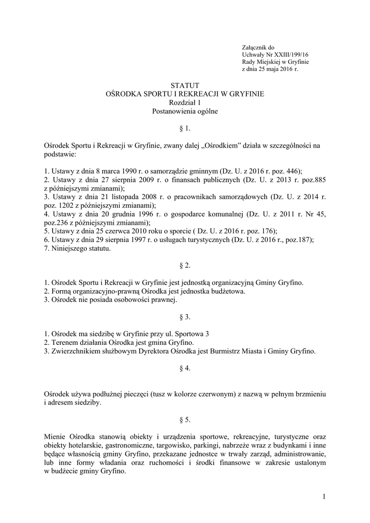 1 STATUT OŚRODKA SPORTU I REKREACJI W GRYFINIE