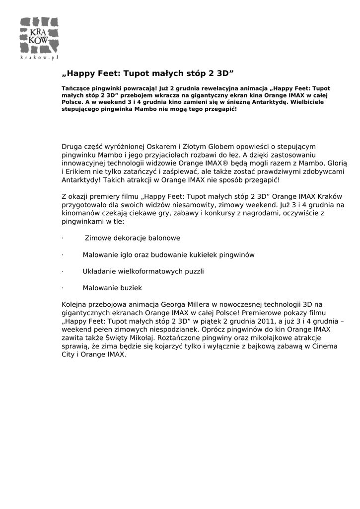 „Happy Feet: Tupot małych stóp 2 3D” Tańczące pingwinki powracają! Już 2 grudnia rewelacyjna animacja „Happy Feet: Tupot małych stóp 2 3D” przebojem wkracza na gigantyczny ekran kina Orange IMAX w całej Polsce. A w weekend 3 i 4 grudnia kino zamieni się w śnieżną Antarktydę. Wielbiciele stepującego pingwinka Mambo nie mogą tego przegapić! Druga część wyróżnionej Oskarem i Złotym Globem opowieści o stepującym pingwinku Mambo i jego przyjaciołach rozbawi do łez. A dzięki zastosowaniu innowacyjnej technologii widzowie Orange IMAX® będą mogli razem z Mambo, Glorią i Erikiem nie tylko zatańczyć i zaśpiewać, ale także zostać prawdziwymi zdobywcami Antarktydy! Takich atrakcji w Orange IMAX nie sposób przegapić! Z okazji premiery filmu „Happy Feet: Tupot małych stóp 2 3D” Orange IMAX Kraków przygotowało dla swoich widzów niesamowity, zimowy weekend. Już 3 i 4 grudnia na kinomanów czekają ciekawe gry, zabawy i konkursy z nagrodami, oczywiście z pingwinkami w tle: · Zimowe dekoracje balonowe · Malowanie iglo oraz budowanie kukiełek pingwinów · Układanie wielkoformatowych puzzli · Malowanie buziek Kolejna przebojowa animacja Georga Millera w nowoczesnej technologii 3D na gigantycznych ekranach Orange IMAX w całej Polsce! Premierowe pokazy filmu „Happy Feet: Tupot małych stóp 2 3D” w piątek 2 grudnia 2011, a już 3 i 4 grudnia – weekend pełen zimowych niespodzianek. Oprócz pingwinów do kin Orange IMAX zawita także Święty Mikołaj. Roztańczone pingwiny oraz mikołajkowe atrakcje sprawią, że zima będzie się kojarzyć tylko i wyłącznie z bajkową zabawą w Cinema City i Orange IMAX. Powered by TCPDF (www.tcpdf.org)