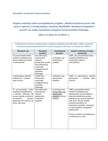 SUPLEMENT DO RAPORTU EWALUACYJNEGO Stopień realizacji celów szczegółowych projektu „Model kształcenia przez całe życie w oparciu o trwałą relację z uczelnią: ideAGORA- absolwenci kapitałem uczelni” po etapie testowania wstępnej wersji produktu finalnego (dane na dzień 31.12.2014 r.) Podniesienie poziomu wiedzy kadry naukowo-dydaktycznej CM (10K, 11M) w zakresie kształcenia postaw gotowości do uczenia się przez całe życie w okresie do X 2015 r. Wskaźnik celu 21 pracowników kadry naukowo-dydaktycznej, którzy zakończyli udział w warsztatach 1 opracowany otwarty podręcznik – metoda open source 21 pracowników kadry naukowo-dydaktycznej, u których odnotuje się wzrost wiedzy w zakresie kształcenia postaw gotowości do uczenia się przez całe życie Narzędzia pomiaru listy obecności, opracowany otwarty podręcznik, wyniki fazy testowania, ewaluacja wstępnej wersji produktu finalnego wyniki fazy testowania, ewaluacja wstępnej wersji produktu finalnego listy obecności, opracowany otwarty podręcznik, ewaluacja projektu Częstotliwość pomiaru na bieżąco i po zakończeniu projektu Stopień realizacji po etapie testowania 100% (21 pracowników kadry naukowo-dydaktycznej zakończyło udział w warsztatach) na bieżąco i po zakończeniu projektu 100% (1 opracowany otwarty podręcznik – metoda open source) na bieżąco oraz na początku i po zakończeniu projektu [wzrost wiedzy] 100% pracowników kadry naukowo-dydaktycznej odnotowało wzrost wiedzy w zakresie kształcenia postaw gotowości do uczenia się przez całe życie. Wzrost wiedzy zostanie określony na podstawie wyników ewaluacji ex-post zgodnie z przyjętymi założeniami. Zmiana zostanie zweryfikowana w ewaluacji ex- post. Rozwój potencjału CM w obszarze lifelong learning poprzez wypracowanie modelu ideAGORA w oparciu o doświadczenia Capful Ltd. (Finlandia) w okresie do X 2015 r. 3 nowe programy kształcenia w obszarze lifelong learning 21 pracowników kadry naukowo-dydaktycznej, którzy poznają nowe metody nauczania dokumentacja projektowa, ewaluacja produktu finalnego oraz projektu listy obecności, dziennik pracy trenera, wnioski o płatność ewaluacja projektu pomiar bieżący, po testowaniu i na zakończenie projektu 100% (3 nowe programy kształcenia w obszarze lifelong learning) na bieżąco i po zakończeniu projektu 100% (21 pracowników kadry naukowo-dydaktycznej poznało nowe metody nauczania) Kształtowanie postaw gotowości do kształcenia się przez całe życie studentów (20K/20M) i absolwentów (30K/70M) CM w okresie do X 2015 r. 25 absolwentów uczestniczących w procesie kształcenia ustawicznego raport z ewaluacji produktu finalnego oraz projektu na bieżąco, po testowaniu i na zakończenie projektu – obserwacja zmiany w zakresie gotowości) 124% (100 absolwentów uczestniczyło w różnych formach kształcenia ustawicznego (udział w co najmniej 1 spotkaniu o charakterze samokształceniowym), 31 spośród nich wyróżniło się szczególną aktywnością (udział w co najmniej 3 spotkaniach o charakterze samokształceniowym) - na podst. Rejestr gotowości do kształcenia ustawicznego Zmiana zostanie zweryfikowana w ewaluacji ex- post. 100 absolwentów – raport z ewaluacji respondentów badania produktu w zakresie gotowości do finalnego oraz kształcenia przez całe projektu życie, u których wzrosła postawa gotowości do kształcenia 40 studentów – respondentów badania na bieżąco, po testowaniu i na zakończenie projektu – obserwacja zmiany w zakresie gotowości 100% (100 absolwentów uczestniczyło w co najmniej 1 spotkaniu o charakterze samokształceniowym) - na podst. Rejestr gotowości do kształcenia ustawicznego. 66% badanych pozytywnie oceniło wpływ Modelu ideAGORA na wzrost liczby absolwentów uczestniczących w kształceniu ustawicznym. Zmiana zostanie zweryfikowana w ewaluacji ex- post. raport z ewaluacji na bieżąco, po 100% (40 studentów zostało produktu testowaniu i na zaproszonych do wzięcia udziału w zakresie gotowości do kształcenia przez całe życie, u których wzrosła postawa gotowości do kształcenia finalnego projektu oraz zakończenie projektu – obserwacja zmiany w zakresie gotowości). w szkoleniach w fazie testowania) - na podst. danych Rejestr gotowości do kształcenia ustawicznego. 60% ankietowanych pozytywnie oceniło wpływ Modelu ideAGORA na wzrost liczby absolwentów uczestniczących w kształceniu ustawicznym. Zmiana zostanie zweryfikowana w ewaluacji ex- post. Podniesienie jakości oferty edukacyjnej CM do potrzeb rynku pracy, zbudowanej na podstawie wiedzy zebranej od studentów i absolwentów CM w okresie do X 2015 1000 absolwentów – respondentów badania oceniających pozytywnie ofertę edukacyjną CM w zakresie przydatności oferty do rynku pracy raport z ewaluacji produktu finalnego oraz projektu na bieżąco, po testowaniu i na zakończenie projektu – obserwacja zmiany w zakresie przydatności oferty 667 studentów (po etapie testowania) ocenia ofertę edukacyjną CM w zakresie przydatności oferty do rynku pracy na poziomie 3,92 w pięciopunktowej skali (1-5) - na podst. danych wtórnych. Zmiana zostanie zweryfikowana w ewaluacji ex- post. 200 kandydatów na studia zainteresowanych ofertą edukacyjną CM listy zgłoszeń na studia częstotliwość pomiaru: na bieżąco 108,5% (217 kandydatów na studia wyraziło zainteresowanie ofertą edukacyjną CM). Upowszechnienie i wdrożenie modelu ideAGORA w środowisku uczelni wyższych w okresie do X 2015 r. 3 uczelnie, które wdrożą uchwała Senatu wypracowany Model Uczelni lub Zarządzenie Kanclerza w sprawie wdrożenia modelu ideAGORA lub podpisanie listu intencyjnego zobowiązującego do wdrożenia modelu, dokumentacja projektowa, ewaluacja projektu 6 uczelni, które wyrażą dokumentacja na bieżąco, po testowaniu i na zakończenie projektu Wskaźnik możliwy do zweryfikowania na etapie ewaluacji ex-post na bieżąco, po Wskaźnik możliwy do zai