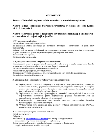 OGŁOSZENIE Starosta Kolneński ogłasza nabór na wolne stanowisko urzędnicze Nazwa i adres jednostki : Starostwo Powiatowe w Kolnie, 18 – 500 Kolno, ul. 11 Listopada 1 Nazwa stanowiska pracy : referent w Wydziale Komunikacji i Transportu – stanowisko ds. rejestracji pojazdów. 1.Wymagania niezbędne : 1) posiadanie obywatelstwa polskiego, 2) posiadanie pełnej zdolności do czynności prawnych i korzystanie z pełni praw publicznych, 3) kandydaci nie mogą być skazani prawomocnym wyrokiem sądu za umyślne przestępstwo ścigane z oskarżenia publicznego lub umyślne przestępstwo skarbowe, 4) wykształcenie wyższe, 5) nieposzlakowana opinia. 2.Wymagania dodatkowe związane ze stanowiskiem: 1) znajomość ustaw: o pracownikach samorządowych, prawo o ruchu drogowym, kodeks postępowania administracyjnego, o ochronie danych osobowych, 2) doświadczenie w pracy na podobnym stanowisku, 3) sumienność, uprzejmość, obowiązkowość, 4) komunikatywność, umiejętność pracy w zespole oraz przy obsłudze interesantów, 5) umiejętność obsługi komputera. 3. Zakres zadań i obowiązków wykonywanych na stanowisku: 1) Wykonywanie czynności związanych z rejestracją (wyrejestrowaniem, czasowym wycofaniem z ruchu) pojazdów samochodowych, ciągników rolniczych, motocykli, motorowerów, przyczep oraz wydawanie dowodów rejestracyjnych, zalegalizowanych tablic rejestracyjnych i nalepek kontrolnych. 2) Wpisywanie do dowodów rejestracyjnych, pozwoleń czasowych lub kart pojazdu, odpowiednich zastrzeżeń, jeżeli użytkowanie pojazdu uzależnione jest od szczególnych warunków określonych przepisami. 3) Przyjmowanie i wydawanie (po ustaniu przyczyn zatrzymania) dowodów rejestracyjnych i pozwoleń czasowych. 4) Wykonywanie w/w czynności przy pomocy systemu informatycznego POJAZD zgodnie z upoważnieniem. 4. Dokumenty wymagane w ramach naboru: 1) list motywacyjny, 2) życiorys, 3) wypełniony kwestionariusz osobowy dla osoby ubiegającej się o zatrudnienie, wg wzoru załączonego do ogłoszenia, 4) kserokopia dokumentów potwierdzających posiadane wykształcenie - dyplom ukończenia studiów wyższych, 1 5) kserokopia dokumentów potwierdzających doświadczenie zawodowe, 6) oświadczenie kandydata o posiadaniu pełnej zdolności do czynności prawnych oraz korzystaniu z pełni praw publicznych, 7) oświadczenie kandydata o niekaralności za przestępstwa ścigane z oskarżenia publicznego lub umyślne przestępstwo skarbowe, 8) oświadczenie o wyrażeniu zgody na przetwarzanie danych osobowych zawartych w ofercie pracy dla potrzeb związanych z przeprowadzanym naborem na wolne stanowisko pracy zgodnie z ustawą z dnia 21 listopada 2008 r. o pracownikach samorządowych oraz ustawą z dnia 29.08.1997 r. o ochronie danych osobowych. Dokumenty wymienione w pkt 1-3 oraz oświadczenia wymienione w pkt 6-8 muszą być odręcznie podpisane przez kandydata 5.Warunki pracy na stanowisku. 1) wymiar czasu pracy 1 – etat 2) miejsce pracy –Starostwo Powiatowe w Kolnie, ul. 11 Listopada 1, parter, brak windy w budynku, 3) praca administracyjno-biurowa, praca przy komputerze oraz obsłudze interesantów. 6. Wskaźnik zatrudnienia. wskaźnik zatrudnienia osób niepełnosprawnych w rozumieniu przepisów o rehabilitacji zawodowej i społecznej oraz zatrudnianiu osób niepełnosprawnych w Starostwie Powiatowym w Kolnie w miesiącu styczniu 2016r. był wyższy niż 6%. 7.Termin i miejsce składania dokumentów: Wymagane dokumenty można składać do dnia 8 marca 2016 r. (wtorek) w sekretariacie Starostwa Powiatowego w Kolnie, przy ul. 11 Listopada 1. (osobiście lub za pośrednictwem poczty) w zamkniętych kopertach z dopiskiem: „Oferta pracy na wolne stanowisko urzędnicze –Referent w Wydziale Komunikacji i Transportu” Oferty, które wpłyną do Starostwa po wyżej określonym terminie rozpatrywane. nie będą Kandydaci, którzy spełnią wymogi formalne zostaną powiadomieni indywidualnie (telefonicznie) o terminie rozmowy kwalifikacyjnej; Osoba wybrana do zatrudnienia będzie zobowiązana do przedstawienia aktualnego zaświadczenia o niekaralności z Krajowego Rejestru Karnego, oraz oryginałów dokumentów (do wglądu) potwierdzających posiadane wykształcenie, kwalifikacje, staż pracy. Informacja o wyniku przeprowadzonego naboru będzie zamieszczona na stronach Biuletynu Informacji Publicznej (BIP) Starostwa Powiatowego pod adresem http://bip.st.kolno.wrotapodlasia.pl/ oraz na tablicy ogłoszeń w siedzibie Starostwa. Uwaga: osoby nie spełniające wszystkich niezbędnych wymogów formalnych nie zostaną dopuszczone do udziału w przeprowadzonym postępowaniu w sprawie naboru. Kolno, 2016 -02- 24 Starosta – Stanisław Wiszowaty 2