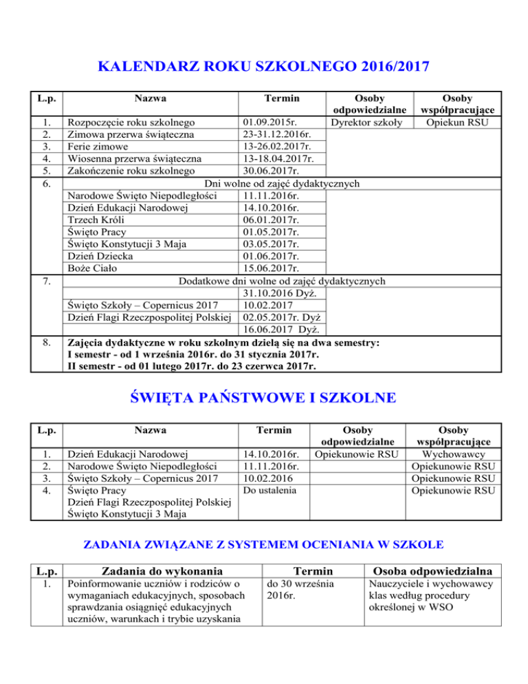 KALENDARZ ROKU SZKOLNEGO 2016/2017 L.p. 1. 2. 3. 4. 5. 6. 7. 8. Nazwa Termin Rozpoczęcie roku szkolnego Zimowa przerwa świąteczna Ferie zimowe Wiosenna przerwa świąteczna Zakończenie roku szkolnego Osoby odpowiedzialne Dyrektor szkoły 01.09.2015r. 23-31.12.2016r. 13-26.02.2017r. 13-18.04.2017r. 30.06.2017r. Dni wolne od zajęć dydaktycznych Narodowe Święto Niepodległości 11.11.2016r. Dzień Edukacji Narodowej 14.10.2016r. Trzech Króli 06.01.2017r. Święto Pracy 01.05.2017r. Święto Konstytucji 3 Maja 03.05.2017r. Dzień Dziecka 01.06.2017r. Boże Ciało 15.06.2017r. Dodatkowe dni wolne od zajęć dydaktycznych 31.10.2016 Dyż. Święto Szkoły – Copernicus 2017 10.02.2017 Dzień Flagi Rzeczpospolitej Polskiej 02.05.2017r. Dyż 16.06.2017 Dyż. Zajęcia dydaktyczne w roku szkolnym dzielą się na dwa semestry: I semestr - od 1 września 2016r. do 31 stycznia 2017r. II semestr - od 01 lutego 2017r. do 23 czerwca 2017r. Osoby współpracujące Opiekun RSU ŚWIĘTA PAŃSTWOWE I SZKOLNE L.p. Nazwa Termin 1. 2. 3. 4. Dzień Edukacji Narodowej Narodowe Święto Niepodległości Święto Szkoły – Copernicus 2017 Święto Pracy Dzień Flagi Rzeczpospolitej Polskiej Święto Konstytucji 3 Maja 14.10.2016r. 11.11.2016r. 10.02.2016 Do ustalenia Osoby odpowiedzialne Opiekunowie RSU Osoby współpracujące Wychowawcy Opiekunowie RSU Opiekunowie RSU Opiekunowie RSU ZADANIA ZWIĄZANE Z SYSTEMEM OCENIANIA W SZKOLE L.p. 1. Zadania do wykonania Poinformowanie uczniów i rodziców o wymaganiach edukacyjnych, sposobach sprawdzania osiągnięć edukacyjnych uczniów, warunkach i trybie uzyskania Termin Osoba odpowiedzialna do 30 września 2016r. Nauczyciele i wychowawcy klas według procedury określonej w WSO 2. 3. 4. 5. 6. 7. 8. wyższej niż przewidywana rocznej oceny klasyfikacyjnej Powiadomienie o przewidywanej ocenie za I semestr Wystawienie ocen klasyfikacyjnych za I semestr Powiadomienie o przewidywanej ocenie rocznej Wystawienie ocen rocznych Egzaminy klasyfikacyjne Egzaminy sprawdzające Egzaminy poprawkowe 22.12.2016r. 25.01.2017r. Nauczyciele i wychowawcy klas według procedury określonej w WSO 23.05.2017r. 09.06.2017r. Termin ustala dyrektor Dyrektor, Wicedyrektor Dyrektor, Wicedyrektor Dyrektor, Wicedyrektor TERMINY POSIEDZEŃ RAD PEDAGOGICZNYCH L.p. Rada pedagogiczna 4. 5. Rada organizacyjna przygotowująca rok szkolny Rada pedagogiczna - plan nadzoru pedagogicznego Rada pedagogiczna klasyfikacyjna I semestr Rada podsumowująca I semestr Rada pedagogiczna klasyfikacyjna II semestr Rada podsumowująca rok szkolny Rady szkoleniowe 6. Rady omawiające bieżące problemy uczniów i szkoły 1. 2. 3. 3. KONTAKTY Z RODZICAMI 20 września 2016r.- zebrania informacyjne 9 listopada 2016r. – wywiadówka 19 grudnia 2016r. - spotkania indywidualne 09 lutego 2017r.- wywiadówka podsumowująca I semestr 04 kwietnia 2017r. - spotkania indywidualne 24 maja 2017r. – wywiadówka 7 czerwca 2017 r. spotkanie z rodzicami dla przyszłorocznych klas I Wybory do Rady Rodziców –wrzesień 2016r. Termin 29.08.2016r. 15.09.2016r. 31.01.2017 r. 08.02.2017 r. 14.06.2017 r. 28.08.2017 r. Według odrębnego planu WDN i nadzoru pedagogicznego Według potrzeb