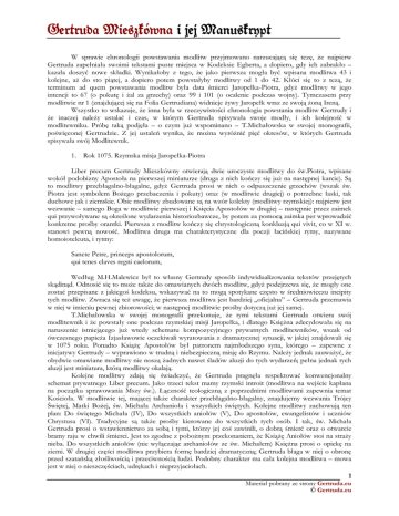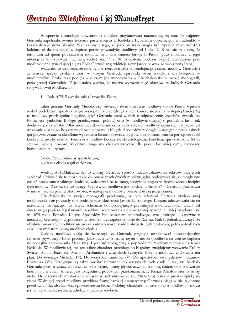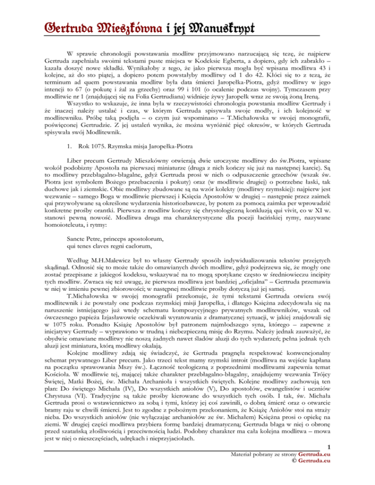 Gertruda Mieszkówna i jej Manuskrypt W sprawie chronologii powstawania modlitw przyjmowano narzucającą się tezę, Ŝe najpierw Gertruda zapełniała swoimi tekstami puste miejsca w Kodeksie Egberta, a dopiero, gdy ich zabrakło – kazała doszyć nowe składki. Wynikałoby z tego, Ŝe jako pierwsza mogła być wpisana modlitwa 43 i kolejne, aŜ do sto piątej, a dopiero potem powstałyby modlitwy od 1 do 42. Kłóci się to z tezą, Ŝe terminum ad quem powstawania modlitw była data śmierci Jaropełka-Piotra, gdyŜ modlitwy w jego intencji to 67 (o pokutę i Ŝal za grzechy) oraz 99 i 101 (o ocalenie podczas wojny). Tymczasem przy modlitwie nr 1 (znajdującej się na Folia Gertrudiana) widnieje Ŝywy Jaropełk wraz ze swoją Ŝoną Ireną. Wszystko to wskazuje, Ŝe inna była w rzeczywistości chronologia powstania modlitw Gertrudy i Ŝe inaczej naleŜy ustalać i czas, w którym Gertruda spisywała swoje modły, i ich kolejność w modlitewniku. Próbę taką podjęła – o czym juŜ wspominano – T.Michałowska w swojej monografii, poświęconej Gertrudzie. Z jej ustaleń wynika, Ŝe moŜna wyróŜnić pięć okresów, w których Gertruda spisywała swój Modlitewnik. 1. Rok 1075. Rzymska misja Jaropełka-Piotra Liber precum Gertrudy Mieszkówny otwierają dwie uroczyste modlitwy do św.Piotra, wpisane wokół podobizny Apostoła na pierwszej miniaturze (druga z nich kończy się juŜ na następnej karcie). Są to modlitwy przebłagalno-błagalne, gdyŜ Gertruda prosi w nich o odpuszczenie grzechów (wszak św. Piotra jest symbolem BoŜego przebaczenia i pokuty) oraz (w modlitwie drugiej) o potrzebne łaski, tak duchowe jak i ziemskie. Obie modlitwy zbudowane są na wzór kolekty (modlitwy rzymskiej): najpierw jest wezwanie – samego Boga w modlitwie pierwszej i Księcia Apostołów w drugiej – następnie przez zaimek qui przywoływane są określone wydarzenia historiozbawcze, by potem za pomocą zaimka per wprowadzić konkretne prośby orantki. Pierwsza z modlitw kończy się chrystologiczną konkluzją qui vivit, co w XI w. stanowi pewną nowość. Modlitwa druga ma charakterystyczne dla poezji łacińskiej rymy, nazywane homoioteleuta, i rytmy: Sancte Petre, princeps apostolorum, qui tenes claves regni caelorum, Według M.H.Malewicz był to własny Gertrudy sposób indywidualizowania tekstów przejętych skądinąd. Odnosić się to moŜe takŜe do omawianych dwóch modlitw, gdyŜ podejrzewa się, Ŝe mogły one zostać przepisane z jakiegoś kodeksu, wskazywać na to mogą spotykane często w średniowieczu incipity tych modlitw. Zwraca się teŜ uwagę, Ŝe pierwsza modlitwa jest bardziej „oficjalna” – Gertruda przemawia w niej w imieniu pewnej zbiorowości; w następnej modlitwie prośby dotyczą juŜ jej samej. T.Michałowska w swojej monografii przekonuje, Ŝe tymi tekstami Gertruda otwiera swój modlitewnik i Ŝe powstały one podczas rzymskiej misji Jaropełka, i dlatego KsięŜna zdecydowała się na naruszenie istniejącego juŜ wtedy schematu kompozycyjnego prywatnych modlitewników, wszak od ówczesnego papieŜa Izjasławowie oczekiwali wyratowania z dramatycznej sytuacji, w jakiej znajdowali się w 1075 roku. Ponadto KsiąŜę Apostołów był patronem najmłodszego syna, którego – zapewne z inicjatywy Gertrudy – wyprawiono w trudną i niebezpieczną misję do Rzymu. NaleŜy jednak zauwaŜyć, Ŝe obydwie omawiane modlitwy nie noszą Ŝadnych nawet śladów aluzji do tych wydarzeń; pełna jednak tych aluzji jest miniatura, którą modlitwy okalają. Kolejne modlitwy zdają się świadczyć, Ŝe Gertruda pragnęła respektować konwencjonalny schemat prywatnego Liber precum. Jako trzeci tekst mamy rzymski introit (modlitwa na wejście kapłana na początku sprawowania Mszy św.). Łączność teologiczną z poprzednimi modlitwami zapewnia temat Kościoła. W modlitwie tej, mającej takŜe charakter przebłagalno-błagalny, znajdujemy wezwania Trójcy Świętej, Matki BoŜej, św. Michała Archanioła i wszystkich świętych. Kolejne modlitwy zachowują ten plan: Do świętego Michała (IV), Do wszystkich aniołów (V), Do apostołów, ewangelistów i uczniów Chrystusa (VI). Tradycyjne są takŜe prośby kierowane do wszystkich tych osób. I tak, św. Michała Gertruda prosi o wstawiennictwo za sobą i tymi, którzy jej coś zawinili, o dobrą śmierć oraz o otwarcie bramy raju w chwili śmierci. Jest to zgodne z poboŜnym przekonaniem, Ŝe KsiąŜę Aniołów stoi na straŜy nieba. Do wszystkich aniołów (nie wyłączając archaniołów ze św. Michałem) KsięŜna prosi o opiekę na ziemi. W drugiej części modlitwa przybiera formę bardziej dramatyczną; Gertruda błaga w niej o obronę przed szatańską złośliwością i przeciwnością ludzi. Podobny charakter ma cała kolejna modlitwa – mowa jest w niej o nieszczęściach, udrękach i nieprzyjaciołach. 1 Materiał pobrany ze strony Gertruda.eu © Gertruda.eu Gertruda Mieszkówna i jej Manuskrypt W tym miejscu tekst się urywa, gdyŜ brakuje dwóch kart, mogących pomieścić ok. 90 linijek tekstu; dałoby to kilka modlitw przeciętnej długości. Na najbliŜszej ocalałej karcie (7r) cytowany juŜ tekst (VII) rozpoczyna się od słów: averte cor regis... Jest to – przypomnijmy - tekst bardziej osobisty, dość chaotyczny, pełny zagadkowych aluzji, a prośby do Boga kierowane są z dramatyczną natarczywością. Pierwsze pytanie, jakie się tu pojawia, dotyczy toŜsamości króla, dla którego Gertruda prosi o odwrócenie serca od nienawiści, niechęci i gniewu oraz o przychylność dla nieznanego sługi BoŜego. Gdy chodzi o króla, często myślano o polskim Bolesławie Śmiałym, który od 1076 roku był królem (B.Kürbis) lub o Izjasławie, niekiedy tytułowanym królem, np. w liście Grzegorza VII, (W.Meysztowicz). JednakŜe, jak przekonująco udowadnia T.Michałowska, „królem, którego w pierwszej połowie 1075 roku mogła obawiać się Gertruda i który mógł zagraŜa