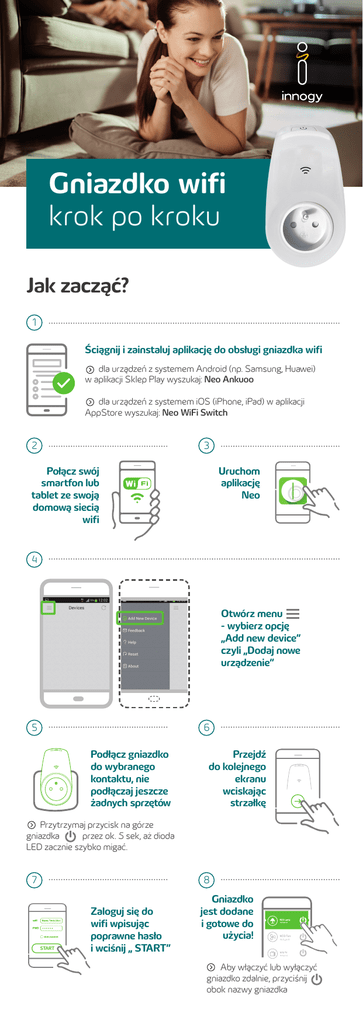 Gniazdko wifi krok po kroku Jak zacząć? 1 Ściągnij i zainstaluj aplikację do obsługi gniazdka wifi dla urządzeń z systemem Android (np. Samsung, Huawei) w aplikacji Sklep Play wyszukaj: Neo Ankuoo dla urządzeń z systemem iOS (iPhone, iPad) w aplikacji AppStore wyszukaj: Neo WiFi Switch 2 3 Połącz swój smartfon lub tablet ze swoją domową siecią wifi Uruchom aplikację Neo 4 Otwórz menu - wybierz opcję „Add new device” czyli „Dodaj nowe urządzenie” 5 6 Podłącz gniazdko do wybranego kontaktu, nie podłączaj jeszcze żadnych sprzętów Przejdź do kolejnego ekranu wciskając strzałkę Przytrzymaj przycisk na górze gniazdka przez ok. 5 sek, aż dioda LED zacznie szybko migać. 7 8 START Zaloguj się do wifi wpisując poprawne hasło i wciśnij „ START” Gniazdko jest dodane i gotowe do użycia! Aby włączyć lub wyłączyć gniazdko zdalnie, przyciśnij obok nazwy gniazdka Bezpieczeństwo Jak ustawiać harmonogramy pracy gniazdka? Jak włączyć funkcję antywłamaniową? 1 2 Otwórz aplikację NEO i kliknij w nazwę wybranego gniazdka Aby ustawić harmonogram pracy, kliknij „Schedule” , a następnie 3 Pamiętaj, aby zapisać ustawienia, klikając „OK” OK 4 Kliknij „Countdown” następnie w ,aby ustawić po jakim czasie gniazdko ma się automatycznie wyłączyć np. gdy prasujesz i boisz się, że zapomnisz na koniec wyjąć wtyczkę żelazka z gniazdka. 5 Pamiętaj, aby zapisać ustawienia, klikając „OK” OK 6 Kliknij „Anti-theft timer” następnie w , aby funkcja antywłamaniowa imitowała Twoją obecność, gdy Ty będziesz na wakacjach. Włączenie tej funkcji anuluje działanie innych harmonogramów („Schedule”) 7 Wybierz, w jakich godzinach („From” - od, „To” do), ile razy na dobę („On/off times”) i w jakich dniach tygodnia („Repeat day”) gniazdko ma od tej pory uruchamiać się losowo podczas Twojej nieobecności 8 Pamiętaj, aby zapisać ustawienia, klikając „OK” i oszczędność Jak monitorować zużycie energii? Jak sprawdzić, ile kosztuje prąd np. do telewizora, czajnika? 1 2 Wybierz jeden sprzęt, którego zużycie chcesz sprawdzić i podłącz je do inteligentnego gniazdka wifi Otwórz aplikację NEO i kliknij w nazwę wybranego gniazdka 3 Kliknij „Energy info” (informacja o zużyciu), aby sprawdzić zużycie energii danego sprzętu i jego koszt 4 Wejdź w ustawienia , aby wpisać swoją stawkę za energię Domyślnie w aplikacji jest ustawione 0,85 / kWh. W rzeczywistości jest to znaczne mniej – co można sprawdzić na swojej fakturze (dzieląc sumę faktury w złotówkach na całkowite zużycie w danym okresie w kWh) lub u Doradcy Obsługi RWE. Pamiętaj, aby zapisać nową stawkę za kWh, klikając „OK”. 5 Wybierz „24h”, aby aby sprawdzić, jak długo w ciągu ostatnich 24 godzin dany sprzęt był włączony („On”) i ile to kosztuje („Cost”) 6 Analogicznie możesz sprawdzić informację dla ostatnich 7 dni wybierając „Week”, ostatnich 30 dni – „Month” oraz ostatnich 12 miesięcy – „Year” 7 Wybierz „Real-time”, aby sprawdzić, jak długo dane gniazdko jest włączone („Last on for”), ile prądu zużyło („Total consumption”) i jaką moc pobiera w danej chwili („Real time consumption”) Najczęściej zadawane pytania 1 Nie mogę znaleźć aplikacji w AppStore. Co robić? Jeśli szukasz aplikacji na iPadzie, wybierz opcję „Tylko iPhone”. 2 Próbuję dodać gniazdko do aplikacji, ale nie działa. Co robić? Sprawdź czy wprowadzone hasło do sieci wifi jest poprawne Spróbuj ponownie Wyłącz całkowicie aplikację (a nie tylko ją ukryj), a następnie ponownie ją uruchom Uruchom ponownie telefon/ tablet Zadzwoń na infolinię 71 333 19 04 (czynna w godz. 8-16, pon-pt) 3 Nie da się wybrać symbolu złotówek w aplikacji. Co zrobić? Ustawienie złotówek nie jest możliwe w tej aplikacji, ale symbol waluty nie ma wpływu na poprawność przeliczeń, jeśli stawka wprowadzona w ustawieniach gniazdka jest poprawna i podana w polskich złotych. 4 Dane o zużyciu się nie zmieniają. Co robić? Wróć do głównego ekranu aplikacji z listą gniazdek i ponownie wejdź w szczegóły gniazdka i „Energy info” Wyłącz całkowicie aplikację (a nie tylko ją ukryj), a następnie ponownie ją uruchom. 5 Jakie urządzenia można podpiąć do gniazdka? Wszystkie sprzęty elektryczne, których moc nie przekracza 3 300 Watów, np. czajnik, żelazko, komputer, telewizor, monitor. 6 Czy do gniazdka można podłączyć listwę antyprzepięciową, aby sterować kilkoma sprzętami naraz? Można, ale należy pamiętać, że suma mocy wszystkich urządzeń nie może przekroczyć dozwolonej mocy 3 330 Watów. Przykładowo czajnik ma moc ok. 2 000 W, a zmywarka ok. 1 500 W. Dokładna moc podana jest na obudowie danego urządzenia lub w instrukcji. 7 Co się stanie, jeśli odłączę gniazdko od zasilania i przeniosę w nowe miejsce? Czy stracę historię zużycia i harmonogramy? Inteligentne gniazdko jest mobilne. Po odłączeniu od zasilania / kontaktu, historia zużycia i harmonogramy zostaną zachowane. Należy natomiast poczekać chwilę po podłączeniu gniazdka w nowe miejsce, aż gniazdko ponownie automatycznie nawiąże kontakt z domową siecią wifi. 8 Chciałbym wyłączać swój router wifi, gdy przebywam poza domem. Czy gniazdko w tej sytuacji będzie działać? Nie, gniazdko do prawidłowego działania potrzebuje włączonego routera wifi. W przypadku braku sieci wifi nie ma możliwości zdalnego sterowania gniazdkiem ani sprawdzenia historii zużycia energii. 9 Czy mogę sterować gniazdkiem z kilku smartfonów/ tabletów? Tak, to jest możliwe. Podłączenie gniazdka do nowego smartfonu / tabletu spowoduje jednak zresetowanie wszystkich ustawień gniazdka, w tym również skasowanie historii zużycia i harmonogramów. Rekomendujemy zainstalowanie aplikacji i podłączenie gniazdka do wszystkich urządzeń mobilnych w domu jednocześnie po zaku