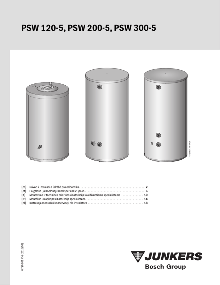 6 720 801 706-00.3T PSW 120-5, PSW 200-5, PSW 300-5 6 720 801 759 (2015/08) [cs] [et] [lt] [lv] [pl] Návod k instalaci a údržbě pro odborníka . . . . . . . . . . . . . . . . . . . . . . . . . . . . . . . . . . . . . . . . . . . . . 2 Paigaldus- ja hooldusjuhend spetsialisti jaoks . . . . . . . . . . . . . . . . . . . . . . . . . . . . . . . . . . . . . . . . . 6 Montavimo ir techninės priežiūros instrukcija kvalifikuotiems specialistams . . . . . . . . . . . . . . . 10 Montāžas un apkopes instrukcija speciālistam. . . . . . . . . . . . . . . . . . . . . . . . . . . . . . . . . . . . . . . . 14 Instrukcja montażu i konserwacji dla instalatora . . . . . . . . . . . . . . . . . . . . . . . . . . . . . . . . . . . . . . 18 Obsah Obsah 1 Použité symboly a všeobecná bezpečnostní upozornění . . . . 3 1.1 Použité symboly . . . . . . . . . . . . . . . . . . . . . . . . . . . . . . . . 3 1.2 Všeobecné bezpečnostní pokyny . . . . . . . . . . . . . . . . . . . 3 2 Údaje o výrobku . . . . . . . . . . . . . . . . . . . . . . . . . . . . . . . . . . . . . . . 3 2.1 Používání k určenému účelu . . . . . . . . . . . . . . . . . . . . . . . 3 2.2 Rozsah dodávky . . . . . . . . . . . . . . . . . . . . . . . . . . . . . . . . . 3 2.3 Technické údaje . . . . . . . . . . . . . . . . . . . . . . . . . . . . . . . . . 3 2.4 Popis výrobku . . . . . . . . . . . . . . . . . . . . . . . . . . . . . . . . . . 3 2.5 Typový štítek . . . . . . . . . . . . . . . . . . . . . . . . . . . . . . . . . . . 3 3 Předpisy . . . . . . . . . . . . . . . . . . . . . . . . . . . . . . . . . . . . . . . . . . . . . 4 4 Doprava . . . . . . . . . . . . . . . . . . . . . . . . . . . . . . . . . . . . . . . . . . . . . . 4 5 Montáž . . . . . . . . . . . . . . . . . . . . . . . . . . . . . . . . . . . . . . . . . . . . . . 4 5.1 Prostor pro umístění . . . . . . . . . . . . . . . . . . . . . . . . . . . . . 4 5.2 Ustavení akumulačního zásobníku . . . . . . . . . . . . . . . . . . 4 5.3 Hydraulické připojení . . . . . . . . . . . . . . . . . . . . . . . . . . . . 4 5.4 Připojení čidla teploty . . . . . . . . . . . . . . . . . . . . . . . . . . . . 4 6 Uvedení do provozu . . . . . . . . . . . . . . . . . . . . . . . . . . . . . . . . . . . 5 7 Ochrana životního prostředí/Likvidace odpadu . . . . . . . . . . . . 5 8 Údržba . . . . . . . . . . . . . . . . . . . . . . . . . . . . . . . . . . . . . . . . . . . . . . . 5 9 Odstavení z provozu . . . . . . . . . . . . . . . . . . . . . . . . . . . . . . . . . . . 5 2 PSW 120-5, PSW 200-5, PSW 300-5 – 6 720 801 759 (2015/08) Použité symboly a všeobecná bezpečnostní upozornění 1 Použité symboly a všeobecná bezpečnostní upozornění 2 Údaje o výrobku 2.1 Používání k určenému účelu 1.1 Použité symboly Akumulační zásobníky smějí být plněny pouze otopnou vodou. Výstražné pokyny Výstražná upozornění uvedená v textu jsou označena výstražným trojúhelníkem. Signální výrazy navíc označují druh a závažnost následků, které mohou nastat, nebudou-li dodržena opatření k odvrácení nebezpečí. Akumulační zásobníky používejte pouze v uzavřených topných systémech. Akumulační zásobníky PSW 120/200/300-5 provozujte přednostně v kombinaci s tepelnými čerpadly. Každé jiné použití se považuje za použití v rozporu s určeným účelem. Škody, které by tak vznikly, jsou vyloučeny ze záruky. 2.2 Následující signální výrazy jsou definovány a mohou být použity v této dokumentaci: • OZNÁMENÍ znamená, že může dojít k materiálním škodám. • UPOZORNĚNÍ znamená, že může dojít k lehkým až středně těžkým poraněním osob. • VAROVÁNÍ znamená, že může dojít ke vzniku těžkých až život ohrožujících poranění osob. • NEBEZPEČÍ znamená, že dojde k těžkým až život ohrožujícím újmám na zdraví osob. Důležité informace Důležité informace neobsahující ohrožení člověka nebo materiálních hodnot jsou označeny vedle uvedeným symbolem. 2.3 Symbol ▶ • – Význam Požadovaný úkon Odkaz na jiné místo v dokumentu Výčet/položka seznamu Výčet/položka seznamu (2. rovina) PSW PSW PSW Jednotka 120-5 200-5 300-5 l 120 200 300 kWh/24h 1,6 1,8 1,94 Užitečný objem (celkový) Náklady na teplo pohotovostního stavu1) Maximální teplota otopné vody °C Maximální provozní tlak otopné bar vody (přetlak) Všeobecné bezpečnostní pokyny Všeobecné informace Tento návod k instalaci a údržbě je určen pro odborníka. Nedodržování bezpečnostních upozornění může vést k těžkým újmám na zdraví. ▶ Přečtěte si bezpečnostní upozornění a dodržujte pokyny, které jsou v nich uvedené. ▶ Aby byla zaručena bezchybná funkce, dodržujte pokyny uvedené v návodu k instalaci a údržbě. ▶ Zdroj tepla a příslušenství namontujte a uveďte do provozu podle příslušného návodu k instalaci. ▶ Nepoužívejte otevřené expanzní nádoby. ▶ Pojistný ventil nikdy nezavírejte! 2.4 Poz. 1 2 3 4 5 6 7 8 9 10 11 90 3 90 3 Technické údaje Popis výrobku Popis Výstup otopného okruhu Opláštění, lakovaný plech s tepelnou izolací z tvrdé polyuretanové pěny Zpátečka otopného okruhu Zpátečka do tepelného čerpadla Jímka pro čidlo teploty ve zpátečce (GT1) (Měřicí místo) Vypouštěcí kohout Nádrž zásobníku, ocel Výstup z tepelného čerpadla Zátka s jímkou pro čidlo teploty na výstupu (T1) Odvzdušňovač Víko opláštění z polystyrenu Tab. 3 Popis výrobku ( obr. 2, str. 23) 2.5 Typový štítek Typový štítek se nachází nahoře na zadní straně akumulačního zásobníku a obsahuje tyto údaje: Poz. 1 2 3 4 6 9 17 Tab. 4 PSW 120-5, PSW 200-5, PSW 300-5 – 6 720 801 759 (2015/08) 90 3 1) EN 12897; Ztráty v rozvodu mimo akumulační zásobník nejsou zohledněny Tab. 1 1.2 Technické údaje • Rozměry a technické údaje ( obr. 