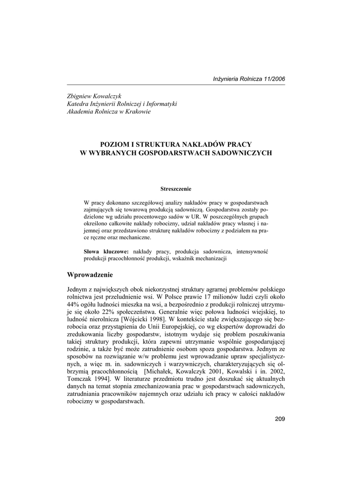 ¦InŜynieria Rolnicza 11/2006 Zbigniew Kowalczyk Katedra InŜynierii Rolniczej i Informatyki Akademia Rolnicza w Krakowie POZIOM I STRUKTURA NAKŁADÓW PRACY W WYBRANYCH GOSPODARSTWACH SADOWNICZYCH Streszczenie W pracy dokonano szczegółowej analizy nakładów pracy w gospodarstwach zajmujących się towarową produkcją sadowniczą. Gospodarstwa zostały podzielone wg udziału procentowego sadów w UR. W poszczególnych grupach określono całkowite nakłady robocizny, udział nakładów pracy własnej i najemnej oraz przedstawiono strukturę nakładów robocizny z podziałem na prace ręczne oraz mechaniczne. Słowa kluczowe: nakłady pracy, produkcja sadownicza, intensywność produkcji pracochłonność produkcji, wskaźnik mechanizacji Wprowadzenie Jednym z największych obok niekorzystnej struktury agrarnej problemów polskiego rolnictwa jest przeludnienie wsi. W Polsce prawie 17 milionów ludzi czyli około 44% ogółu ludności mieszka na wsi, a bezpośrednio z produkcji rolniczej utrzymuje się około 22% społeczeństwa. Generalnie więc połowa ludności wiejskiej, to ludność nierolnicza [Wójcicki 1998]. W kontekście stale zwiększającego się bezrobocia oraz przystąpienia do Unii Europejskiej, co wg ekspertów doprowadzi do zredukowania liczby gospodarstw, istotnym wydaje się problem poszukiwania takiej struktury produkcji, która zapewni utrzymanie wspólnie gospodarującej rodzinie, a takŜe być moŜe zatrudnienie osobom spoza gospodarstwa. Jednym ze sposobów na rozwiązanie w/w problemu jest wprowadzanie upraw specjalistycznych, a więc m. in. sadowniczych i warzywniczych, charakteryzujących się olbrzymią pracochłonnością [Michałek, Kowalczyk 2001, Kowalski i in. 2002, Tomczak 1994]. W literaturze przedmiotu trudno jest doszukać się aktualnych danych na temat stopnia zmechanizowania prac w gospodarstwach sadowniczych, zatrudniania pracowników najemnych oraz udziału ich pracy w całości nakładów robocizny w gospodarstwach. %#,¦ MU\Za\Xj¦>bjT_Vml^¦¦ ¦ PowyŜsze problemy były przedmiotem badań prowadzonych na obszarze Małopolski. Badaniami objęto 35 gospodarstw sadowniczych połoŜonych na terenie gminy Łańcut. Badania polegały na rejestrze zdarzeń gospodarczych, umoŜliwiającym ustalenie stosowanych technologii produkcji, co z kolei pozwoliło na dokonanie analizy wielkości i struktury nakładów pracy w gospodarstwach. Analizy tej dokonano w gospodarstwach podzielonych wg udziału upraw sadowniczych w powierzchni UR gospodarstw. W wyniku podziału powstały trzy grupy: – I – do 50% pow. sadów w UR, – II – od 50 do 80% sadów w UR, – III – pow. 80% sadów w UR. Wskaźnik mechanizacji obliczono jako udział prac wykonywanych z wykorzystaniem technicznych środków produkcji w całości nakładów robocizny w gospodarstwach. Wyniki badań W wybranych do badań gospodarstwach wśród upraw sadowniczych dominowały sady jabłoniowe, które występowały w około 65% gospodarstw, a ich średnia powierzchnia wynosiła 5,0 ha. Poza jabłoniami uprawiano takŜe: – czarne porzeczki – występowały w 50% gospodarstw, a średnia powierzchnia upraw to 2,9 ha, – maliny – występowały w 20% gospodarstw, a średnia powierzchnia upraw wynosiła 0,8 ha, – truskawki– występowały w 23% gospodarstw, a średnia powierzchnia to 3,4 ha, – a takŜe rzadziej: grusze, śliwy, wiśnie, czereśnie, agrest, aronię i orzechy. Tabela 1. Struktura uŜytkowania ziemi Table 1. Land usage structure Udział sadów w UR Pow. gosp. [%] [ha] UR [ha] Śred. do 50% Min. Max. Śred. 50 – 80% Min. Max. Śred. pow. 80% Min. Max. %$#¦ 29,6 6,6 100,0 10,0 3,0 36,0 6,7 2,2 34,0 26,9 5,3 91,0 9,2 2,6 35,0 6,2 2,0 33,0 UŜytki rolne GO 57,1 37,7 82,1 25,7 3,8 45,7 2,2 0,0 18,2 w tym [%] UZ 9,1 0,0 20,8 7,2 0,0 19,2 0,0 0,0 0,0 Sady 33,8 17,9 44,4 67,1 54,3 77,8 97,8 81,8 100,0 ¦Cbm\b`¦\¦fgeh^gheT¦aT^ÄTWÇj¦ceTVl!!!¦ Powierzchnia gospodarstw była bardzo zróŜnicowana (tab. 1): od zaledwie 2,2 ha, do 100 ha (średnio 12,4 ha). Dominującą pozycję w strukturze uŜytków rolnych zajmowały sady (58%), następnie – grunty orne (37%) i uŜytki zielone (5%). Analizując tabelę 1 moŜna zauwaŜyć, Ŝe największy odsetek sadów w gruntach rolnych (średnio 97,8%) występuje w grupie gospodarstw najmniejszych, co z uwagi na znaczną intensywność produkcji sadowniczej wydaje się być logiczne. W tabeli 2 przedstawiono nakłady pracy oraz wskaźnik mechanizacji prac w grupach gospodarstw podzielonych wg kryteriów zawartych w metodyce. Tabela 2. Nakłady pracy, wskaźnik mechanizacji prac Table 2. Labor expenditures, index of work mechanization Udział sadów w UR [%] Śred. Min. Max. Śred. 50 – 80% Min. Max. Śred. pow. 80% Min. Max. do 50% Nakłady pracy [rbh/ha UR] Prace ręczne Prace mechaniczne RAZEM Wskaźnik mechanizacji [%] 477 96 942 487 287 737 545 129 1330 75 34 149 88 30 309 50 12 88 552 132 1007 575 332 1033 595 163 1381 20 6 41 14 8 30 10 3 21 Warto zauwaŜyć, Ŝe wzrost udziału upraw sadowniczych w powierzchni uŜytków rolnych nie wpływa w znaczący sposób na kształtowanie się poziomu nakładów robocizny. Brak powyŜszej zaleŜności wynika z róŜnic odnośnie uprawianych roślin, mianowicie wzrost udziału sadów w UR gospodarstw jest związany jednocześnie ze zmianą charakteru produkcji. W miejsce upraw bardzo pracochłonnych, jak: maliny, truskawki czy jabłonie wprowadzane są rośliny, których zbiór owoców łatwiej zmechanizować, a więc np. czarne porzeczki, agrest. Generalnie moŜna stwierdzić, Ŝe nakłady robocizny w badanych gospodarstwach są bardzo wysokie (średnio 552–595 rbh/ha UR). Na tak wysoki poziom wpływa głównie niski stopień zmechanizowania prac (średnio Wm = 10–20%), zwłaszcza związanych z pielęgnacją, zbiorem oraz przygotowaniem do sprzedaŜy i samą sprzedaŜą. Technologie produkcji uprawianych w gospodarstwach roślin sadowniczych róŜnią się od siebie dość znacząc