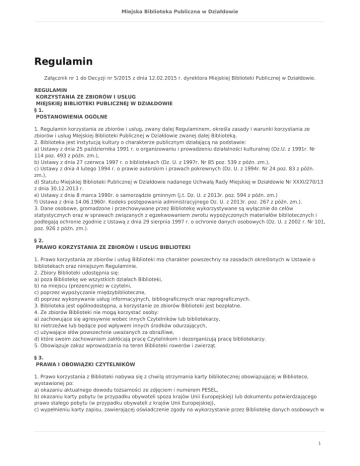 Miejska Biblioteka Publiczna w Działdowie Regulamin Załącznik nr 1 do Decyzji nr 5/2015 z dnia 12.02.2015 r. dyrektora Miejskiej Biblioteki Publicznej w Działdowie. REGULAMIN KORZYSTANIA ZE ZBIORÓW I USŁUG MIEJSKIEJ BIBLIOTEKI PUBLICZNEJ W DZIAŁDOWIE § 1. POSTANOWIENIA OGÓLNE 1. Regulamin korzystania ze zbiorów i usług, zwany dalej Regulaminem, określa zasady i warunki korzystania ze zbiorów i usług Miejskiej Biblioteki Publicznej w Działdowie zwanej dalej Biblioteką. 2. Biblioteka jest instytucją kultury o charakterze publicznym działającą na podstawie: a) Ustawy z dnia 25 października 1991 r. o organizowaniu i prowadzeniu działalności kulturalnej (Dz.U. z 1991r. Nr 114 poz. 493 z późn. zm.), b) Ustawy z dnia 27 czerwca 1997 r. o bibliotekach (Dz. U. z 1997r. Nr 85 poz. 539 z późn. zm.), c) Ustawy z dnia 4 lutego 1994 r. o prawie autorskim i prawach pokrewnych (Dz. U. z 1994r. Nr 24 poz. 83 z późn. zm.), d) Statutu Miejskiej Biblioteki Publicznej w Działdowie nadanego Uchwałą Rady Miejskiej w Działdowie Nr XXXI/270/13 z dnia 30.12.2013 r. e) Ustawy z dnia 8 marca 1990r. o samorządzie gminnym (j.t. Dz. U. z 2013r. poz. 594 z późn. zm.) f) Ustawa z dnia 14.06.1960r. Kodeks postępowania administracyjnego Dz. U. z 2013r. poz. 267 z późn. zm.). 3. Dane osobowe, gromadzone i przechowywane przez Bibliotekę wykorzystywane są wyłącznie do celów statystycznych oraz w sprawach związanych z egzekwowaniem zwrotu wypożyczonych materiałów bibliotecznych i podlegają ochronie zgodnie z Ustawą z dnia 29 sierpnia 1997 r. o ochronie danych osobowych (Dz. U. z 2002 r. Nr 101, poz. 926 z późn. zm.). § 2. PRAWO KORZYSTANIA ZE ZBIORÓW I USŁUG BIBLIOTEKI 1. Prawo korzystania ze zbiorów i usług Biblioteki ma charakter powszechny na zasadach określonych w Ustawie o bibliotekach oraz niniejszym Regulaminie. 2. Zbiory Biblioteki udostępnia się: a) poza Bibliotekę we wszystkich działach Biblioteki, b) na miejscu (prezencyjnie) w czytelni, c) poprzez wypożyczanie międzybiblioteczne, d) poprzez wykonywanie usług informacyjnych, bibliograficznych oraz reprograficznych. 3. Biblioteka jest ogólnodostępna, a korzystanie ze zbiorów Biblioteki jest bezpłatne. 4. Ze zbiorów Biblioteki nie mogą korzystać osoby: a) zachowujące się agresywnie wobec innych Czytelników lub bibliotekarzy, b) nietrzeźwe lub będące pod wpływem innych środków odurzających, c) używające słów powszechnie uważanych za obraźliwe, d) które swoim zachowaniem zakłócają pracę Czytelnikom i dezorganizują pracę bibliotekarzy. 5. Obowiązuje zakaz wprowadzania na teren Biblioteki rowerów i zwierząt. § 3. PRAWA I OBOWIĄZKI CZYTELNIKÓW 1. Prawo korzystania z Biblioteki nabywa się z chwilą otrzymania karty bibliotecznej obowiązującej w Bibliotece, wystawionej po: a) okazaniu aktualnego dowodu tożsamości ze zdjęciem i numerem PESEL, b) okazaniu karty pobytu (w przypadku obywateli spoza krajów Unii Europejskiej) lub dokumentu potwierdzającego prawo stałego pobytu (w przypadku obywateli z krajów Unii Europejskiej), c) wypełnieniu karty zapisu, zawierającej oświadczenie zgody na wykorzystanie przez Bibliotekę danych osobowych w 1 Miejska Biblioteka Publiczna w Działdowie celach statystycznych oraz w sprawach związanych ze zwrotem wypożyczonych książek, d) potwierdzeniu podpisem zobowiązania do przestrzegania Regulaminu Biblioteki. 2. Za niepełnoletniego Czytelnika odpowiadają i podpisują zobowiązanie rodzice lub opiekunowie prawni. Podstawą zapisu niepełnoletniego Czytelnika jest dowód tożsamości jednego z rodziców lub opiekuna prawnego oraz ważna legitymacja szkolna. 3. Czytelnik podczas korzystania z usług Biblioteki powinien każdorazowo posługiwać się kartą biblioteczną. 4. Za wydanie karty bibliotecznej Biblioteka nie pobiera opłat. 5. Czytelnik Biblioteki jest odpowiedzialny za wszystkie wypożyczenia dokonane przy użyciu jego karty i jest zobowiązany do jej ochrony przed zgubieniem lub zniszczeniem. Zgubienie lub zniszczenie karty należy niezwłocznie zgłosić w Bibliotece i wypełnić pisemne oświadczenie o jej utracie (druk dostępny w Bibliotece i na stronie www.mbpdzialdowo.pl). 6. Biblioteka nie ponosi odpowiedzialności za posługiwanie się kartą biblioteczną przez osoby trzecie do czasu zgłoszenia zastrzeżenia karty przez właściciela. 7. Przy wydaniu kolejnej karty pobiera się opłatę w wysokości określonej w Cenniku opłat i usług Miejskiej Biblioteki Publicznej w Działdowie. 8. Uprawnień wynikających z posiadania karty bibliotecznej nie wolno odstępować innej osobie. Właściciel karty ponosi odpowiedzialność za każde jej użycie. 9. Czytelnik zobowiązany jest informować Bibliotekę o każdorazowej zmianie danych: swoich i osoby poręczającej (nazwisko, adres zameldowania, adres do korespondencji, adres e-mail, szkoła i in.). 10. Podanie adresu e-mail przez Czytelnika jest równoznaczne z wyrażeniem przez niego zgody na systemowe wysyłanie przez Bibliotekę monitów i materiałów promocyjnych (zaproszenia, komunikaty). 11. Czytelnik przychodzący do Biblioteki zostawia wierzchnie okrycie w miejscu wskazanym przez bibliotekarza (Biblioteka nie ponosi odpowiedzialności za pozostawione rzeczy). 12. Likwidacja konta czytelniczego możliwa jest na prośbę Czytelnika, po zwrocie karty czytelniczej, wyłącznie po uregulowaniu wszelkich zaległości w stosunku do Biblioteki. 13. Po upływie 5 lat od chwili zaprzestania korzystania z usług Biblioteki konto Czytelnika zostanie zlikwidowane, a dane osobowe usunięte z bazy danych. Likwidacja konta następuje tylko wtedy, gdy Czytelnik nie ma na koncie żadnych zaległości. 14. W przypadku śmierci Czytelnika – na podstawie aktu zgonu dostarczonego do Biblioteki – jego konto zostanie zlikwidowane, a wierzytelności będą umorzone. 15. Czytelnik niestosujący się do przepisów niniejszego Regulaminu lub zachowujący się niezgodnie z po