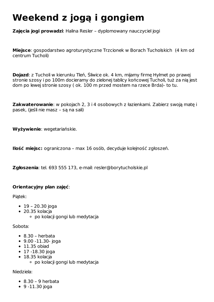 Weekend z jogą i gongiem Zajęcia jogi prowadzi: Halina Resler – dyplomowany nauczyciel jogi Miejsce: gospodarstwo agroturystyczne Trzcionek w Borach Tucholskich (4 km od centrum Tucholi) Dojazd: z Tucholi w kierunku Tleń, Śliwice ok. 4 km, mijamy firmę Hylmet po prawej stronie szosy i po 100m docieramy do zielonej tablicy końcowej Tucholi, tuż za nią jest dom po lewej stronie szosy ( ok. 100 m przed mostem na rzece Brda)- to tu. Zakwaterowanie: w pokojach 2, 3 i 4 osobowych z łazienkami. Zabierz swoją matę i pasek, (jeśli nie masz – są na sali) Wyżywienie: wegetariańskie. Ilość miejsc: ograniczona – max 16 osób, decyduje kolejność zgłoszeń. Zgłoszenia: tel. 693 555 173, e-mail: [email protected] Orientacyjny plan zajęć: Piątek: 19 – 20.30 joga 20.35 kolacja po kolacji gongi lub medytacja Sobota: 8.30 – herbata 9.00 -11.30- joga 11.35 obiad 17 -18.30 joga 18.35 kolacja po kolacji gongi lub medytacja Niedziela: 8.30 – 9 herbata 9 -11.30 joga 11.35 obiad 15 -16.30 joga 16.35 kolacja Link do wydarzenia: http://bonavita.pl/kalendarz/t/weekend-z-joga-i-gongiem