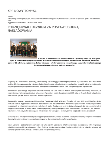KPP NOWY TOMYŚL Źródło: http://nowy-tomysl.policja.gov.pl/w15/informacje/komunikaty/78430,Podziekowali-uczniom-za-postawe-godna-nasladowania. html Wygenerowano: Wtorek, 7 marca 2017, 22:44 PODZIĘKOWALI UCZNIOM ZA POSTAWĘ GODNĄ NAŚLADOWANIA W piątek, 9 października w Zespole Szkół w Opalenicy odbył się uroczysty apel, w trakcie którego podziękowano uczniom z klasy mundurowej za profesjonalne udzielenie pierwszej pomocy 62-letniemu mężczyźnie. Dzięki odwadze i wiedzy uczniów z opalenickiego Liceum Ogólnokształcącego im. Kardynała Wyszyńskiego mężczyzna przeżył. O sytuacji z 2 października pisaliśmy już wcześniej, ale warto ją jeszcze raz przypomnieć. 2 października 2015 roku około godziny 14:30, grupka uczniów z Liceum Ogólnokształcącego w Opalenicy przywróciła akcję serca 62-letniemu mężczyźnie. Ich postępowanie wymagało niesamowitej odwagi oraz opanowania i zimnej krwi, którą niewątpliwie się wykazali. Bohaterowie podkreślają, że podczas akcji ratowniczej nie czuli strachu. Działali pod wpływem adrenaliny. Wiedzieli, że nieprzytomny mężczyzna potrzebuje ich pomocy. W miniony piątek 9 października 2015 roku, w Zespole Szkół w Opalenicy, podczas uroczystego apelu ich postawa została nagrodzona. Bohaterskiej postawy pogratulował Komendant Powiatowy Policji w Nowym Tomyślu mł. insp. Wojciech Kolasiński, który podczas krótkiej wypowiedzi stwierdził, że bardzo ważne jest ukazywanie właściwych postaw ludzi, którzy odpowiednio zareagowali w sytuacjach zagrożenia życia innych osób. Zależy nam na tym, żeby pokazywać, że nie powinniśmy być obojętni w sytuacjach, w których ktoś potrzebuje pomocy. Mamy dobrą młodzież. To nieprawda, że młodzież jest nieczuła i niewrażliwa. Ten przypadek pokazuje, że młodzi ludzie nie wahają się i potrafią szybko reagować w takich sytuacjach. Gratulacje oraz podziękowania za postawę godną naśladowania, młodzi uczniowie z klasy mundurowej, otrzymali również od Starosty Nowotomyskiego Ireneusza Kozeckiego oraz Burmistrza Opalenicy Tomasza Szulca. Słowa uznania i podziękowania usłyszeli nie tylko dzielni uczniowie. Wielkie gratulację za codzienny wkład i pracę z młodzieżą usłyszeli ich wychowawcy - Pani Elżbieta Mortka oraz Jarosław Cyprian – dzięki którym młodzież zdobyła tak fachową i profesjonalną wiedzę z zakresu udzielania pierwszej pomocy. podziekowania za postawe godna nasladowania Ocena: 0/5 (0) Tweetnij