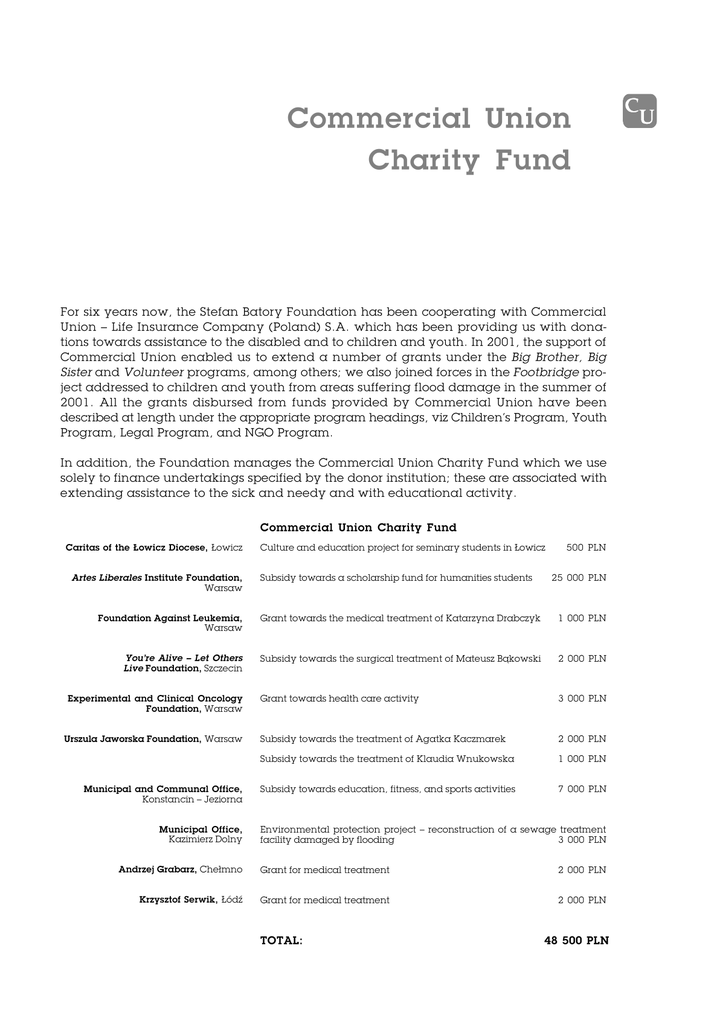 107 Commercial Union Charity Fund For six years now, the Stefan Batory Foundation has been cooperating with Commercial Union – Life Insurance Company (Poland) S.A. which has been providing us with donations towards assistance to the disabled and to children and youth. In 2001, the support of Commercial Union enabled us to extend a number of grants under the Big Brother, Big Sister and Volunteer programs, among others; we also joined forces in the Footbridge project addressed to children and youth from areas suffering flood damage in the summer of 2001. All the grants disbursed from funds provided by Commercial Union have been described at length under the appropriate program headings, viz Children’s Program, Youth Program, Legal Program, and NGO Program. In addition, the Foundation manages the Commercial Union Charity Fund which we use solely to finance undertakings specified by the donor institution; these are associated with extending assistance to the sick and needy and with educational activity. Commercial Union Charity Fund Caritas of the £owicz Diocese, £owicz Artes Liberales Institute Foundation, Warsaw Culture and education project for seminary students in £owicz Subsidy towards a scholarship fund for humanities students 500 PLN 25 000 PLN Foundation Against Leukemia, Grant towards the medical treatment of Katarzyna Drabczyk 1 000 PLN You’re Alive – Let Others Live Foundation, Szczecin Subsidy towards the surgical treatment of Mateusz B¹kowski 2 000 PLN Grant towards health care activity 3 000 PLN Subsidy towards the treatment of Agatka Kaczmarek 2 000 PLN Subsidy towards the treatment of Klaudia Wnukowska 1 000 PLN Subsidy towards education, fitness, and sports activities 7 000 PLN Warsaw Experimental and Clinical Oncology Foundation, Warsaw Urszula Jaworska Foundation, Warsaw Municipal and Communal Office, Konstancin – Jeziorna Municipal Office, Kazimierz Dolny Environmental protection project – reconstruction of a sewage treatment facility damaged by flooding 3 000 PLN Andrzej Grabarz, Che³mno Grant for medical treatment 2 000 PLN Krzysztof Serwik, £ódŸ Grant for medical treatment 2 000 PLN TOTAL: 48 500 PLN