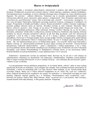 Harce w świątyniach Niedawno media, z wyraźnym zadowoleniem, informowały o pokazie, jaki odbył się przed Ojcem Świętym. Produkowali się przed nim rozmaici raperzy i ludzie tańczący, popularny ostatnio breakdance. Niewtajemniczonym wyjaśniam, ze jest to odmiana ulicznego tańca cechująca się, wręcz akrobatycznymi figurami. Nie powiem - całkiem efektowny. Natomiast rap to muzyka amerykańskich szumowin, wykonywana głównie przez murzynów pełna agresji i wulgaryzmów. Ojcu Świętemu zaprezentowano oczywiście jej „ucywilizowaną” wersję. Taki to powstaje nam „kościół” - nowoczesny i postępowy. I u nas z tym nie lepiej. Najświętszy Sakrament zaczynają rozdawać wiernym, czekającym w kolejkach i na stojąco. Przypomina to kolejki pod budką z piwem. Księża poschodzili z ambon i kazania wygłaszają z poziomu podłogi obróceni tyłem do Sacrum. Wszelkie nowinki są mile widziane. Miewamy Msze bitowe, rockowe, jazzowe i inne. Postęp, aż się kurzy! W każdej parafii liturgia jest trochę inna – w zależności od upodobań proboszcza. Pełna tolerancja, Europa. Czyżby? Okazuje się, że nie do końca. Kościelna „tolerancja” działa tylko w jedną stronę, niestety tę fałszywą. Niedawno mój znajomy, któremu urodziła się śliczna córeczka postanowił ochrzcić ją jak Pan Bóg przykazał, czyli bez dziwacznych wygibasów i rock & rolla w czasie liturgii, ale za to z łaciną i pełnym, normalnym, tradycyjnym obrządkiem. Nawet jest w Poznaniu kapłan, który się tego podjął. Niestety wymagana była zgoda biskupa (!!!) na udzielenie sakramentu Chrztu w tradycyjnej formie. Na jazz w świątyni zgody nie potrzeba, na łacinę – tak. Ale najśmieszniejsze jest to, że biskup takiej zgody... nie wyraził!! Zaiste racje miał jeden z Papieży mówiąc, że „Smród piekieł przedostał się przez jakąś szczelinę do Kościoła”. Zresztą Kościół (przepraszam większość duchowieństwa – piszę o skumanych z władzą purpuratach, a nie o starej, uczciwej plebani) strzela sobie bramki samobójcze już od jakiegoś czasu. Konkretnie od czasu Vaticanum Secundum, czyli Soboru Watykańskiego II. Radykałowie twierdzą nawet, że ten nieszczęsny Sobór, Kościół katolicki uczynił protestanckim, a wręcz judaistycznym. Coś w tym jest. Znakomicie i dynamicznie rozwija się natomiast Islam. Rozwija się, bo nie ma w nim miejsca na reformatorstwo, tolerancję czy ekumenizm. Jest tradycyjny i fundamentalny. Podobnie zresztą judaizm. Obie te religie uważają innowierców za coś w rodzaju zwierząt – zero tolerancji dla niewiernych i gojów. I dobrze na tym wychodzą. A ja przypominam naszym pulchnym purpuratom, że na skutek takich „reform”, jakie tu nam szykują opustoszały Kościoły na zachodzie i życie religijne tam zamarło. Sam widziałem kościoły przerobione na mieszkania, a nawet na australijski pub. Czy tego chcecie? Mam nadzieję, że nie. Zresztą każda akcja wywołuje reakcję. Mamy już w Polsce Bractwo Kapłańskie im św. Piusa XII, czyli tzw. Lefebryści, którzy żadnych posoborowych wygibasów nie uznają. Na zachodzie i w Amerykach rozwijają się coraz prężniej. Zapewne wkrótce pojawią się i w Poznaniu. Chrześcijaństwo musi wyzdrowieć, czyli – powrócić do tradycji. Piękny film, Mela Gibsona „Pasja” na pewno mu w tym pomoże. Jako wierzący, rzymski katolik mam taką nadzieję. A film gorąco polecam. Wspaniały.