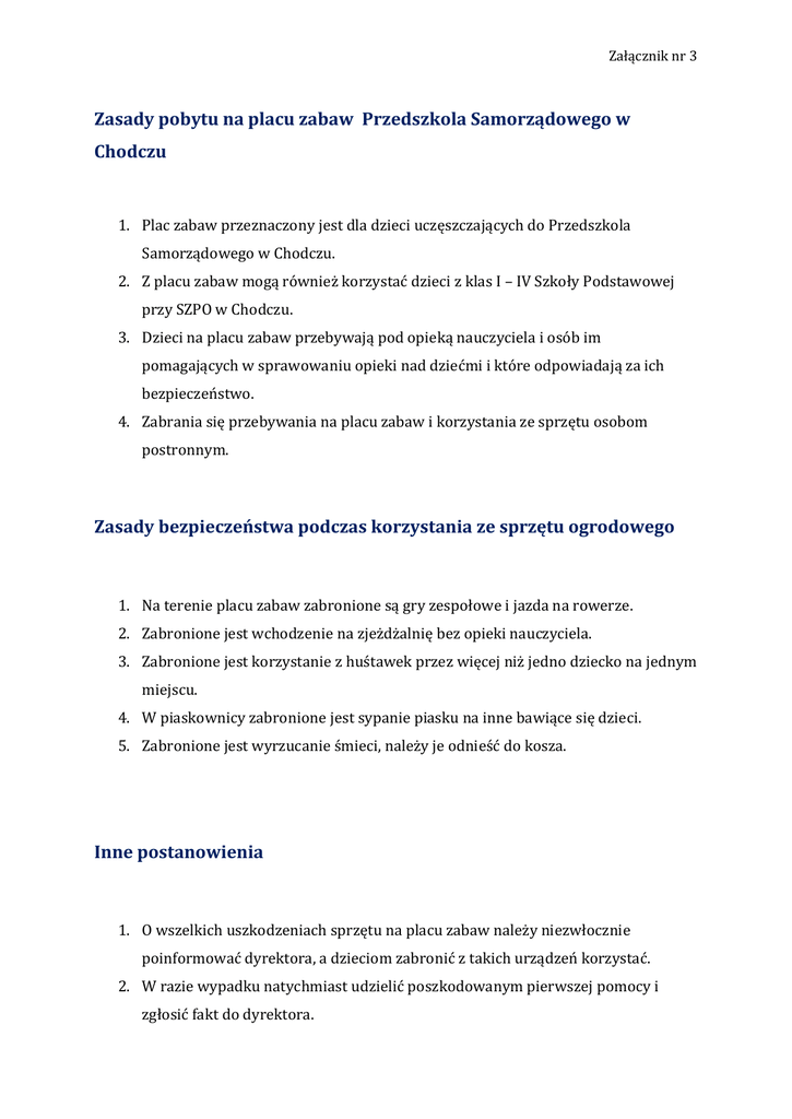 Załącznik nr 3 Zasady pobytu na placu zabaw Przedszkola Samorządowego w Chodczu 1. Plac zabaw przeznaczony jest dla dzieci uczęszczających do Przedszkola Samorządowego w Chodczu. 2. Z placu zabaw mogą również korzystać dzieci z klas I – IV Szkoły Podstawowej przy SZPO w Chodczu. 3. Dzieci na placu zabaw przebywają pod opieką nauczyciela i osób im pomagających w sprawowaniu opieki nad dziećmi i które odpowiadają za ich bezpieczeństwo. 4. Zabrania się przebywania na placu zabaw i korzystania ze sprzętu osobom postronnym. Zasady bezpieczeństwa podczas korzystania ze sprzętu ogrodowego 1. Na terenie placu zabaw zabronione są gry zespołowe i jazda na rowerze. 2. Zabronione jest wchodzenie na zjeżdżalnię bez opieki nauczyciela. 3. Zabronione jest korzystanie z huśtawek przez więcej niż jedno dziecko na jednym miejscu. 4. W piaskownicy zabronione jest sypanie piasku na inne bawiące się dzieci. 5. Zabronione jest wyrzucanie śmieci, należy je odnieść do kosza. Inne postanowienia 1. O wszelkich uszkodzeniach sprzętu na placu zabaw należy niezwłocznie poinformować dyrektora, a dzieciom zabronić z takich urządzeń korzystać. 2. W razie wypadku natychmiast udzielić poszkodowanym pierwszej pomocy i zgłosić fakt do dyrektora. Załącznik nr 3 3. Miejsce wypadku zabezpieczyć i nie korzystać z niego, aż do ustalenia przebiegu zdarzenia. 4. Plac zabaw ma służyć wypoczynkowi dzieci, starajmy się by zabawa była bezpieczna.