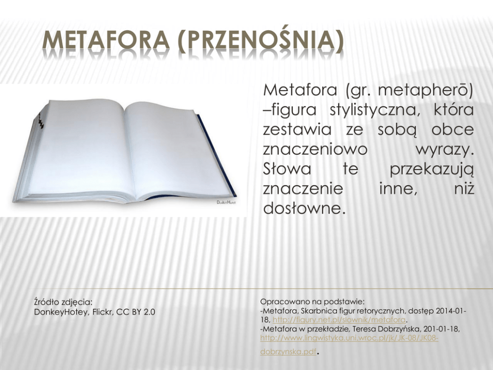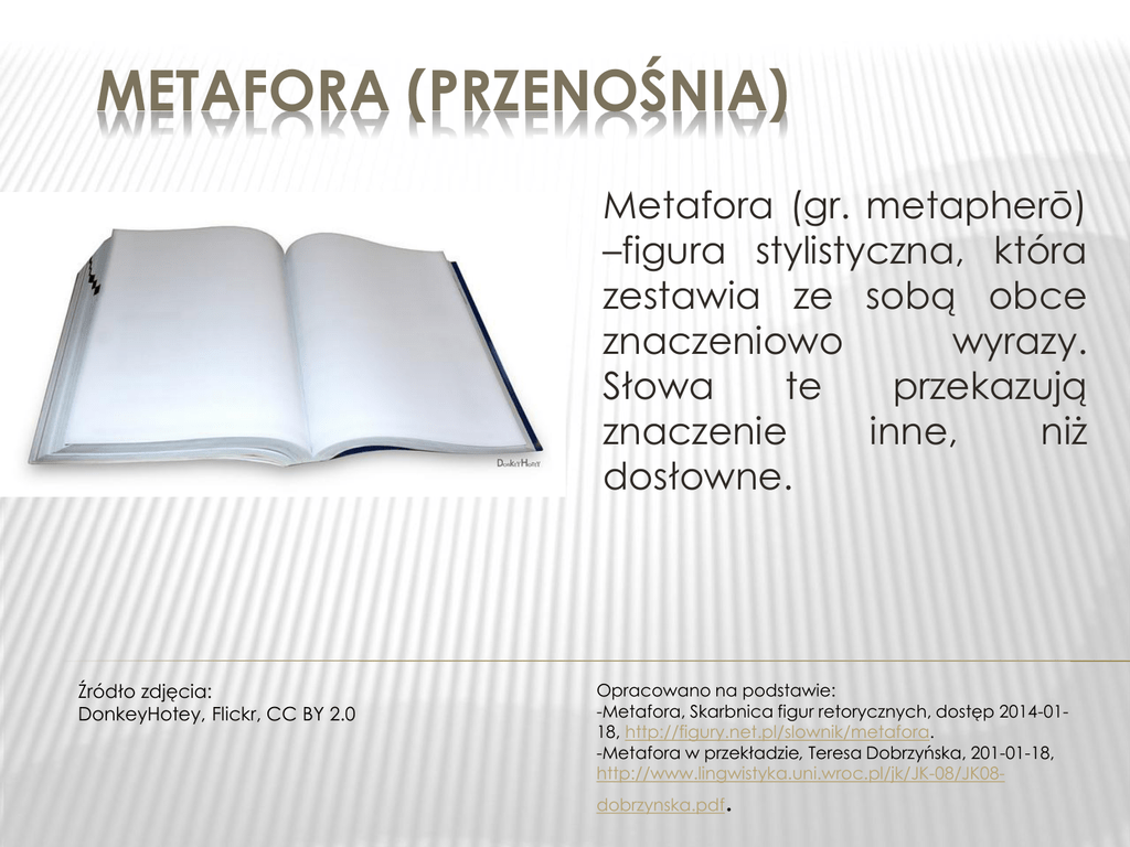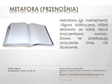 METAFORA (PRZENOŚNIA) Metafora (gr. metapherō) –figura stylistyczna, która zestawia ze sobą obce znaczeniowo wyrazy. Słowa te przekazują znaczenie inne, niż dosłowne. Źródło zdjęcia: DonkeyHotey, Flickr, CC BY 2.0 Opracowano na podstawie: -Metafora, Skarbnica figur retorycznych, dostęp 2014-0118, http://figury.net.pl/slownik/metafora. -Metafora w przekładzie, Teresa Dobrzyńska, 201-01-18, http://www.lingwistyka.uni.wroc.pl/jk/JK-08/JK08dobrzynska.pdf .