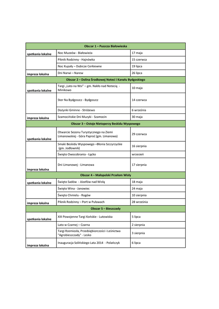 Obszar 1 – Puszcza Białowieska spotkania lokalne impreza lokalna Noc Muzeów - Białowieża 17 maja Piknik Rodzinny - Hajnówka 15 czerwca Noc Kupały – Dubicze Cerkiewne 19 lipca Dni Narwi – Narew 26 lipca Obszar 2 – Dolina Środkowej Noteci i Kanału Bydgoskiego spotkania lokalne impreza lokalna Targi „Lato na Wsi” – gm. Nakło nad Notecią Minikowo 10 maja Ster Na Bydgoszcz - Bydgoszcz 14 czerwca Dożynki Gminne - Stróżewo 6 września Szamocińskie Dni Muzyki - Szamocin 30 maja Obszar 3 – Ostoje Nietoperzy Beskidu Wyspowego spotkania lokalne Otwarcie Sezonu Turystycznego na Ziemi Limanowskiej - Góra Paproć (gm. Limanowa) 29 czerwca Smaki Beskidu Wyspowego –Błonia Szczyrzyckie (gm. Jodłownik) 16 sierpnia Święto Owocobrania - Łącko wrzesień Dni Limanowej - Limanowa 17 sierpnia impreza lokalna Obszar 4 – Małopolski Przełom Wisły spotkania lokalne impreza lokalna Święto Sadów - Józefów nad Wisłą 18 maja Święto Wina - Janowiec 24 maja Święto Chmielu - Rogów 10 sierpnia Piknik Rodzinny – Port w Puławach 28 września Obszar 5 – Bieszczady spotkania lokalne impreza lokalna XIII Powojenne Targi Końskie - Lutowiska 5 lipca Lato w Czarnej – Czarna 2 sierpnia Targi Rzemiosła, Przedsiębiorczości i Leśnictwa "Agrobieszczady" - Lesko 3 sierpnia Inauguracja Solińskiego Lata 2014 - Polańczyk 6 lipca