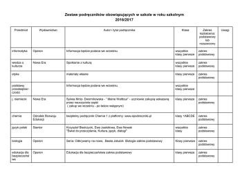 Zestaw podręczników obowiązujących w szkole w roku szkolnym 2016/2017 Przedmiot Wydawnictwo Autor i tytuł podręcznika Klasa Zakres kształcenia: podstawowy lub rozszerzony informatyka Operon Informacja będzie podana we wrześniu wszystkie klasy pierwsze zakres podstawowy wiedza o kulturze Nowa Era Spotkanie z kulturą wszystkie klasy pierwsze zakres podstawowy etyka materiały własne klasy pierwsze zakres podstawowy podstawy przedsiębiorczości Informacja będzie podana we wrześniu wszystkie klasy pierwsze j. niemiecki Nowa Era Sylwia Mróz- Dwornikowska - “ Meine Welttour” - uczniowie zakupią wskazaną przez nauczyciela część ( zakup we wrześniu - po teście wstępnym) klasy pierwsze zakres podstawowy chemia Ośrodek Rozwoju Edukacji bezpłatny podręcznik Chemia 1 z platformy: www.epodreczniki.pl klasy 1ABCDE zakres podstawowy język polski Stentor Krzysztof Biedrzycki, Ewa Jaskółowa, Ewa Nowak "Świat do przeczytania, Kultura, język, dialogi" wszystkie klasy zakres podstawowy biologia Operon Seria: Odkrywamy na nowo, .Beata Jakubik Biologia zakres podstawowy Klasy pierwsze zakres podstawowy edukacja dla bezpieczeńst wa Operon Edukacja dla bezpieczeństwa zakres podstawowy klasy pierwsze zakres podstawowy Uwagi język francuski Wydawnictwo Szkolne PWN język francuski Wydawnictwo Szkolne PWN fizyka Nowa Era M.Braun, W.Śliwa: Odkryć fizykę.Podręcznik dla szkół ponadgimnazjalnych.Zakres podstawowy. 1A, 1B, 1C, 1D, 1E zakres podstawowy matematyka Wydawnictwo Nowa Era Matematyka, klasa 1, podręcznik dla szkół ponadgimnazjalnych-zakres podstawowy i rozszerzony, autorzy: Wojciech Babiański, Lech Chańko, Dorota Ponczek, zbiór zadań dla szkół ponadgimnazjalnych-zakres podstawowy i rozszerzony, autorzy: Joanna Czarnowska, Jolanta Wesołowska, Wojciech Babiański, Lech Chańko Klasy pierwsze zakres rozszerzony historia Nowa Era Poznać przeszłość. Wiek XX, Stanisław Roszak, Jarosław Kłaczkow. wszystkie klasy pierwsze zakres podstawowy wiedza o społeczeństw ie Nowa Era W centrum uwagi, zakres podstawowy, Arkadiusz Janicki, wszystkie klasy pierwsze zakres podstawowy język angielski Podręczniki zostaną ustalone we wrześniu po napisaniu testu poziomującego wszystkie klasy pierwsze religia materiały własne wszystkie klasy pierwsze Oblicza geografii- podręcznik dla szkół ponadgimnazjalnych, zakres podstawowy Radosław Uliszak, Krzysztof Wiedermann wszystkie klasy pierwsze geografia Nowa Era Francofolie express 1 - Magdalena Supryn-Klepcarz, Regine Boutegege Francofolie express 2 - Magdalena Supryn-Klepcarz, Regine Boutegege klasy pierwsze - grupy początku jące, zakres podstawowy klasy pierwsze zakres - grupy podstawowy kontynu ujące naukę po gimnaz jum, zakres podstawowy Nr w wykazie MEN 360/1/20 11/2015