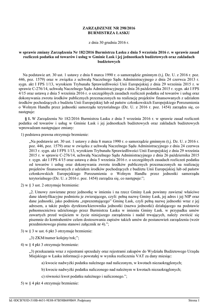 ZARZĄDZENIE NR 298/2016 BURMISTRZA ŁASKU z dnia 30 grudnia 2016 r. w sprawie zmiany Zarządzenia Nr 182/2016 Burmistrza Łasku z dnia 5 września 2016 r. w sprawie zasad rozliczeń podatku od towarów i usług w Gminie Łask i jej jednostkach budżetowych oraz zakładach budżetowych Na podstawie art. 30 ust. 1 ustawy z dnia 8 marca 1990 r. o samorządzie gminnym (t.j. Dz. U. z 2016 r. poz. 446, poz. 1579) oraz w związku z uchwałą Naczelnego Sądu Administracyjnego z dnia 24 czerwca 2013 r. sygn. akt I FPS 1/13, wyrokiem Trybunału Sprawiedliwości Unii Europejskiej z dnia 29 września 2015 r. w sprawie C-276/14, uchwałą Naczelnego Sądu Administracyjnego z dnia 26 października 2015 r. sygn. akt I FPS 4/15 oraz ustawą z dnia 5 września 2016 r. o szczególnych zasadach rozliczeń podatku od towarów i usług oraz dokonywania zwrotu środków publicznych przeznaczonych na realizację projektów finansowanych z udziałem środków pochodzących z budżetu Unii Europejskiej lub od państw członkowskich Europejskiego Porozumienia o Wolnym Handlu przez jednostki samorządu terytorialnego (Dz. U. z 2016 r. poz. 1454) zarządza się, co następuje: § 1. W Zarządzeniu Nr 182/2016 Burmistrza Łasku z dnia 5 września 2016 r. w sprawie zasad rozliczeń podatku od towarów i usług w Gminie Łask i jej jednostkach budżetowych oraz zakładach budżetowych wprowadzam następujące zmiany: 1) podstawa prawna otrzymuje brzmienie: „Na podstawie art. 30 ust. 1 ustawy z dnia 8 marca 1990 r. o samorządzie gminnym (t.j. Dz. U. z 2016 r. poz. 446, poz. 1579) oraz w związku z uchwałą Naczelnego Sądu Administracyjnego z dnia 24 czerwca 2013 r. sygn. akt I FPS 1/13, wyrokiem Trybunału Sprawiedliwości Unii Europejskiej z dnia 29 września 2015 r. w sprawie C-276/14, uchwałą Naczelnego Sądu Administracyjnego z dnia 26 października 2015 r. sygn. akt I FPS 4/15 oraz ustawą z dnia 5 września 2016 r. o szczególnych zasadach rozliczeń podatku od towarów i usług oraz dokonywania zwrotu środków publicznych przeznaczonych na realizację projektów finansowanych z udziałem środków pochodzących z budżetu Unii Europejskiej lub od państw członkowskich Europejskiego Porozumienia o Wolnym Handlu przez jednostki samorządu terytorialnego (Dz. U. z 2016 r. poz. 1454) zarządza się, co następuje:”; 2) w § 3 ust. 2 otrzymuje brzmienie: „2. Umowy zawierane przez jednostkę w imieniu i na rzecz Gminy Łask powinny zawierać właściwe dane identyfikacyjne podmiotu je zwierającego, czyli: pełną nazwę Gminy Łask, jej adres i jej NIP oraz dane jednostki, jako podmiotu „reprezentującego” Gminę Łask, czyli pełną nazwę jednostki wraz z jej adresem, a także podpis dyrektora/kierownika jednostki (nazwa jednostki) działającego na podstawie pełnomocnictwa udzielonego przez Burmistrza Łasku w imieniu Gminy Łask. w przypadku umów zawartych przed wejściem w życie niniejszego zarządzenia i nadal trwających, należy zwrócić się pisemnie do kontrahentów celem dostosowania zapisów takich umów do postanowień zarządzenia (wzór przedmiotowego pisma stanowi załącznik nr 4).”; 3) w § 3 w ust. 6 pkt 3 otrzymuje brzmienie: „3) ZKM/numer kolejny/rok;”; 4) w § 4 pkt 3 otrzymuje brzmienie: „3) przekazania wraz z rejestrami sprzedaży oraz rejestrami zakupów do Wydziału Budżetowego Urzędu Miejskiego w Łasku informacji o powstałej w wyniku rozliczenia VAT za dany miesiąc: a) kwocie nadwyżki podatku należnego nad naliczonym, w kwotach niezaokrąglonych; b) kwocie nadwyżki podatku naliczonego nad należnym w kwotach niezaokrąglonych; c) równości kwot podatku należnego i naliczonego.”; 5) w § 4 pkt 4 otrzymuje brzmienie: Id: 0DCB703D-510B-4651-9E88-87B58B689B69. Podpisany Strona 1 „4) przekazania obliczonej nadwyżki VAT należnego nad naliczonym, która jest wynikiem rozliczenia podatku przez jednostkę za dany miesiąc do 15-go dnia następnego miesiąca na konto Gminy Łask; w treści przelewu należy ująć zapis: "nadwyżka VAT należnego nad naliczonym za miesiąc ___ ______________ (nazwa jednostki)". W przypadku powstania w stosunku do jednostki, nadwyżki VAT naliczonego nad należnym, Gmina Łask przelewa tę kwotę na konto jednostki w terminie 60 dni od momentu złożenia przez Gminę Łask deklaracji VAT za dany miesiąc.”; 6) w § 4 pkt 7 otrzymuje brzmienie: „7) przechowywania zgodnie z przepisami prawa podatkowego wystawionych przez daną jednostkę dokumentów VAT w zakresie dokonanej sprzedaży oraz faktur VAT dokumentujących nabycie przez nią towarów i usług, a także ich niezwłoczne udostępnianie Wydziałowi Budżetowemu Urzędu Miejskiego w Łasku na żądanie Gminy Łask;”; 7) dodaje się § 9 o brzmieniu: „§ 9. W przypadku, gdy określone okoliczności związane z rozliczaniem VAT w jednostkach będą wymagały złożenia przez Gminę Łask oświadczeń lub jakichkolwiek innych wyjaśnień czy też potwierdzeń (w szczególności przed organami podatkowymi), na żądanie Gminy Łask skierowane do dyrektorów/kierowników jednostek, ci niezwłocznie zweryfikują odpowiednie informacje źródłowe i przedstawią odpowiednie oświadczenia, wyjaśnienia, potwierdzenia Gminie Łask.”; 8) Załącznik Nr 2 do Zarządzenia Nr 182/2016 Burmistrza Łasku z dnia 5 września 2016 r. otrzymuje brzmienie jak w Załączniku Nr 1 do niniejszego zarządzenia; 9) Załącznik Nr 3 do Zarządzenia Nr 182/2016 Burmistrza Łasku z dnia 5 września 2016 r. otrzymuje brzmienie jak w Załączniku Nr 2 do niniejszego zarządzenia; 10) dotychczasowy § 9 staje się § 10: „§ 10. Zarządzenie wchodzi w życie z dniem podpisania z mocą obowiązującą od dnia 1 stycznia 2017 roku.”. Burmistrz Łasku Gabriel Szkudlarek Id: 0DCB703D-510B-4651-9E88-87B58B689B69. Podpisany Strona 2 Załącznik Nr 1 do Zarządzenia Nr 298/2016 Burmistrza Łasku z dnia 30 grudnia 2016 r. Gmina Łask/……………………….………………./………