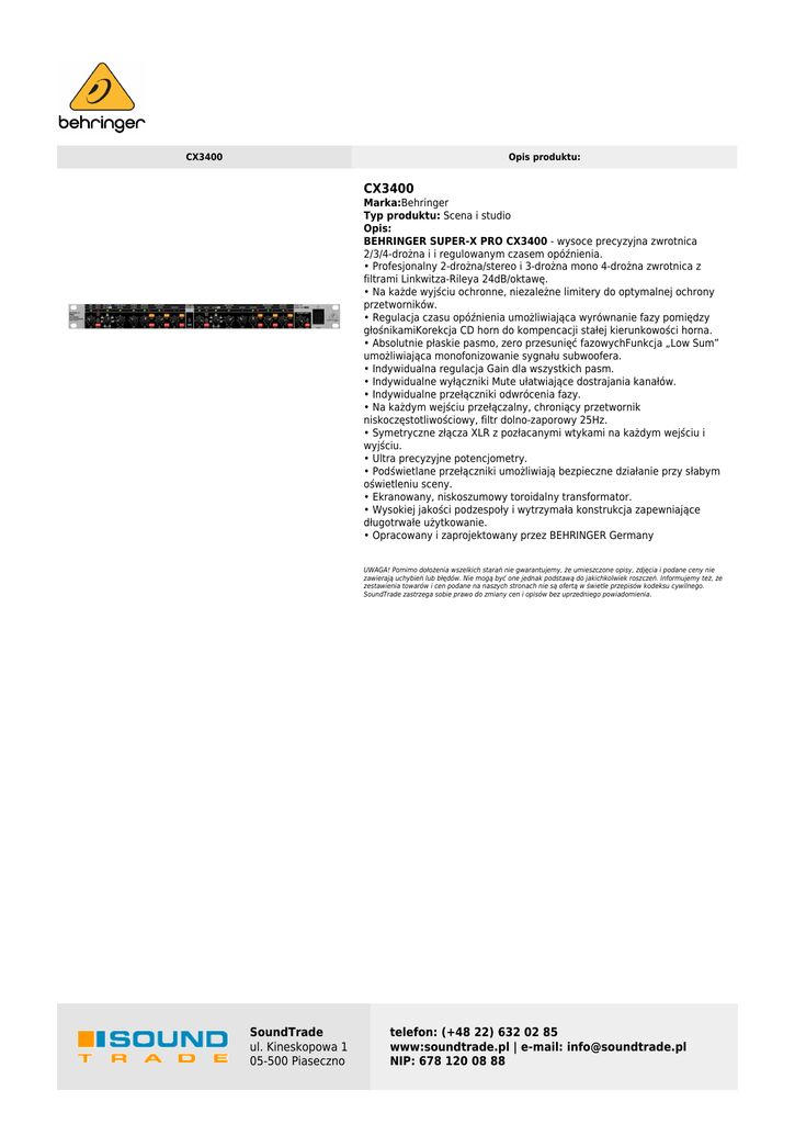 CX3400 Opis produktu: CX3400 Marka:Behringer Typ produktu: Scena i studio Opis: BEHRINGER SUPER-X PRO CX3400 - wysoce precyzyjna zwrotnica 2/3/4-drożna i i regulowanym czasem opóźnienia. • Profesjonalny 2-drożna/stereo i 3-drożna mono 4-drożna zwrotnica z filtrami Linkwitza-Rileya 24dB/oktawę. • Na każde wyjściu ochronne, niezależne limitery do optymalnej ochrony przetworników. • Regulacja czasu opóźnienia umożliwiająca wyrównanie fazy pomiędzy głośnikamiKorekcja CD horn do kompencacji stałej kierunkowości horna. • Absolutnie płaskie pasmo, zero przesunięć fazowychFunkcja „Low Sum” umożliwiająca monofonizowanie sygnału subwoofera. • Indywidualna regulacja Gain dla wszystkich pasm. • Indywidualne wyłączniki Mute ułatwiające dostrajania kanałów. • Indywidualne przełączniki odwrócenia fazy. • Na każdym wejściu przełączalny, chroniący przetwornik niskoczęstotliwościowy, filtr dolno-zaporowy 25Hz. • Symetryczne złącza XLR z pozłacanymi wtykami na każdym wejściu i wyjściu. • Ultra precyzyjne potencjometry. • Podświetlane przełączniki umożliwiają bezpieczne działanie przy słabym oświetleniu sceny. • Ekranowany, niskoszumowy toroidalny transformator. • Wysokiej jakości podzespoły i wytrzymała konstrukcja zapewniające długotrwałe użytkowanie. • Opracowany i zaprojektowany przez BEHRINGER Germany UWAGA! Pomimo dołożenia wszelkich starań nie gwarantujemy, że umieszczone opisy, zdjęcia i podane ceny nie zawierają uchybień lub błędów. Nie mogą być one jednak podstawą do jakichkolwiek roszczeń. Informujemy też, że zestawienia towarów i cen podane na naszych stronach nie są ofertą w świetle przepisów kodeksu cywilnego. SoundTrade zastrzega sobie prawo do zmiany cen i opisów bez uprzedniego powiadomienia. SoundTrade ul. Kineskopowa 1 05-500 Piaseczno telefon: (+48 22) 632 02 85 www:soundtrade.pl | e-mail: [email protected] NIP: 678 120 08 88
