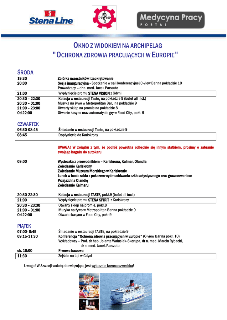 OKNO Z WIDOKIEM NA ARCHIPELAG "OCHRONA ZDROWIA PRACUJĄCYCH W EUROPIE" ŚRODA 19:30 20:00 21:00 20:30 – 22:30 20:30 – 01:00 21:00 – 23:00 Od 22:00 Zbiórka uczestników i zaokrętowanie Sesja inauguracyjna - Spotkanie w sali konferencyjnej C-view Bar na pokładzie 10 Prowadzący – dr n. med. Jacek Parszuto Wypłynięcie promu STENA VISION z Gdyni Kolacja w restauracji Taste, na pokładzie 9 (bufet all incl.) Muzyka na żywo w Metropolitan Bar, na pokładzie 9 Otwarty sklep na promie na pokładzie 8 Otwarte kasyno oraz automaty do gry w Food City, pokł. 9 CZWARTEK 06:30-08:45 08:45 Śniadanie w restauracji Taste, na pokładzie 9 Dopłynięcie do Karlskrony UWAGA! W związku z tym, że podróż powrotna odbędzie się innym statkiem, prosimy o zabranie swojego bagażu do autokaru 09:00 Wycieczka z przewodnikiem – Karlskrona, Kalmar, Olandia Zwiedzanie Karlskrony Zwiedzanie Muzeum Morskiego w Karlskronie Lunch w hucie szkła z pokazem wydmuchiwania szkła artystycznego oraz grawerowaniem Przejazd na Olandię Zwiedzanie Kalmaru 20:30-22:30 21:00 20:30 – 23:30 21:00 – 01:00 Od 22:00 Kolacja w restauracji TASTE, pokł.9 (bufet all incl.) Wypłynięcie promu STENA SPIRIT z Karlskrony Otwarty sklep na promie, pokł.8 Muzyka na żywo w Metropolitan Bar na pokładzie 9 Otwarte kasyno w Food City, pokł.9 PIĄTEK 07:00- 8:45 09:15-11:30 ok. 10:00 11:30 Śniadanie w restauracji TASTE, na pokładzie 9 Konferencja "Ochrona zdrowia pracujących w Europie" (C-view Bar na pokł. 10) Wykładowcy – Prof. dr hab. Jolanta Walusiak-Skorupa, dr n. med. Marcin Rybacki, dr n. med. Jacek Parszuto Przerwa kawowa Zejście na ląd w Gdyni Uwaga! W Szwecji walutą obowiązującą jest wyłącznie korona szwedzka!