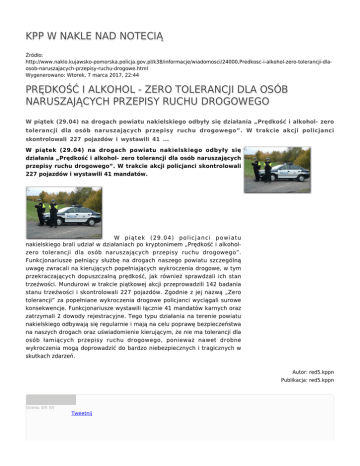 KPP W NAKLE NAD NOTECIĄ Źródło: http://www.naklo.kujawsko-pomorska.policja.gov.pl/k38/informacje/wiadomosci/24000,Predkosc-i-alkohol-zero-tolerancji-dlaosob-naruszajacych-przepisy-ruchu-drogowe.html Wygenerowano: Wtorek, 7 marca 2017, 22:44 PRĘDKOŚĆ I ALKOHOL - ZERO TOLERANCJI DLA OSÓB NARUSZAJĄCYCH PRZEPISY RUCHU DROGOWEGO W piątek (29.04) na drogach powiatu nakielskiego odbyły się działania „Prędkość i alkohol- zero tolerancji dla osób naruszających przepisy ruchu drogowego”. W trakcie akcji policjanci skontrolowali 227 pojazdów i wystawili 41 ... W piątek (29.04) na drogach powiatu nakielskiego odbyły się działania „Prędkość i alkohol- zero tolerancji dla osób naruszających przepisy ruchu drogowego”. W trakcie akcji policjanci skontrolowali 227 pojazdów i wystawili 41 mandatów. W piątek (29.04) policjanci powiatu nakielskiego brali udział w działaniach po kryptonimem „Prędkość i alkoholzero tolerancji dla osób naruszających przepisy ruchu drogowego”. Funkcjonariusze pełniący służbę na drogach naszego powiatu szczególną uwagę zwracali na kierujących popełniających wykroczenia drogowe, w tym przekraczających dopuszczalną prędkość, jak również sprawdzali ich stan trzeźwości. Mundurowi w trakcie piątkowej akcji przeprowadzili 142 badania stanu trzeźwości i skontrolowali 227 pojazdów. Zgodnie z jej nazwą „Zero tolerancji” za popełniane wykroczenia drogowe policjanci wyciągali surowe konsekwencje. Funkcjonariusze wystawili łącznie 41 mandatów karnych oraz zatrzymali 2 dowody rejestracyjne. Tego typu działania na terenie powiatu nakielskiego odbywają się regularnie i mają na celu poprawę bezpieczeństwa na naszych drogach oraz uświadomienie kierującym, że nie ma tolerancji dla osób łamiących przepisy ruchu drogowego, ponieważ nawet drobne wykroczenia mogą doprowadzić do bardzo niebezpiecznych i tragicznych w skutkach zdarzeń. Autor: red5.kppn Publikacja: red5.kppn Ocena: 0/5 (0) Tweetnij