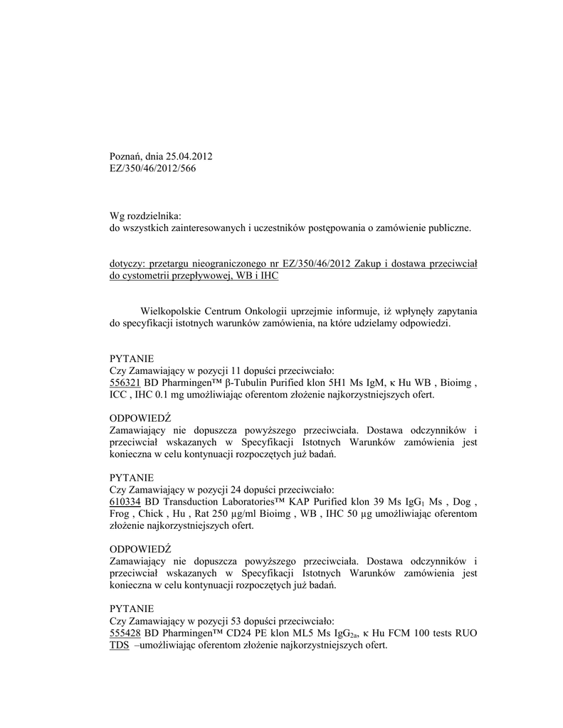 Poznań, dnia 25.04.2012 EZ/350/46/2012/566 Wg rozdzielnika: do wszystkich zainteresowanych i uczestników postępowania o zamówienie publiczne. dotyczy: przetargu nieograniczonego nr EZ/350/46/2012 Zakup i dostawa przeciwciał do cystometrii przepływowej, WB i IHC Wielkopolskie Centrum Onkologii uprzejmie informuje, iŜ wpłynęły zapytania do specyfikacji istotnych warunków zamówienia, na które udzielamy odpowiedzi. PYTANIE Czy Zamawiający w pozycji 11 dopuści przeciwciało: 556321 BD Pharmingen™ β-Tubulin Purified klon 5H1 Ms IgM, κ Hu WB , Bioimg , ICC , IHC 0.1 mg umoŜliwiając oferentom złoŜenie najkorzystniejszych ofert. ODPOWIEDŹ Zamawiający nie dopuszcza powyŜszego przeciwciała. Dostawa odczynników i przeciwciał wskazanych w Specyfikacji Istotnych Warunków zamówienia jest konieczna w celu kontynuacji rozpoczętych juŜ badań. PYTANIE Czy Zamawiający w pozycji 24 dopuści przeciwciało: 610334 BD Transduction Laboratories™ KAP Purified klon 39 Ms IgG1 Ms , Dog , Frog , Chick , Hu , Rat 250 µg/ml Bioimg , WB , IHC 50 µg umoŜliwiając oferentom złoŜenie najkorzystniejszych ofert. ODPOWIEDŹ Zamawiający nie dopuszcza powyŜszego przeciwciała. Dostawa odczynników i przeciwciał wskazanych w Specyfikacji Istotnych Warunków zamówienia jest konieczna w celu kontynuacji rozpoczętych juŜ badań. PYTANIE Czy Zamawiający w pozycji 53 dopuści przeciwciało: 555428 BD Pharmingen™ CD24 PE klon ML5 Ms IgG2a, κ Hu FCM 100 tests RUO TDS –umoŜliwiając oferentom złoŜenie najkorzystniejszych ofert. ODPOWIEDŹ TAK. PYTANIE Czy Zamawiający w pozycji 93 dopuści przeciwciało: 553141 BD Pharmingen™ Mouse Fc Block™ CD16/CD32 Purified klon 2.4G2 Rat IgG2b, κ Ms FCM 0.1 mg –umoŜliwiając oferentom złoŜenie najkorzystniejszych ofert. ODPOWIEDŹ TAK. PYTANIE Czy Zamawiający w pozycji 95 dopuści przeciwciało: 559763 BD Pharmingen™ Annexin V : PE Apoptosis Detection Kit I Annexin V-PE, 7AAD, and Annexin V Binding Buffer Kit FCM 100 tests RUO –umoŜliwiając oferentom złoŜenie najkorzystniejszych ofert. ODPOWIEDŹ TAK. PYTANIE Czy Zamawiający w pozycji 96 dopuści przeciwciało: 551102 BD Pharmingen™ c-Myc Purified klon 9E10 Ms IgG1 Hu WB 150 µg RUO – umoŜliwiając oferentom złoŜenie najkorzystniejszych ofert. PYTANIE Czy Zamawiający w pozycji 98 dopuści przeciwciało: 556430 BD Pharmingen™ p21 Purified klon SX118 Ms IgG1 Hu , Ms , Rat IF , WB , IP , IHC(Fr) , IHC(P) 0.1 mg RUO –umoŜliwiając oferentom złoŜenie najkorzystniejszych ofert. ODPOWIEDŹ TAK. PYTANIE Czy Zamawiający w pozycji 102 i 113 dopuści przeciwciało: 550989 BD Pharmingen™ CD44 PE klon 515 Ms IgG1, κ Hu FCM 100 tests – umoŜliwiając oferentom złoŜenie najkorzystniejszych ofert. ODPOWIEDŹ Zamawiający nie dopuszcza powyŜszego przeciwciała. Dostawa odczynników i przeciwciał wskazanych w Specyfikacji Istotnych Warunków zamówienia jest konieczna w celu kontynuacji rozpoczętych juŜ badań. PYTANIE Czy Zamawiający w pozycji 103 dopuści: 554657 BD Pharmingen™ Stain Buffer (BSA) FCM 500 ml RUO –umoŜliwiając oferentom złoŜenie najkorzystniejszych ofert. ODPOWIEDŹ Zamawiający nie dopuszcza powyŜszego przeciwciała. Dostawa odczynników i przeciwciał wskazanych w Specyfikacji Istotnych Warunków zamówienia jest konieczna w celu kontynuacji rozpoczętych juŜ badań. PYTANIE Czy Zamawiający w pozycji 110 dopuści: 561908 BD Pharmingen™ Hoechst 33342 Solution IF , Bioimg 1.0 mg RUO – umoŜliwiając oferentom złoŜenie najkorzystniejszych ofert. ODPOWIEDŹ TAK. PYTANIE Czy Zamawiający w pozycji 114 dopuści przeciwciało: 555428 BD Pharmingen™ CD24 PE klon ML5 Ms IgG2a, κ Hu FCM 100 testsumoŜliwiając oferentom złoŜenie najkorzystniejszych ofert. ODPOWIEDŹ Zamawiający nie dopuszcza powyŜszego przeciwciała. Dostawa odczynników i przeciwciał wskazanych w Specyfikacji Istotnych Warunków zamówienia jest konieczna w celu kontynuacji rozpoczętych juŜ badań. PYTANIE Czy Zamawiający w pozycji 108 dopuści przeciwciało: 552311 BD IMagnet™ Cell Separation Magnet - umoŜliwiając oferentom złoŜenie najkorzystniejszych ofert. ODPOWIEDŹ Zamawiający nie dopuszcza powyŜszego przeciwciała. Dostawa odczynników i przeciwciał wskazanych w Specyfikacji Istotnych Warunków zamówienia jest konieczna w celu kontynuacji rozpoczętych juŜ badań. PYTANIE Czy Zamawiający wydzieli następujące pozycje: - w przypadku udzielenia pozytywnej odpowiedzi, na któreś z powyŜszych oraz przeciwciała: - lp. 10, anti-HLA-A,B,C (APC-conjugated), klon G46-2.6 - lp. 12, anti-GFAP, klon 52 - lp. 13, anti-beta catenin, klon 14 - lp. 14, anti-MyoD, klon MoAb 5.8A - lp. 15, anti-nestin, klon Rat401 - lp. 16, anti-tyrosine hydroxylase, klon TOHA1 - lp. 18, anti-Notch1, klon mN1A - lp. 30, alexa fluor 647 mouse anti-Sox2, klon 245610 - lp. 36, PE mouse anti-human Tra-1-60 antigen, klon Tra-1-60 - lp. 37, Alexa fluor 647 mouse IgG1 k isotype control, klon MOPC-21 - lp. 38, PE mouse IgG1 k isotype control, klon MOPC-21 - lp. 39, PE mouse IgM, k isotype control, klon G155-228 - lp. 42, Human pluripotent stem cell sorting and analysis kit - lp. 43, Human pluripotent stem cell transcription factor analysis kit - lp. 44, Mouse pluripotent stem cell transcription factor analysis kit - lp. 52, HNF-1b, klon 25 - lp. 53, PE Mouse Anti-Human CD24, klon Mouse IgG2a, κ/ML5 - lp. 54, anty-beta tubulina, klon 5H1 - lp. 55, APC Mouse Anti-Human CD44, klon G44-26 (also known as C26) - lp. 56, APC Mouse IgG2b κ Isotype Control, klon 27-35 - lp. 58, PE Mouse IgG2b κ Isotype Control, klon G155-178 - lp. 59, Purified mouse anti-GFAP, klon 52/GFAP - lp. 70, Basement Membrane Matrix, Growth Factor Reduced (GFR), Phenol Red-free - lp. 79, FACS Flow Sheath Fluid - lp. 96, BD Cytofix/Cytoperm Plus Fixation/Permeabilization Solution Kit with GolgiStop™ - lp. 97, mouse anti-human c-myc, WB, 150 ug - lp. 98, mouse anti-p21, WB, 0,1 mg - lp. 104, FACS Flow Sheath F