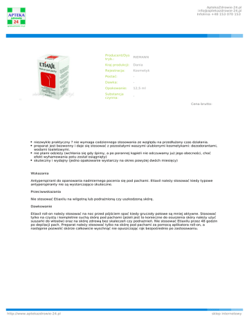 AptekaZdrowie-24.pl [email protected] Infolinia +48 153 070 153 Producent/Dys tryb.: RIEMANN Kraj produkcji: Dania Rejestracja: Kosmetyk Postać: - Dawka: - Opakowanie: 12,5 ml Substancja czynna: Cena brutto: niezwykle praktyczny ? nie wymaga codziennego stosowania ze względu na przedłużony czas działania. preparat jest bezwonny i daje się stosować z pozostałymi waszymi ulubionymi kosmetykami: dezodorantami, wodami toaletowymi. nie plami odzieży (wchłania się gdy śpimy, a po porannej kąpieli nie odczuwamy już jego obecności, choć efekt wyhamowania potu został osiągnięty) skuteczny i wydajny (jedno opakowanie wystarczy na okres powyżej dwóch miesięcy) Wskazania Antyperspirant do opanowania nadmiernego pocenia się pod pachami. Etiaxil należy stosować kiedy typowe antyperspiranty nie są wystarczająco skuteczne. Przeciwwskazania Nie stosować Etiaxilu na wilgotną lub podrażnioną czy uszkodzoną skórę. Dawkowanie Etiaxil roll-on należy stosować na noc przed pójściem spać kiedy gruczoły potowe są mniej aktywne. Stosować tylko na czystą i kompletnie suchą skórę pod pachami (jeżeli jest to konieczne do osuszenia skóry należy użyć suszarki do włosów) oraz na skórę zdrową bez skaleczeń czy podrażnień. Nie stosować Etiaxilu przez 48 godzin po depilacji pach. Preparat należy stosować tylko na skórę pod pachami za pomocą aplikatora roll-on, a następnie pozwolić skórze całkowicie wyschnąć nie opuszczając rąk bezpośrednio po zastosowaniu. http://www.aptekazdrowie-24.pl sklep internetowy