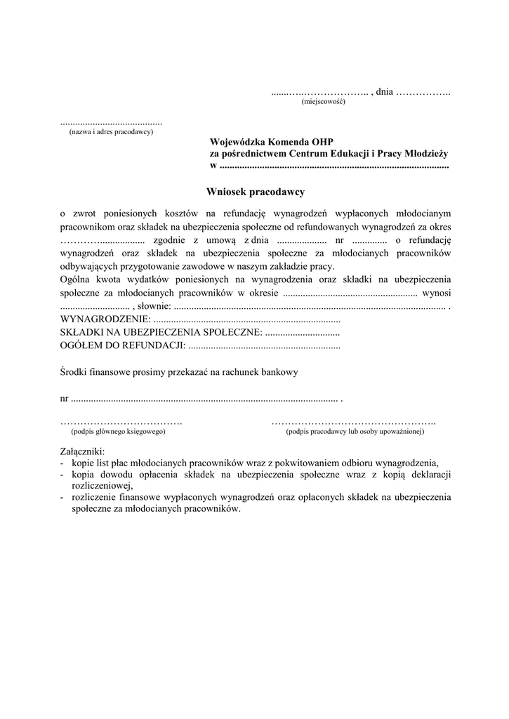 Załącznik nr 5 WZÓR .......…..……………….. , dnia …………….. (miejscowość) ......................................... (nazwa i adres pracodawcy) Wojewódzka Komenda OHP za pośrednictwem Centrum Edukacji i Pracy Młodzieży w ............................................................................................ Wniosek pracodawcy o zwrot poniesionych kosztów na refundację wynagrodzeń wypłaconych młodocianym pracownikom oraz składek na ubezpieczenia społeczne od refundowanych wynagrodzeń za okres ………….................. zgodnie z umową z dnia .................... nr .............. o refundację wynagrodzeń oraz składek na ubezpieczenia społeczne za młodocianych pracowników odbywających przygotowanie zawodowe w naszym zakładzie pracy. Ogólna kwota wydatków poniesionych na wynagrodzenia oraz składki na ubezpieczenia społeczne za młodocianych pracowników w okresie ...................................................... wynosi ............................ , słownie: ............................................................................................................. . WYNAGRODZENIE: ........................................................................... SKŁADKI NA UBEZPIECZENIA SPOŁECZNE: .............................. OGÓŁEM DO REFUNDACJI: ............................................................. Środki finansowe prosimy przekazać na rachunek bankowy nr ........................................................................................................... . ………………………………. (podpis głównego księgowego) ………………………………………….. (podpis pracodawcy lub osoby upoważnionej) Załączniki: - kopie list płac młodocianych pracowników wraz z pokwitowaniem odbioru wynagrodzenia, - kopia dowodu opłacenia składek na ubezpieczenia społeczne wraz z kopią deklaracji rozliczeniowej, - rozliczenie finansowe wypłaconych wynagrodzeń oraz opłaconych składek na ubezpieczenia społeczne za młodocianych pracowników. Rok nauki (imię i nazwisko osoby sporządzającej) ............................................................. Słownie: ..................................................... Razem Lp. Miesiąc Imię i nazwisko młodocianego pracownika Zawód Stawka miesięczna brutto Wynagrodzenia chorobowe wypłacone za dany miesiąc (podpis pracodawcy lub osoby upoważnionej) Składka ZUS .............................................................. Kwota wypłaconych wynagrodzeń osobowych brutto w miesiącu Kwota do refundacji ogółem Rozliczenie finansowe wypłaconych wynagrodzeń oraz opłaconych składek na ubezpieczenia społeczne za młodocianych pracowników