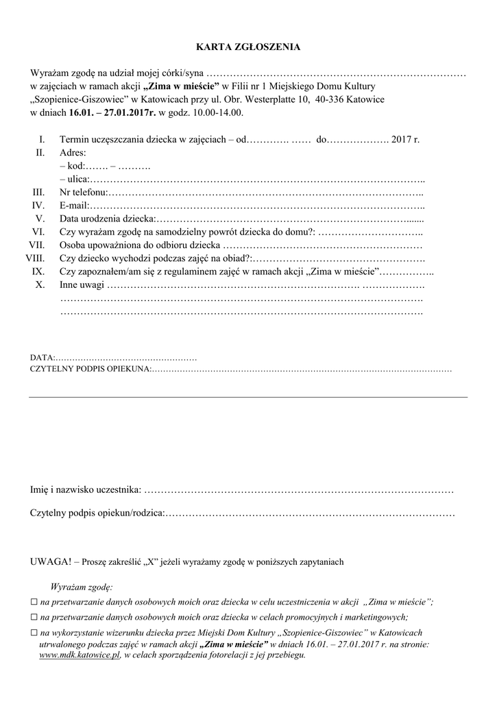 KARTA ZGŁOSZENIA Wyrażam zgodę na udział mojej córki/syna …………………………………………………………………… w zajęciach w ramach akcji „Zima w mieście” w Filii nr 1 Miejskiego Domu Kultury „Szopienice-Giszowiec” w Katowicach przy ul. Obr. Westerplatte 10, 40-336 Katowice w dniach 16.01. – 27.01.2017r. w godz. 10.00-14.00. I. II. III. IV. V. VI. VII. VIII. IX. X. Termin uczęszczania dziecka w zajęciach – od…………. …… do………………. 2017 r. Adres: – kod:……. – ………. – ulica:……………………………………………………………………………………….. Nr telefonu:………………………………………………………………………………….. E-mail:……………………………………………………………………………………….. Data urodzenia dziecka:…………………………………………………………………....... Czy wyrażam zgodę na samodzielny powrót dziecka do domu?: ………………………….. Osoba upoważniona do odbioru dziecka …………………………………………………… Czy dziecko wychodzi podczas zajęć na obiad?:……………………………………………. Czy zapoznałem/am się z regulaminem zajęć w ramach akcji „Zima w mieście”…………….. Inne uwagi …………………………………………………………………. ………………. ………………………………………………………………………………………………. ………………………………………………………………………………………………. DATA:…………………………………………… CZYTELNY PODPIS OPIEKUNA:……………………………………………………………………………………………… Imię i nazwisko uczestnika: ………………………………………………………………………………… Czytelny podpis opiekun/rodzica:…………………………………………………………………………… UWAGA! – Proszę zakreślić „X” jeżeli wyrażamy zgodę w poniższych zapytaniach Wyrażam zgodę: □ na przetwarzanie danych osobowych moich oraz dziecka w celu uczestniczenia w akcji „Zima w mieście”; □ na przetwarzanie danych osobowych moich oraz dziecka w celach promocyjnych i marketingowych; □ na wykorzystanie wizerunku dziecka przez Miejski Dom Kultury „Szopienice-Giszowiec” w Katowicach utrwalonego podczas zajęć w ramach akcji „Zima w mieście” w dniach 16.01. – 27.01.2017 r. na stronie: www.mdk.katowice.pl, w celach sporządzenia fotorelacji z jej przebiegu.